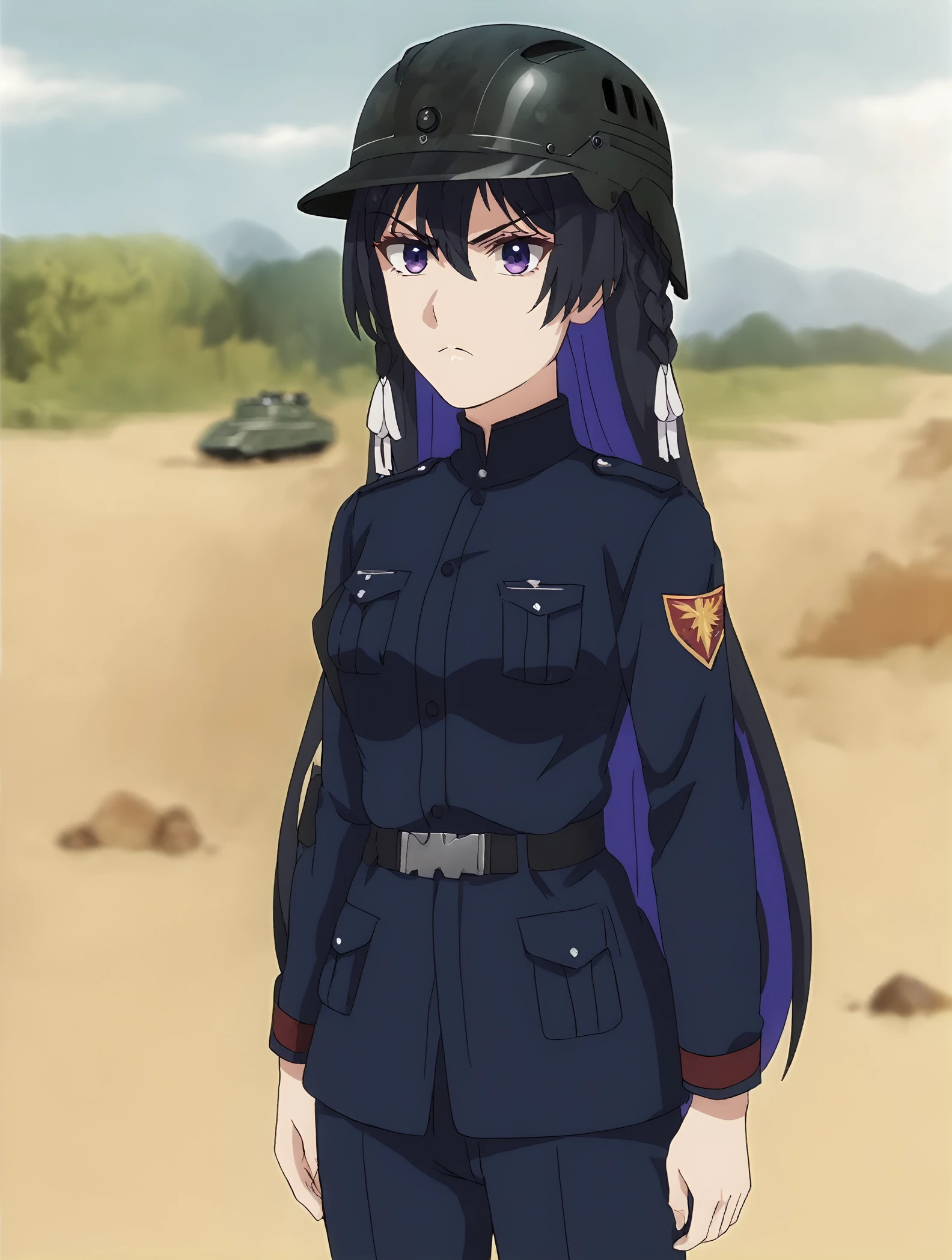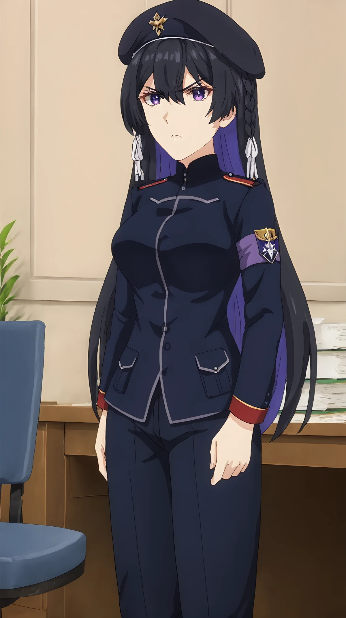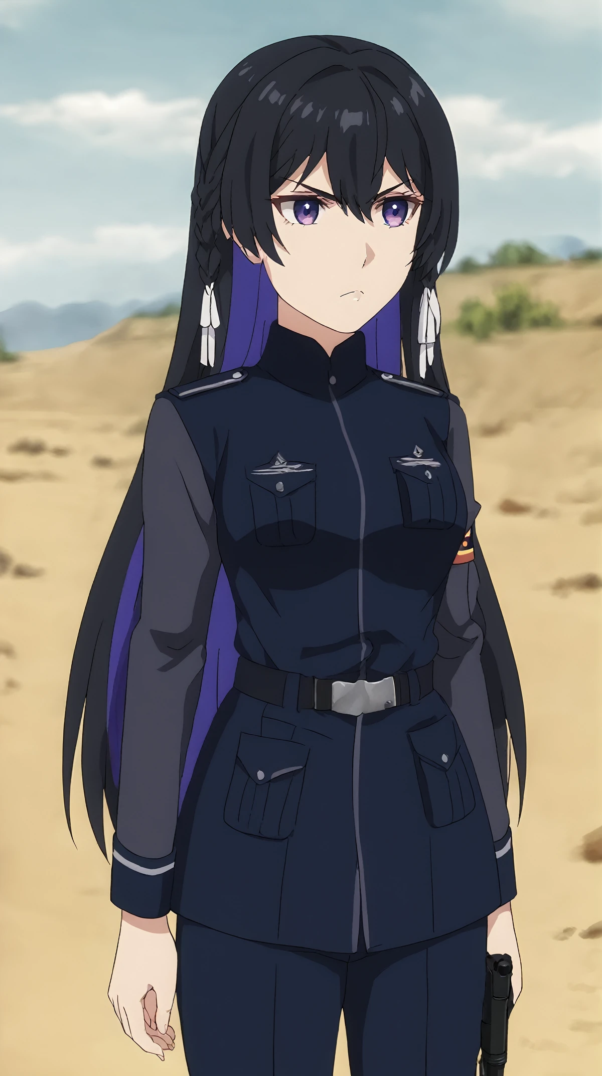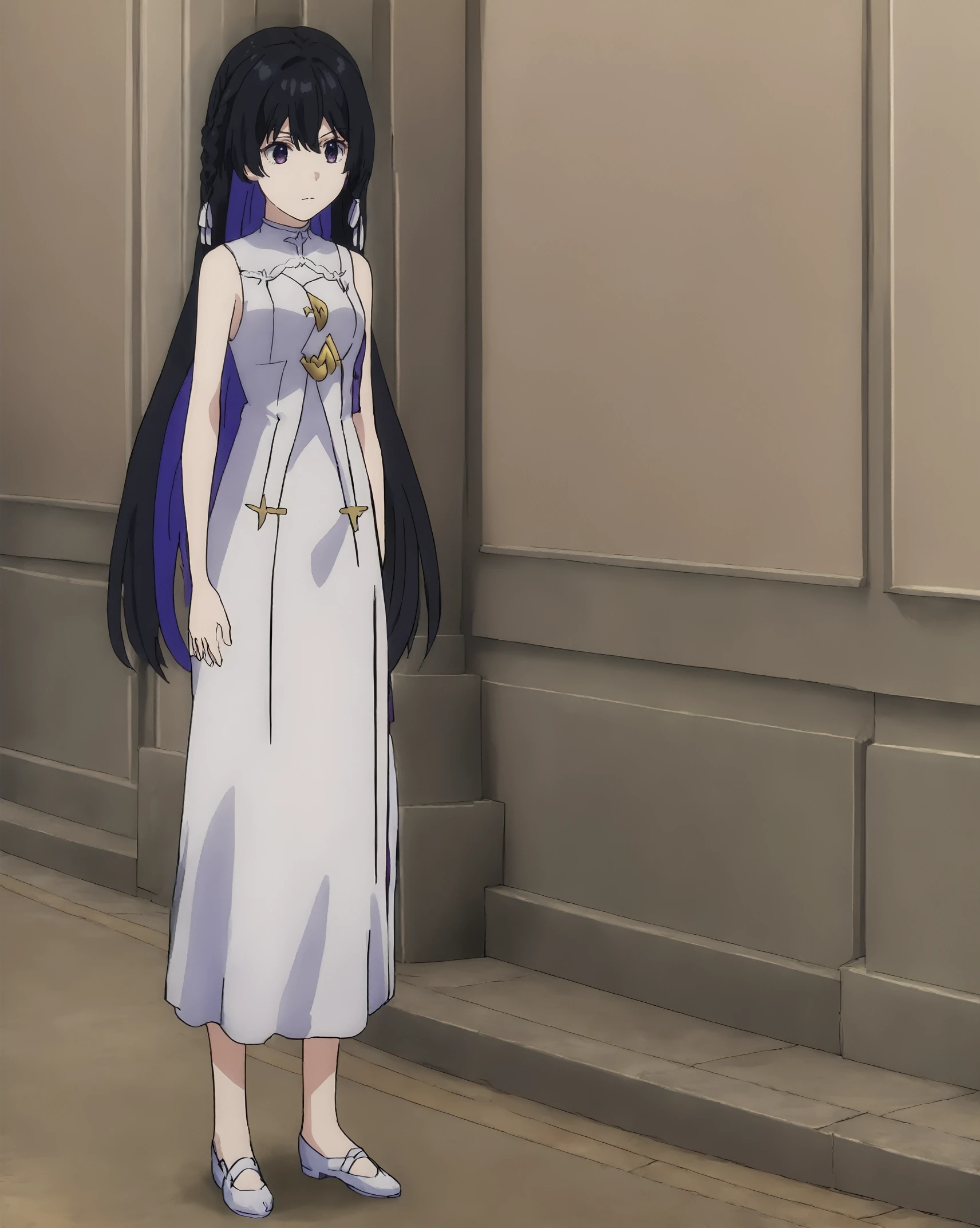 black hair, purple eyes, braid, white hair tie,