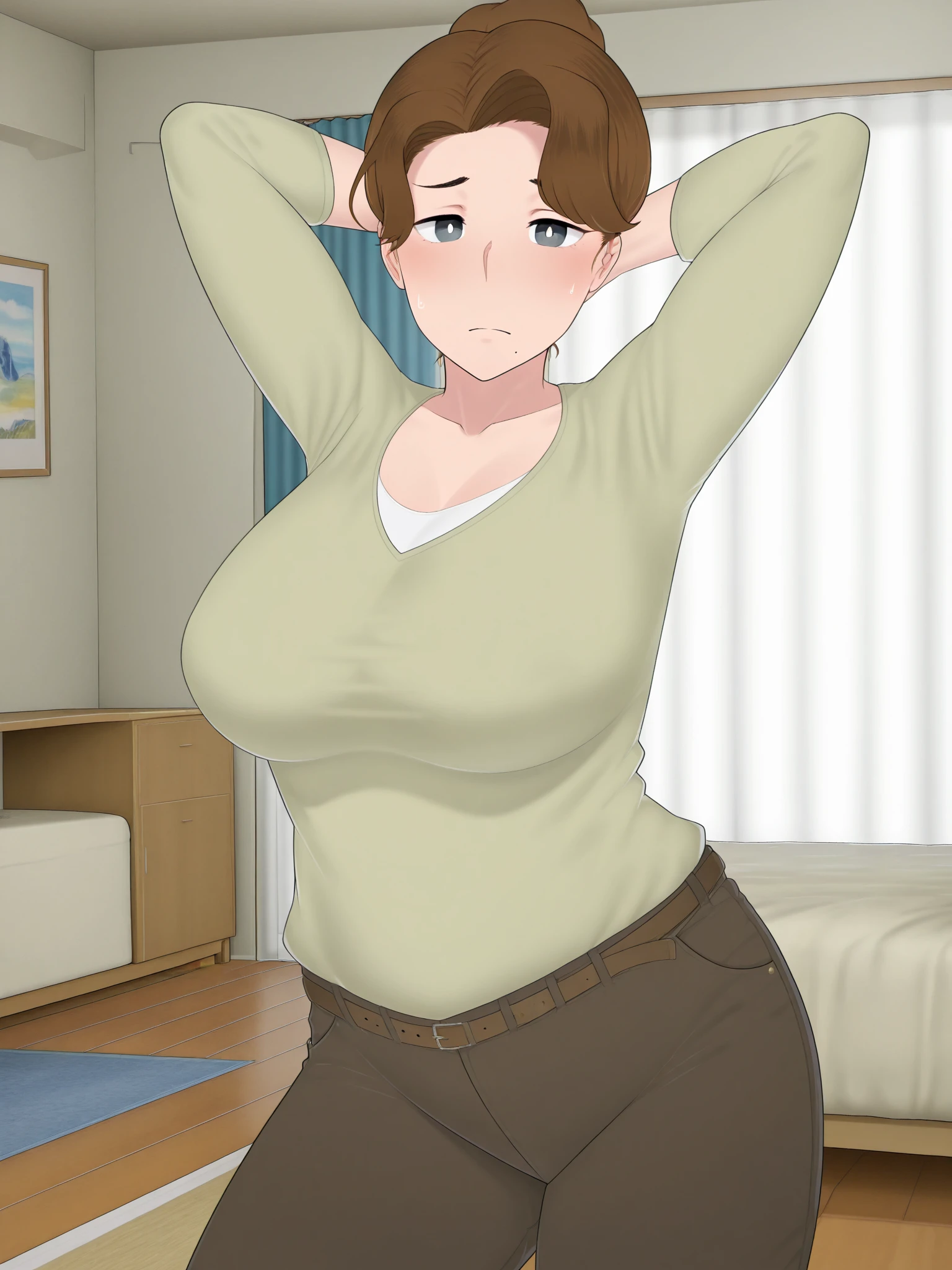 azusaillustrious, brown hair, hair bun, single hair bun, mature female, grey eyes, white pupils