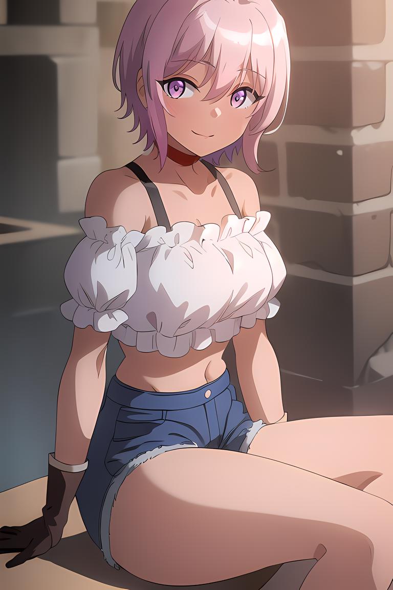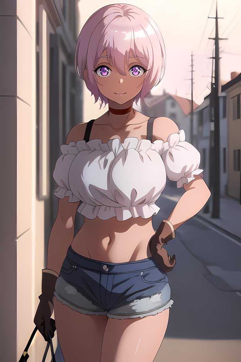 Trigger words for casual outfit: Tanya, casual outfit, short pink hair, white top, blue hot-pants, (for more look in my samples of her)