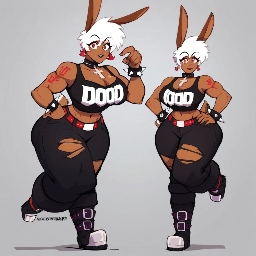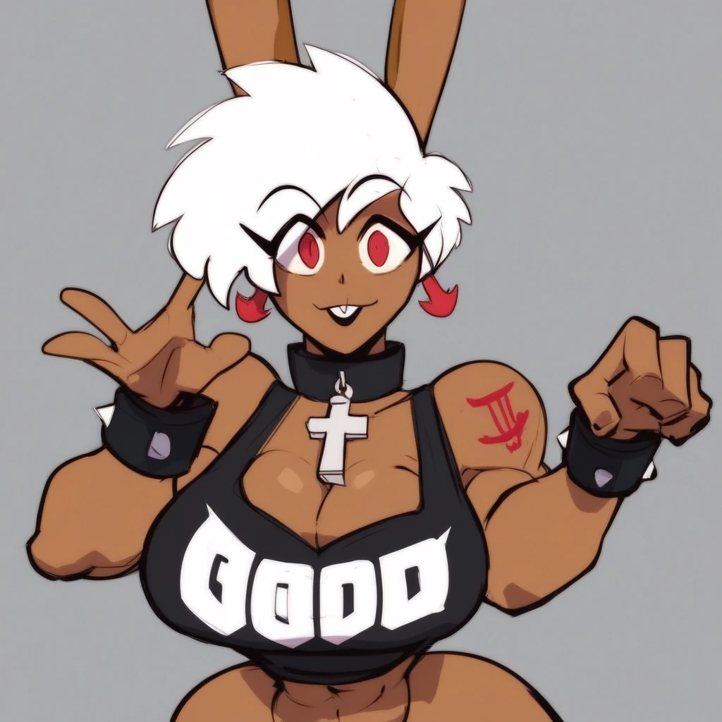 daisydprart, dark-skinned female, large breasts, wide hips, thick thighs, muscular female, rabbit girl, rabbit ears, short hair, white hair, red eyes, rabbit tail, tattoo,