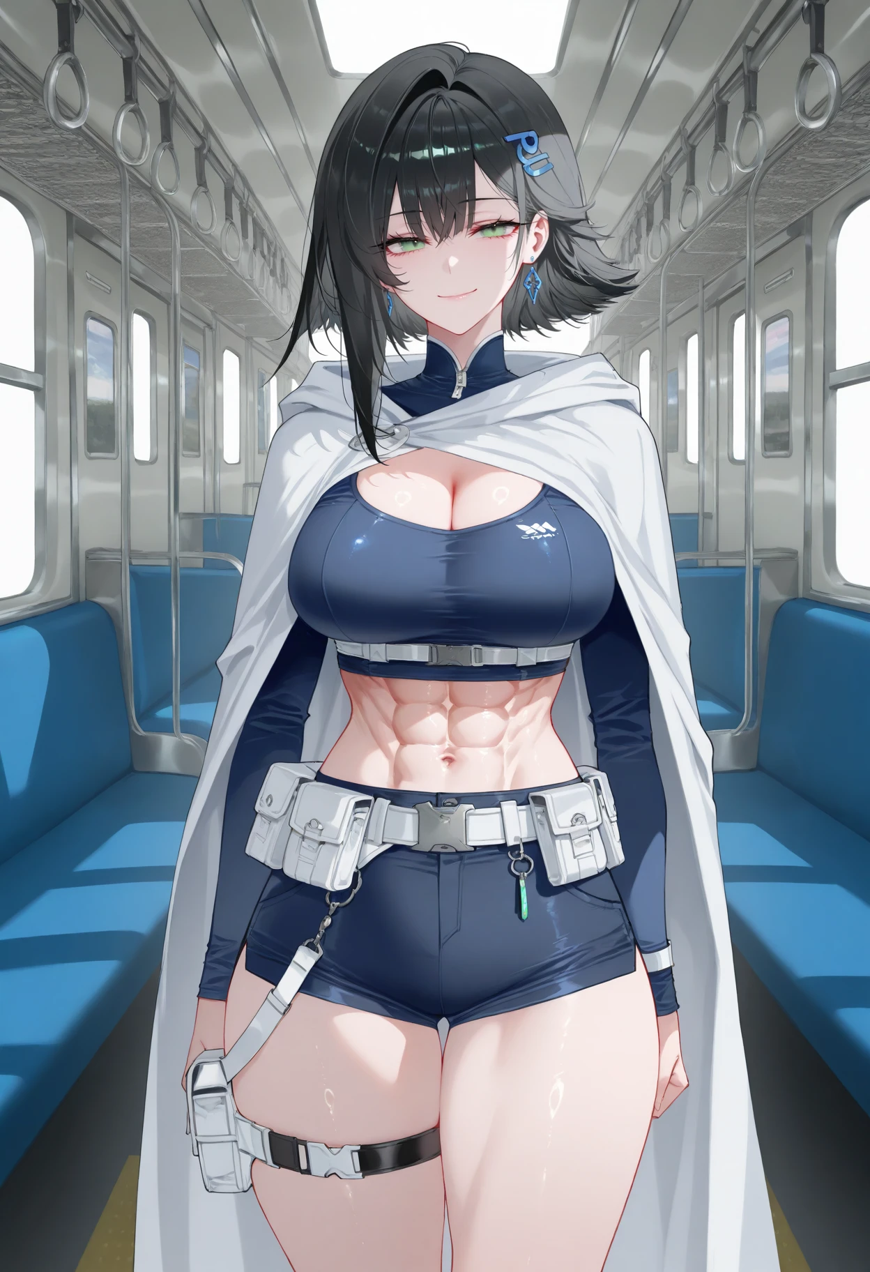 <lora:艾比盖尔:1>,AIBIGAIER,1girl,short hair,long hair,breasts,large breasts,bangs,green eyes,black hair,hair ornament,hairclip,bow,white bow,jewelry,earrings,jacket,long sleeves,cape,white cape,cloak,shorts,belt,pouch,belt pouch,boots,shoes,sneakers,white footwear,blue footwear,thigh strap,