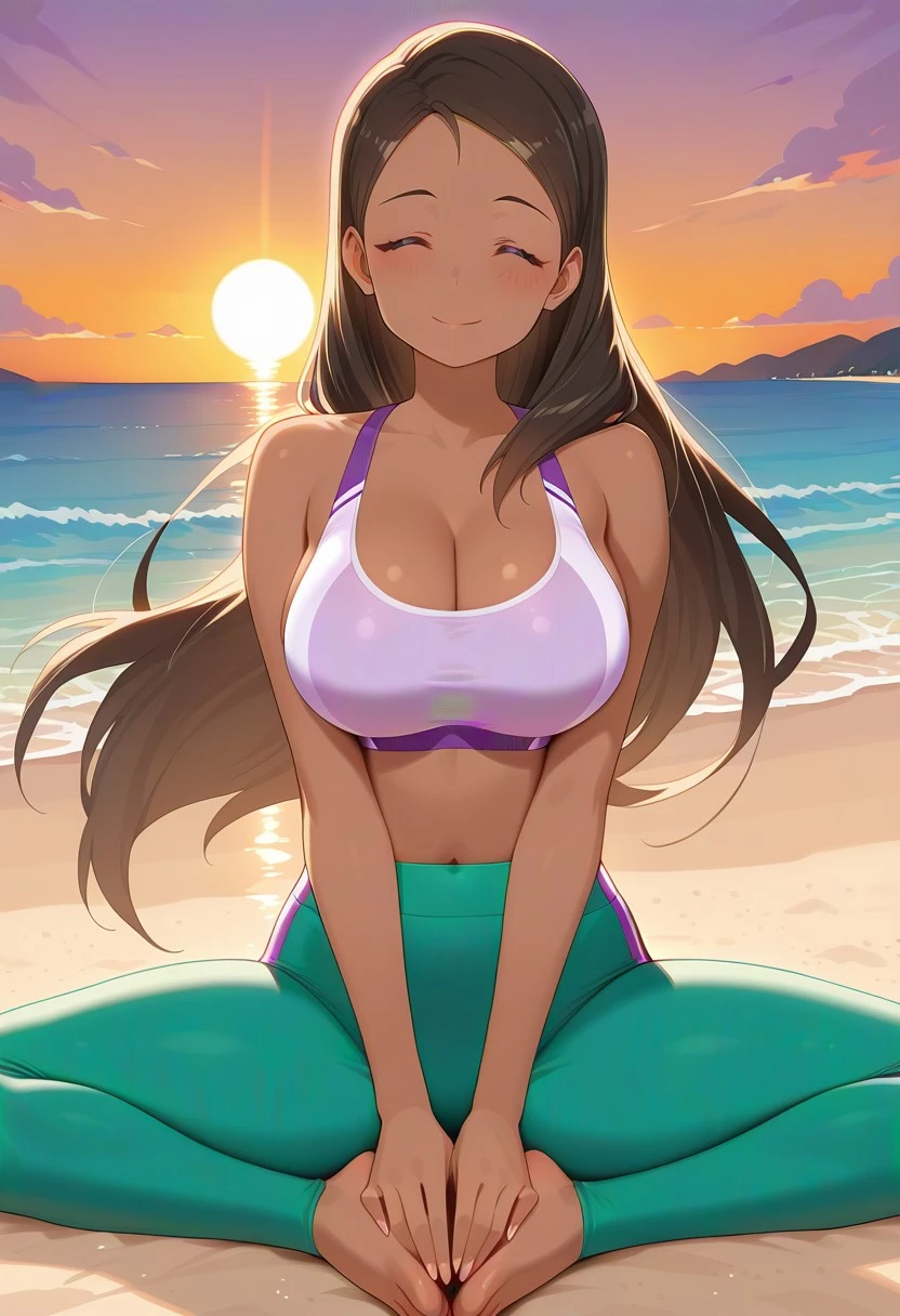 Main/Yoga Outfit: purple sports bra, green yoga pants