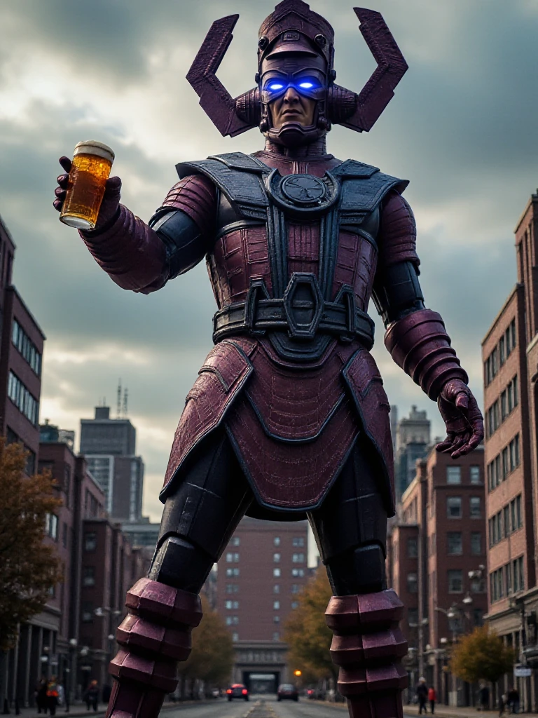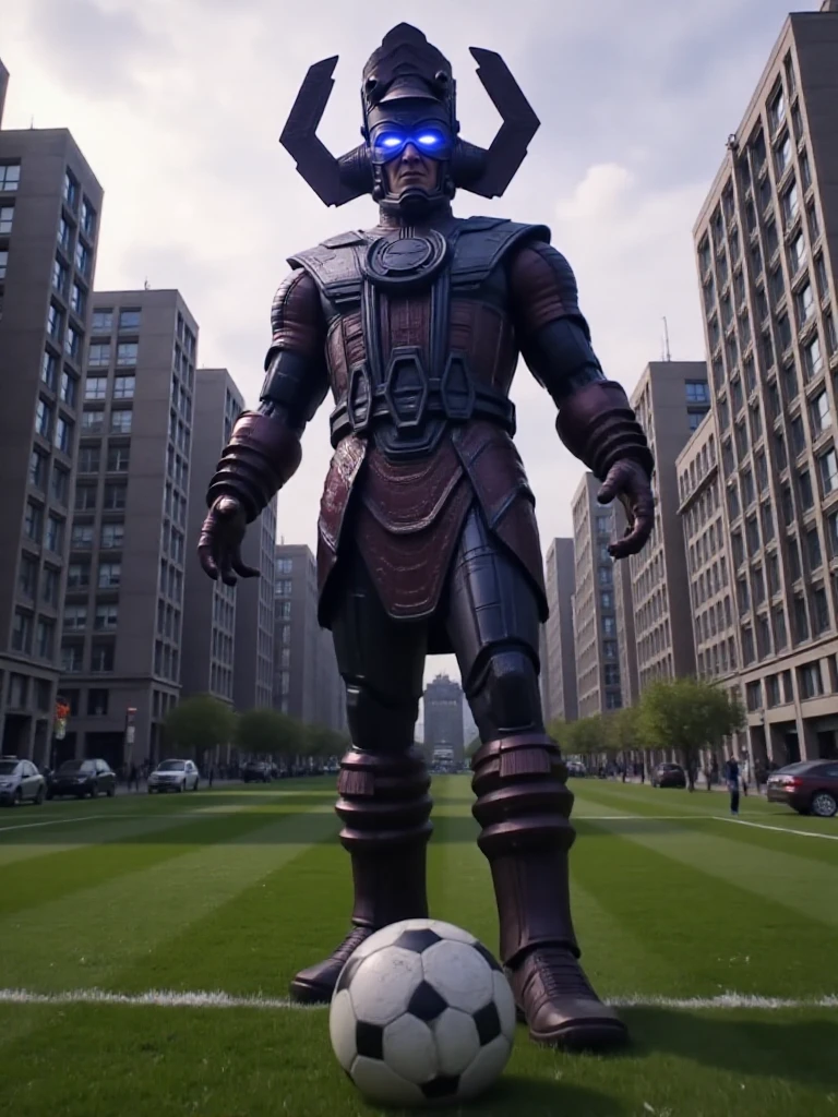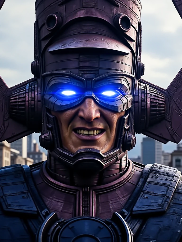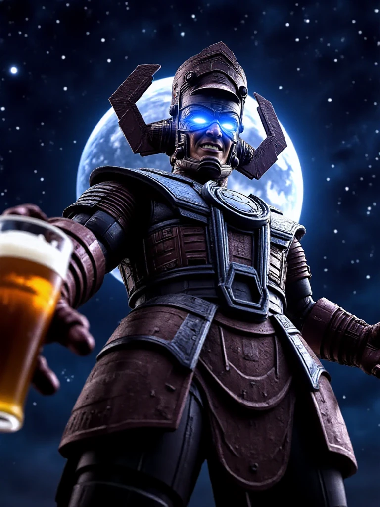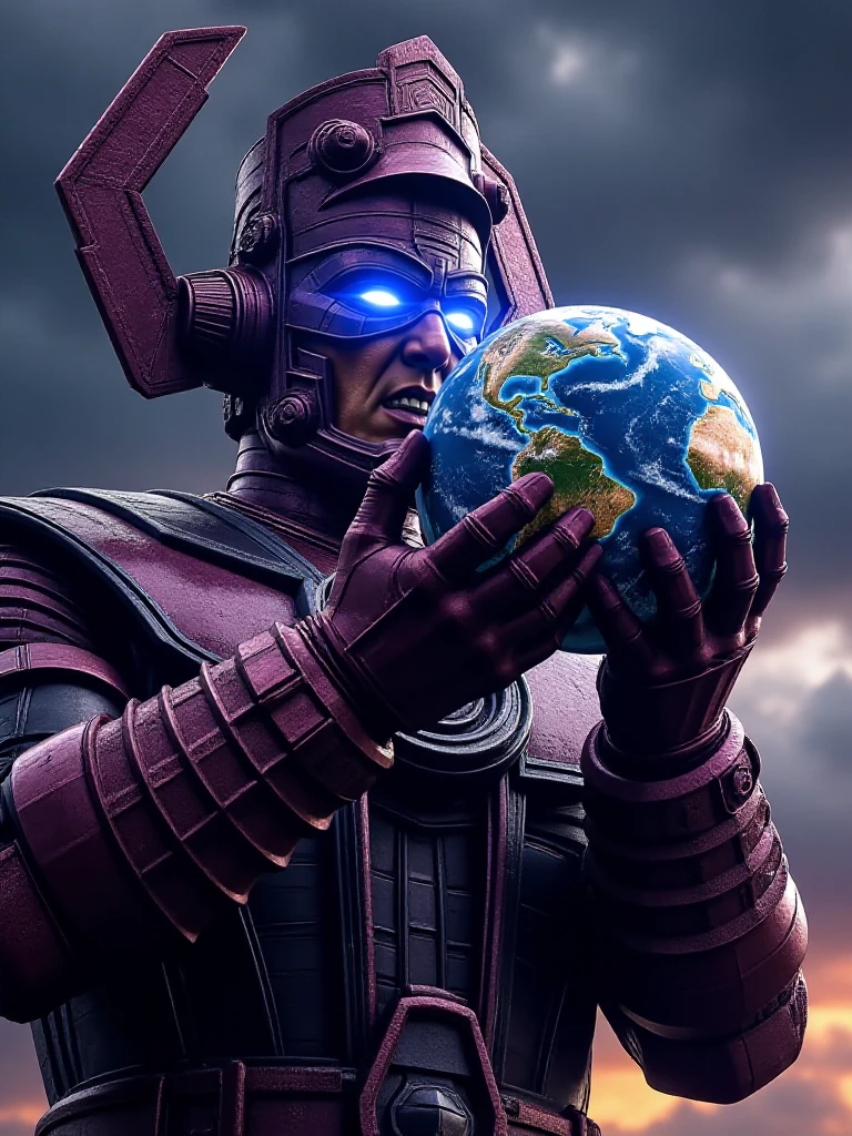 galactus, a giant man with glowing eyes wears helmet, armor, gauntlets, boots