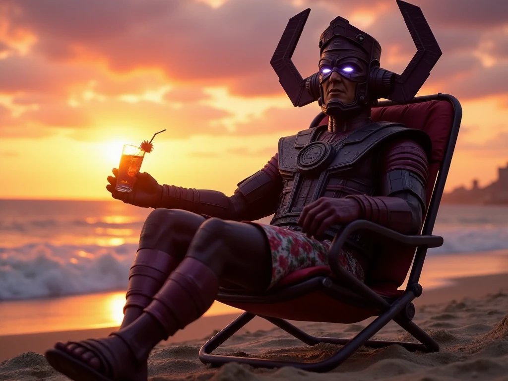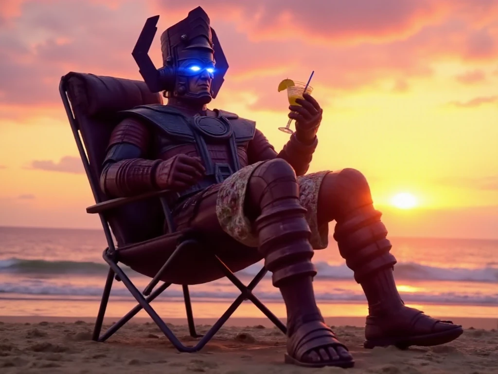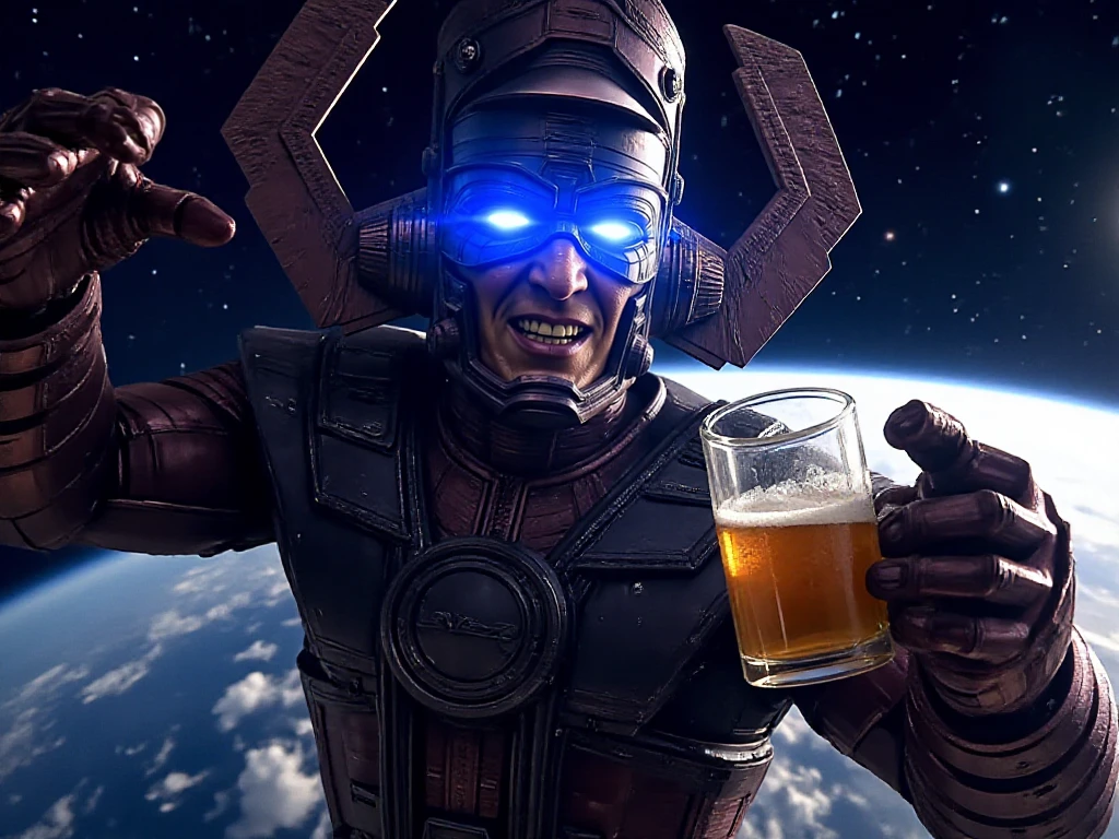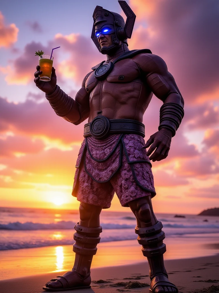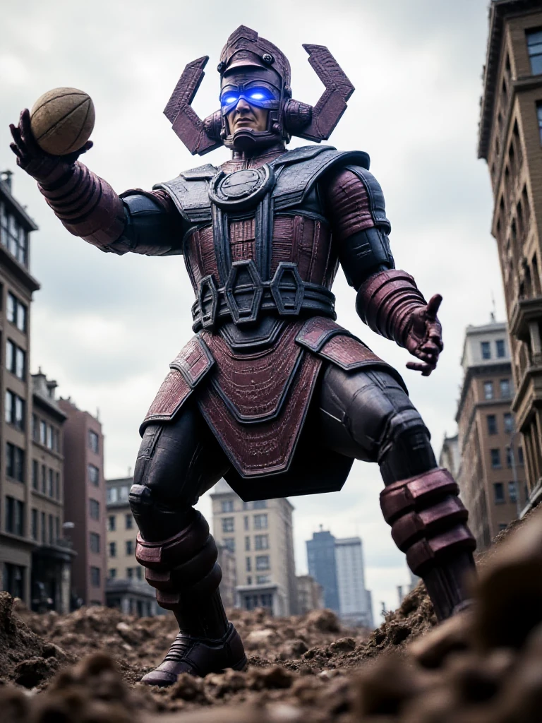 galactus, a giant man with glowing eyes wears helmet, armor, gauntlets, boots