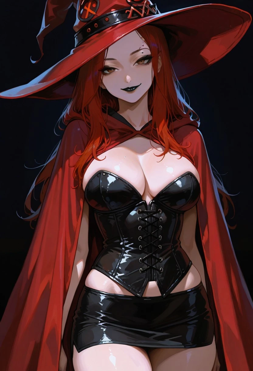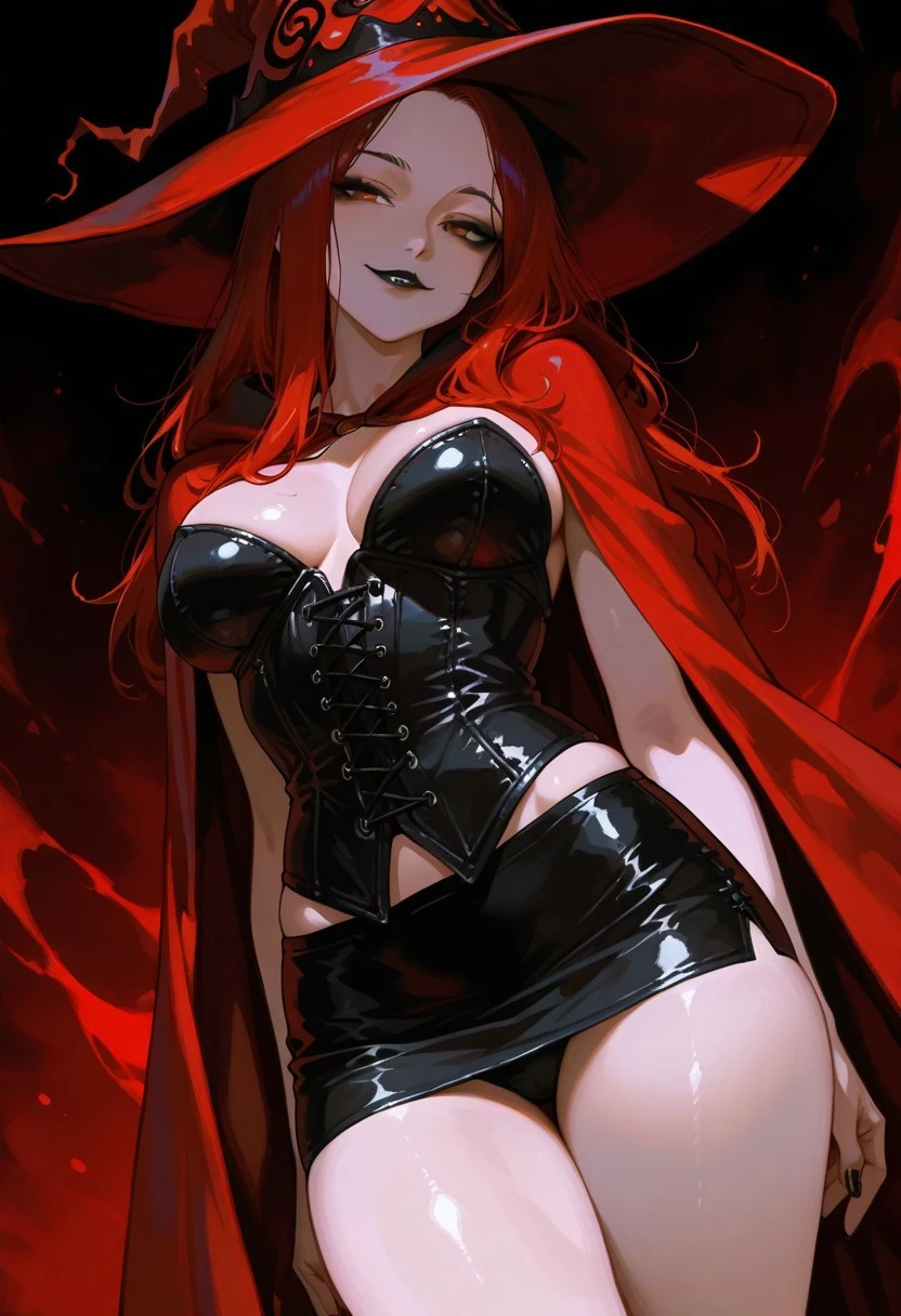 1girl, Charlotte Witch-IL, long hair, red hair, brown eyes, red witch hat, red cape, sexy body,
