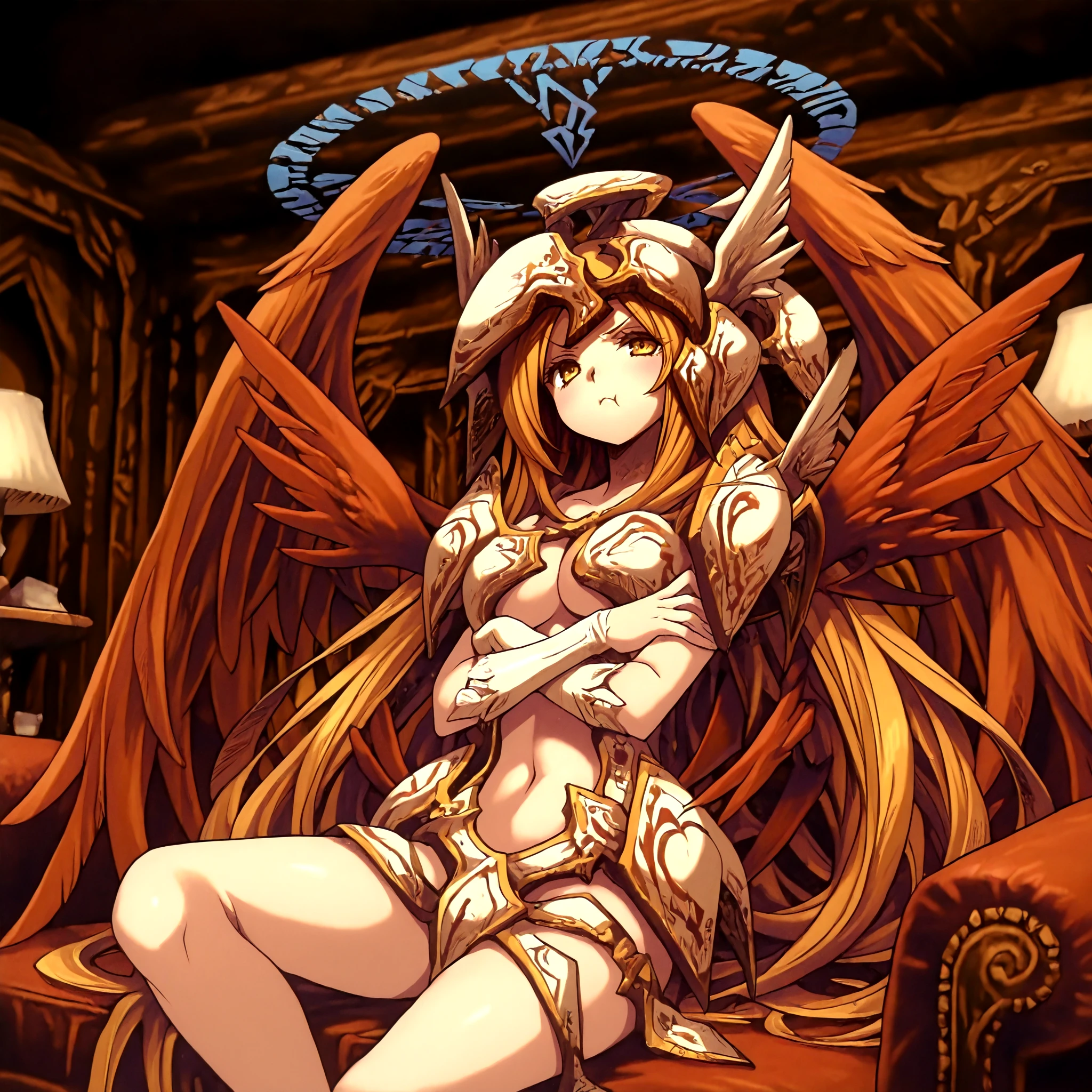 The protector angel who is responsible for guarding the Heaven's Gate. It is a creation of the Gods; however, once born, not even the Gods can unmake it. For this reason, a protector angel who disobeys or fails its duty is not punished with death but is exiled from Asgard. As a result of falling from grace and being cast out, some protector angels go as far as transform into demons."Helmet" can be added to help with generations that are not her default look. Wings, and halo can be removed when you prompt away from her general look. Adetailer helps a lot with the face, data set was very small and samey.