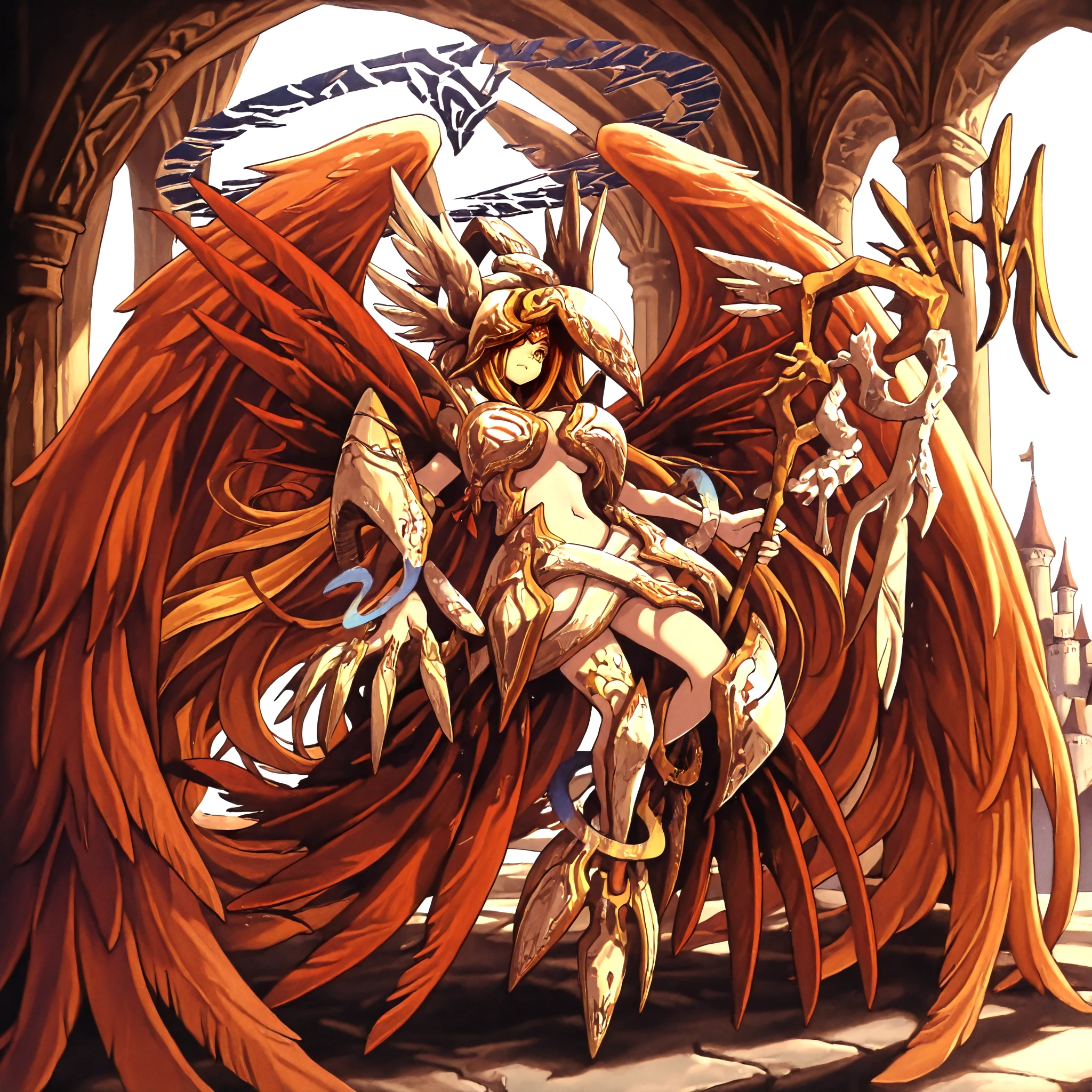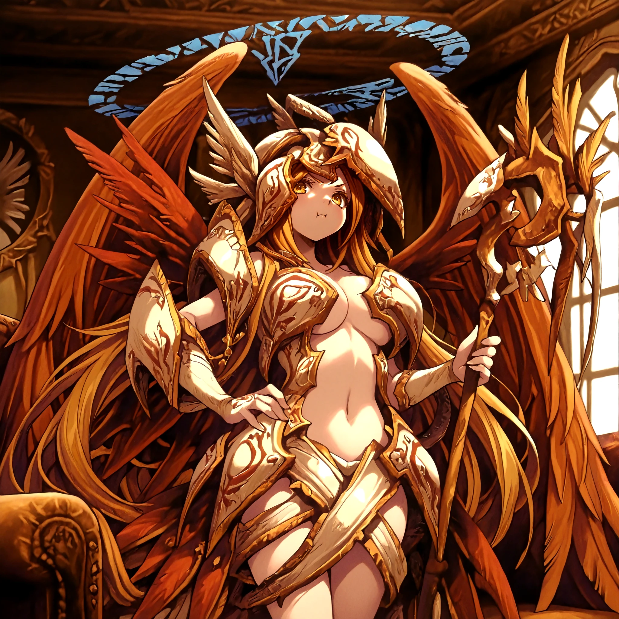 Basic prompt: kitn_marietta, ancardia, wings, holding_staff, halo