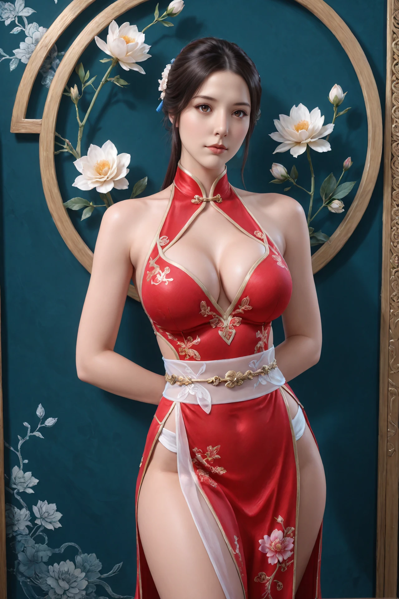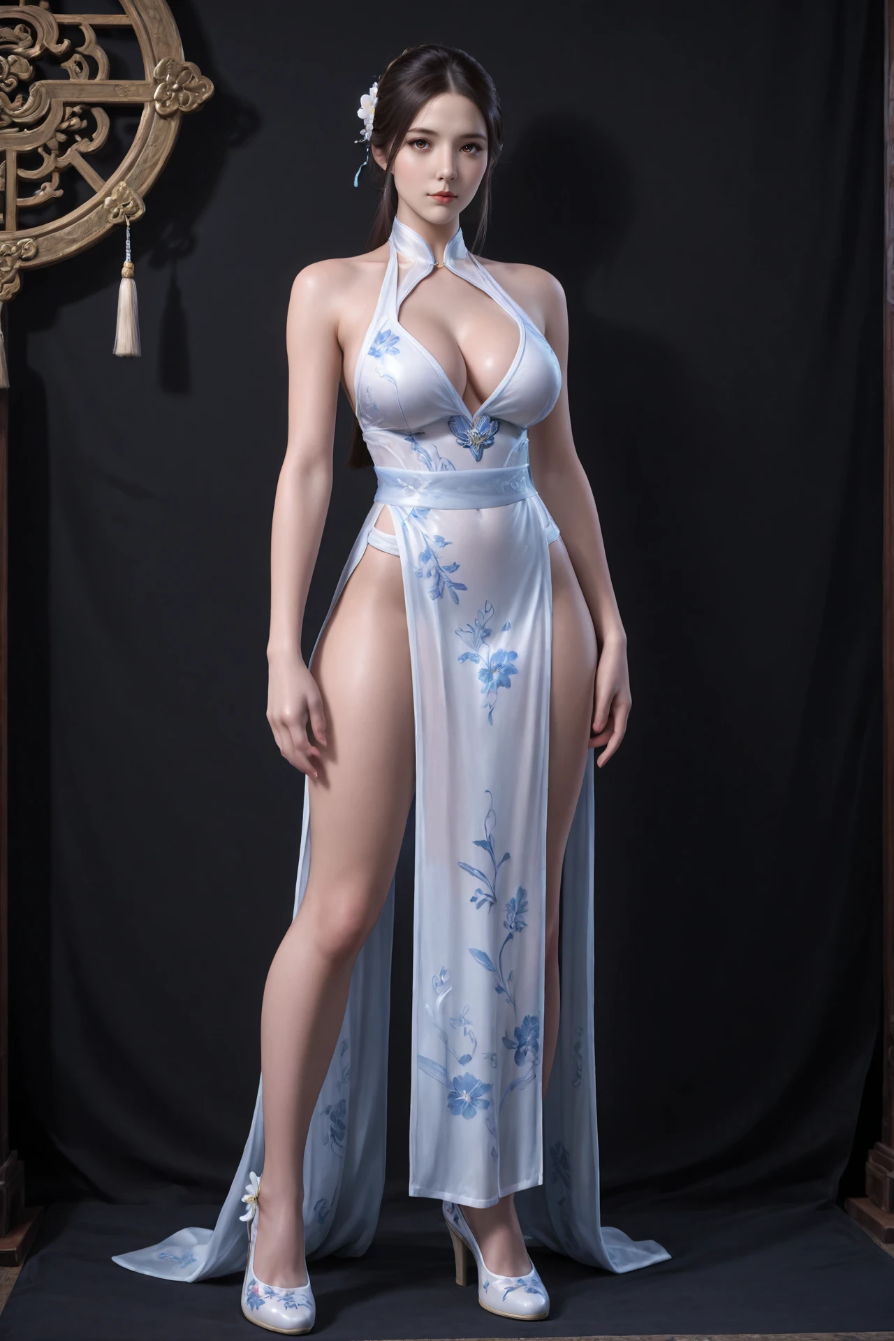 chinese_clothes,halter_dress,pelvic_curtain,side_slit,transparent sash,flower print footwear, large_breasts,high_heels,