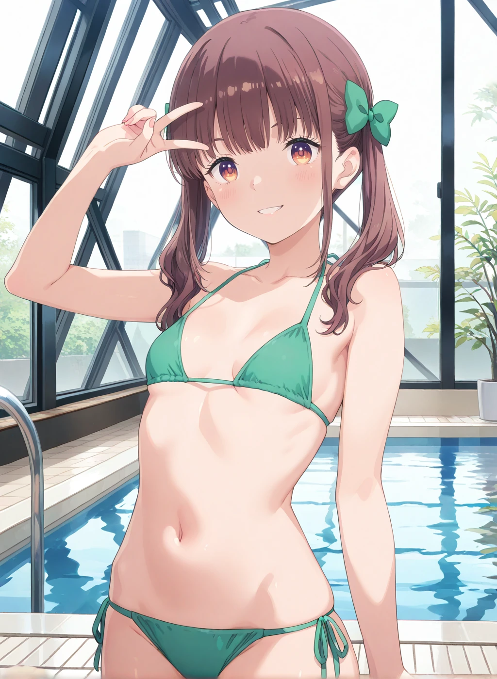 yokota_aya, brown eyes, brown hair, long hair, twintails, hair bow, bangs, green bow, small breasts,oshi ga budoukan itte kuretara shinu