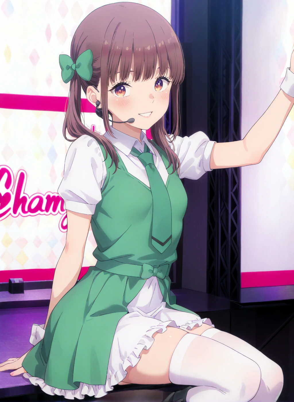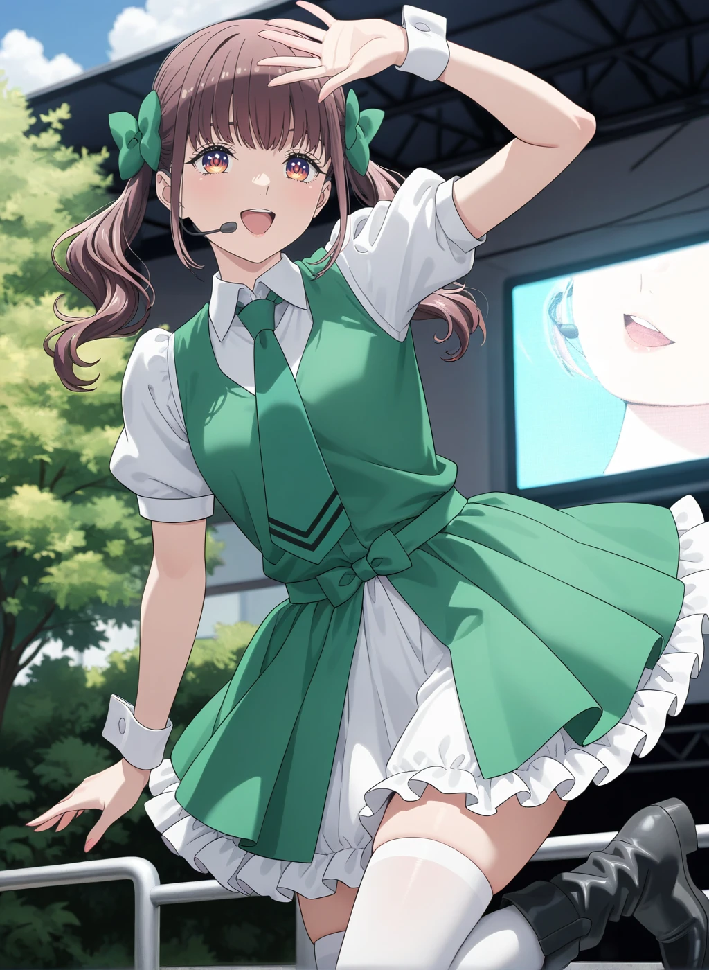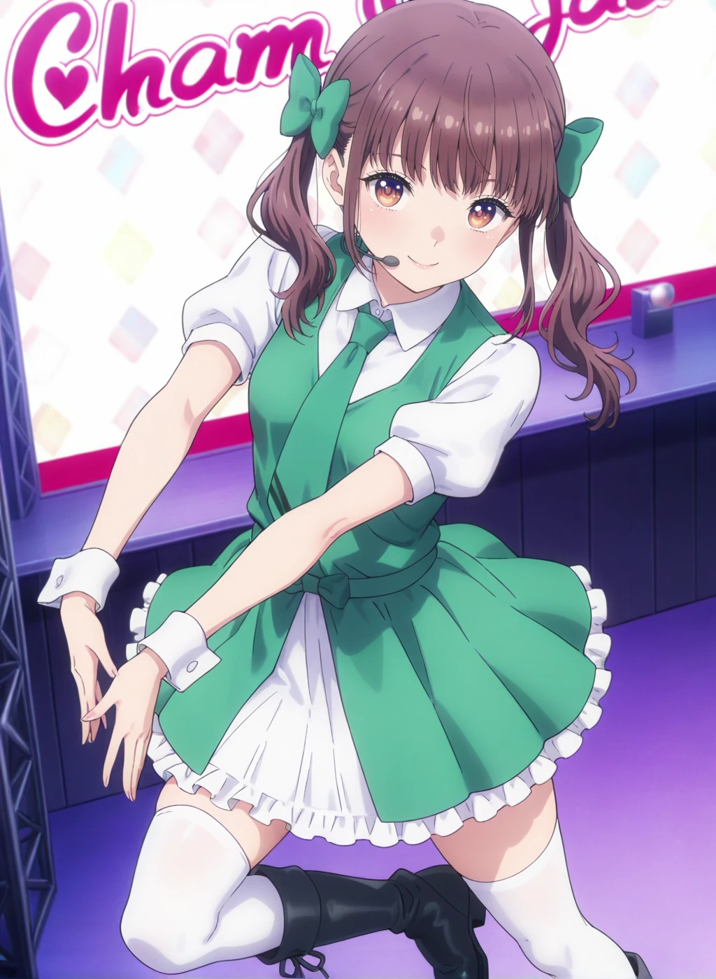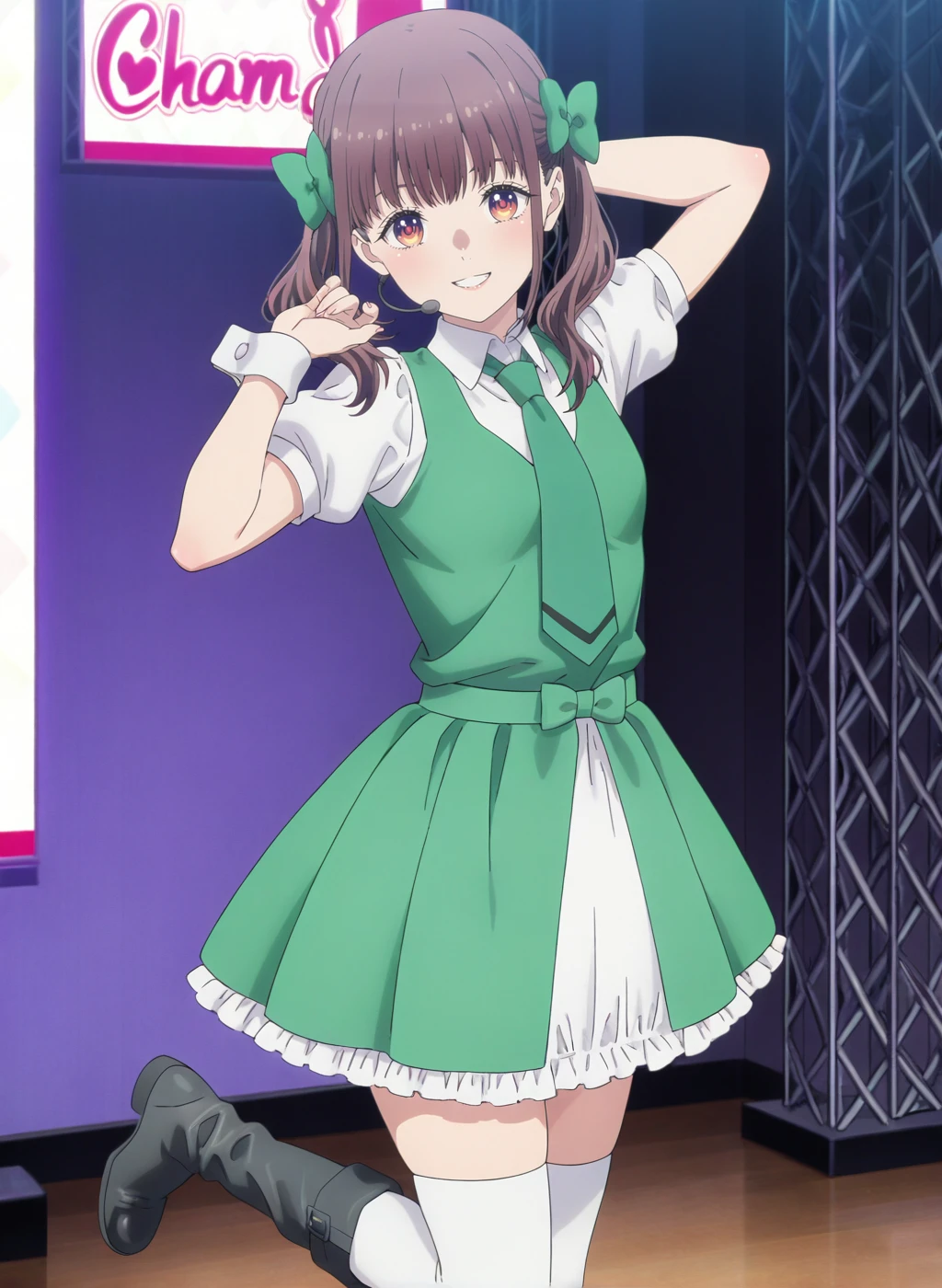 idol,white shirt, green necktie, puffy short sleeves, collared shirt,green dress,green vest,white thighhighs,black footwear,boots,frilled dress
