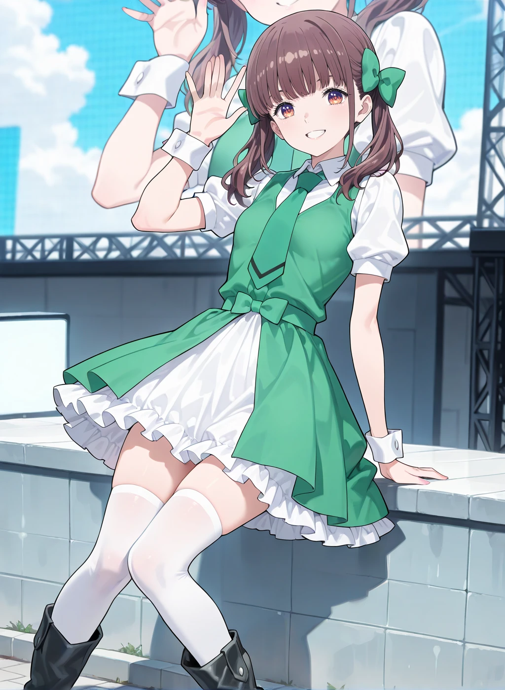 idol,white shirt, green necktie, puffy short sleeves, collared shirt,green dress,green vest,white thighhighs,black footwear,boots,frilled dressMaid: