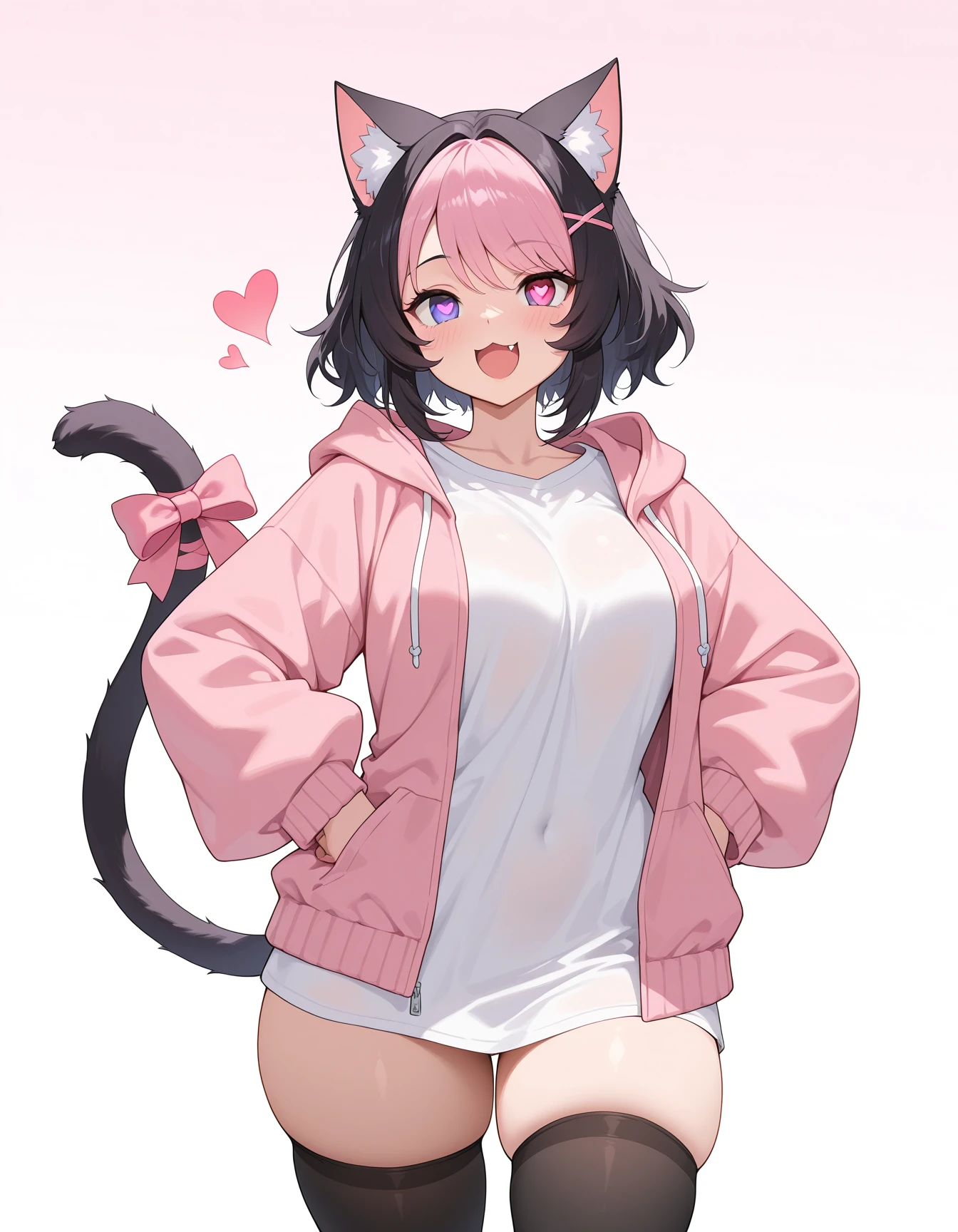 darlingstrawb, two-tone hair, cat tail, pink hair, black hair, short hair, hairclip, tail bow, heterochromia, pink eyes, purple eyes, heart-shaped pupils, pink jacket,fang, white shirt