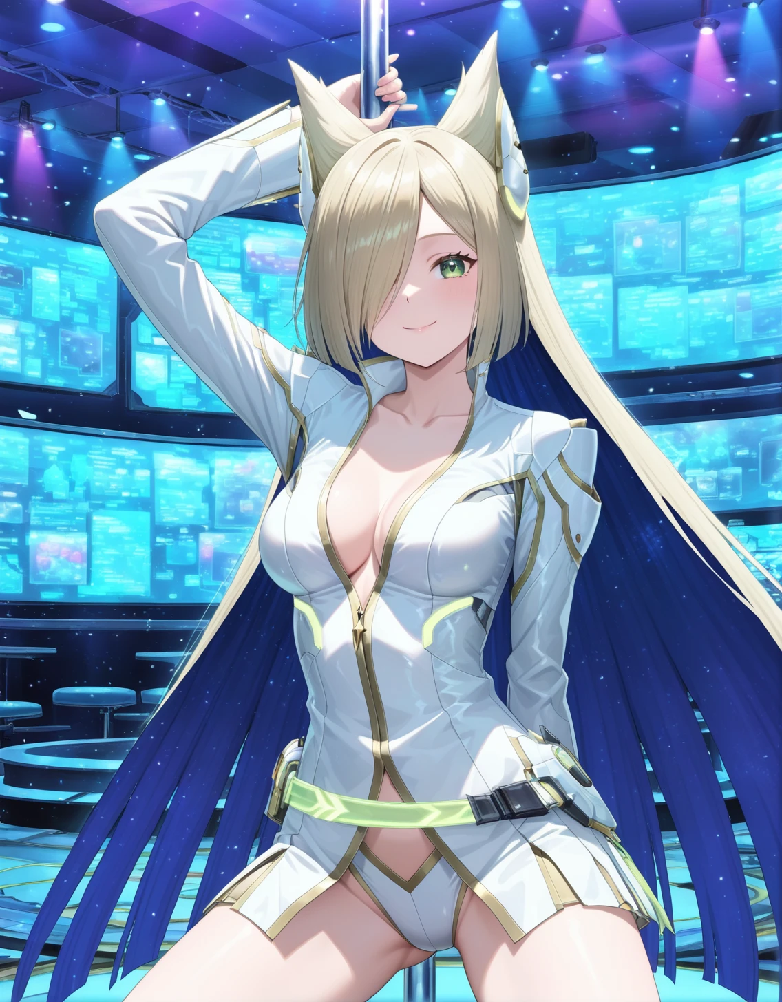 blonde hair,jacket,pants,ear covers,a1ma,almaball,hair over one eye,wide hair,blue underdye,long hair