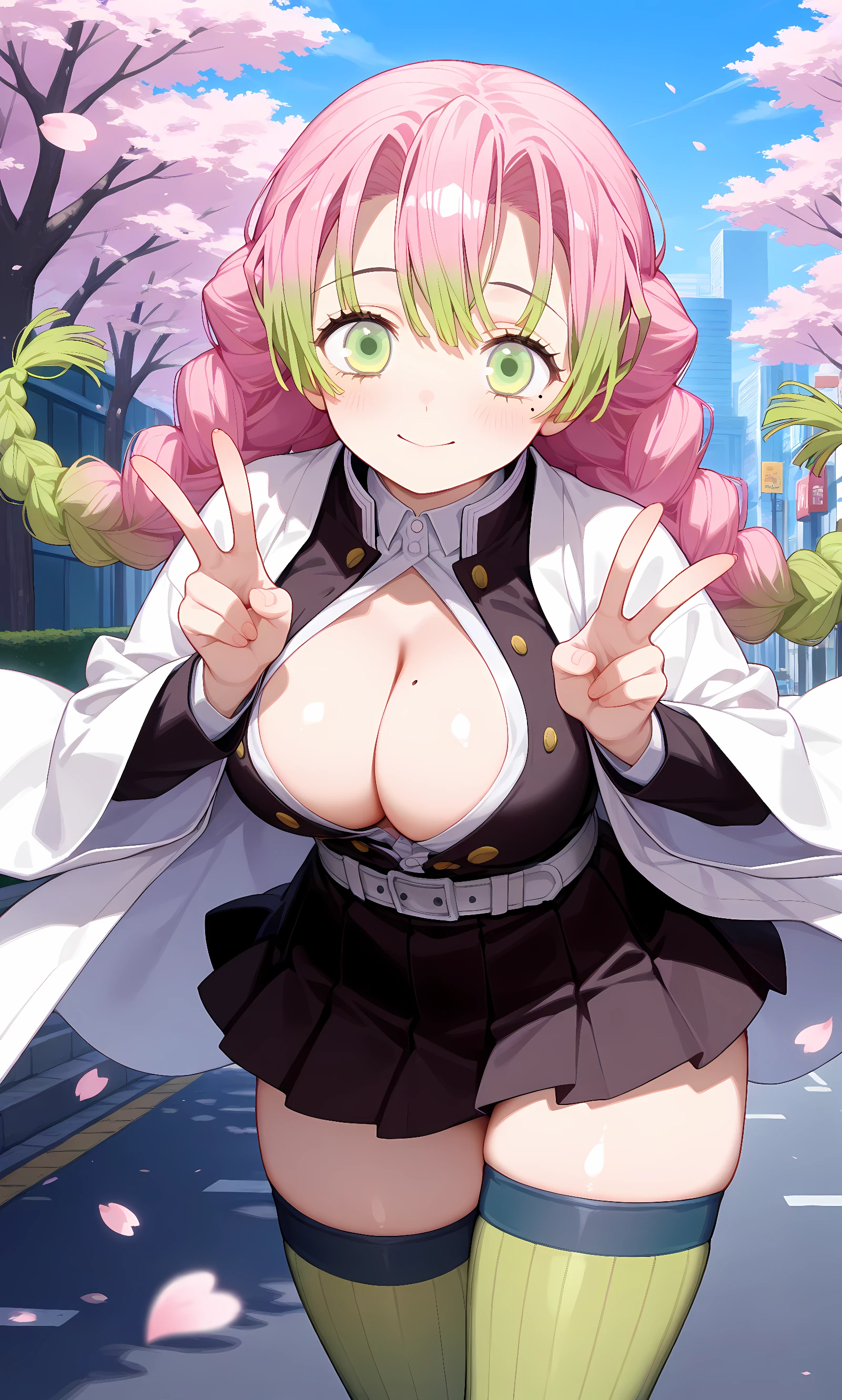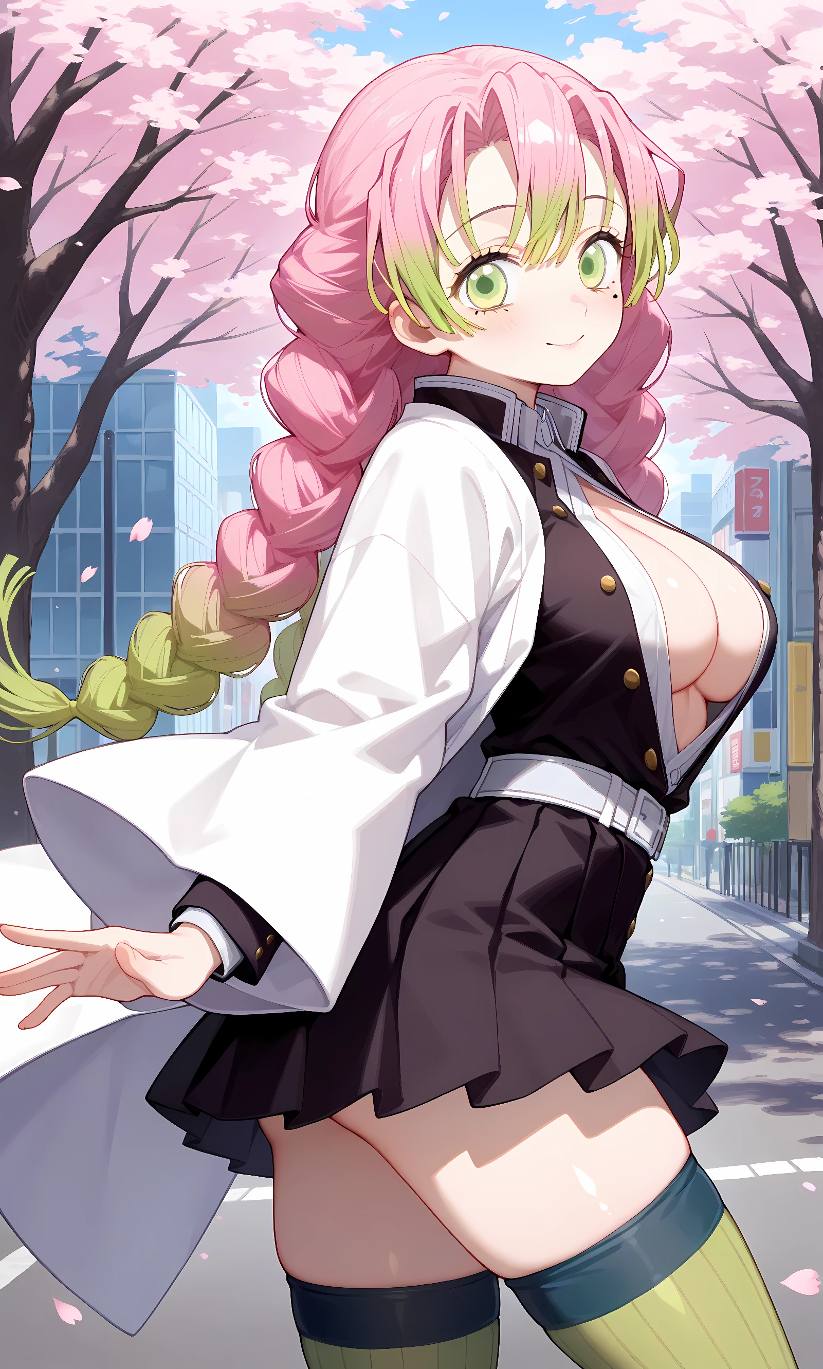kanroji mitsuri, pink hair, long hair, green hair, braid, mole, mole under eye, gradient hair, green eyes, twin braids, bangs, two-tone hair
