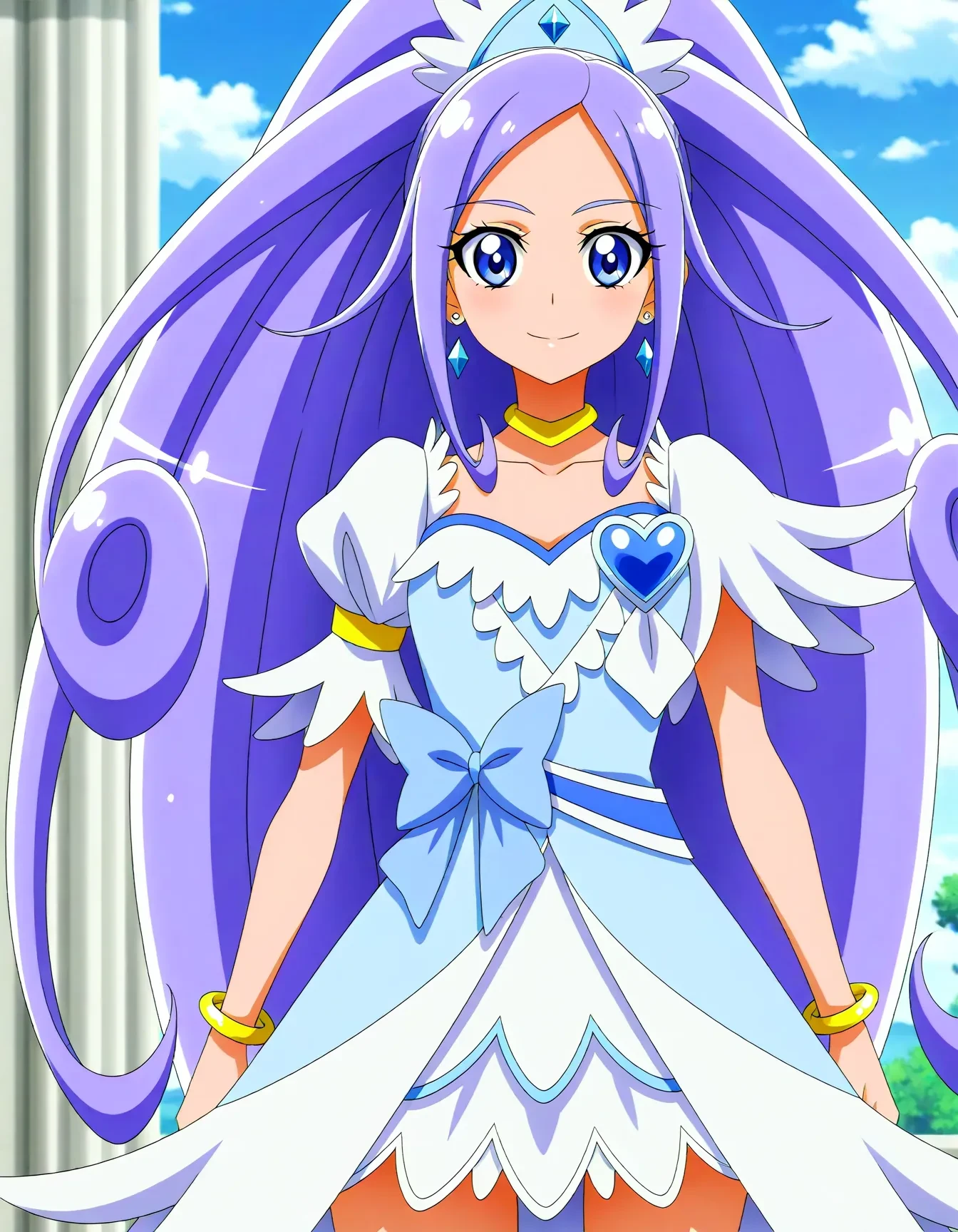 cure diamond,blue hair,high ponytail,long hair,blue eyes,hair ornament,gem,jewelry,earrings,blur ribbon,heart brooch,choker,brooch,bracelet,blue bow,capelet,yellow choker,blue dress,yellow bracelet,white legwear,