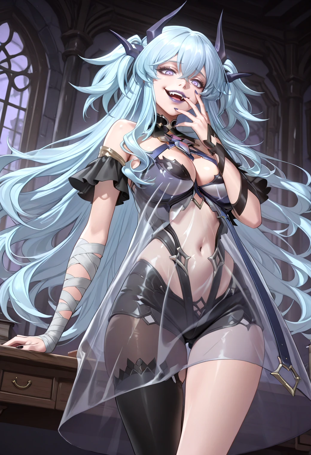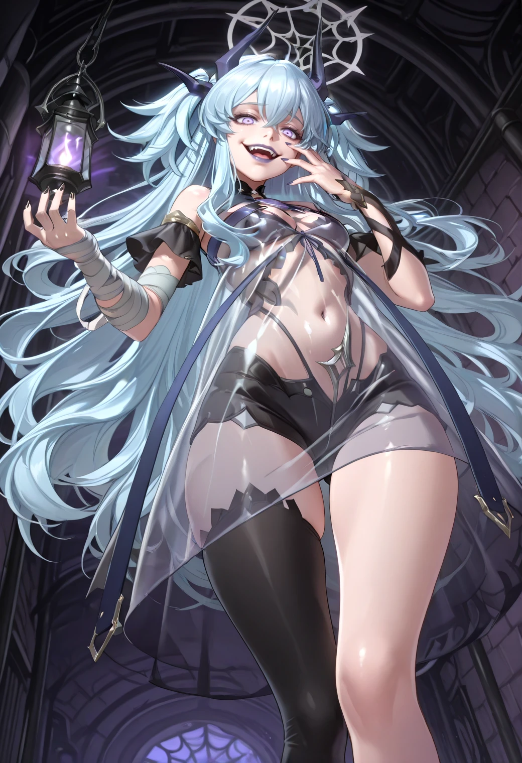 • bare shoulders, navel, {breasts | small breasts}, bandages, bandaged arm, black nails, dress, see-through, see-through dress, shorts, black thighhighs, single leg pantyhose,