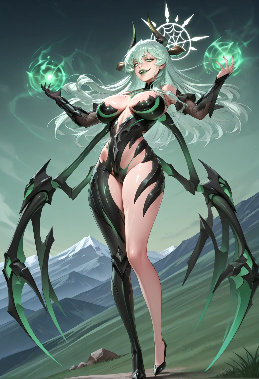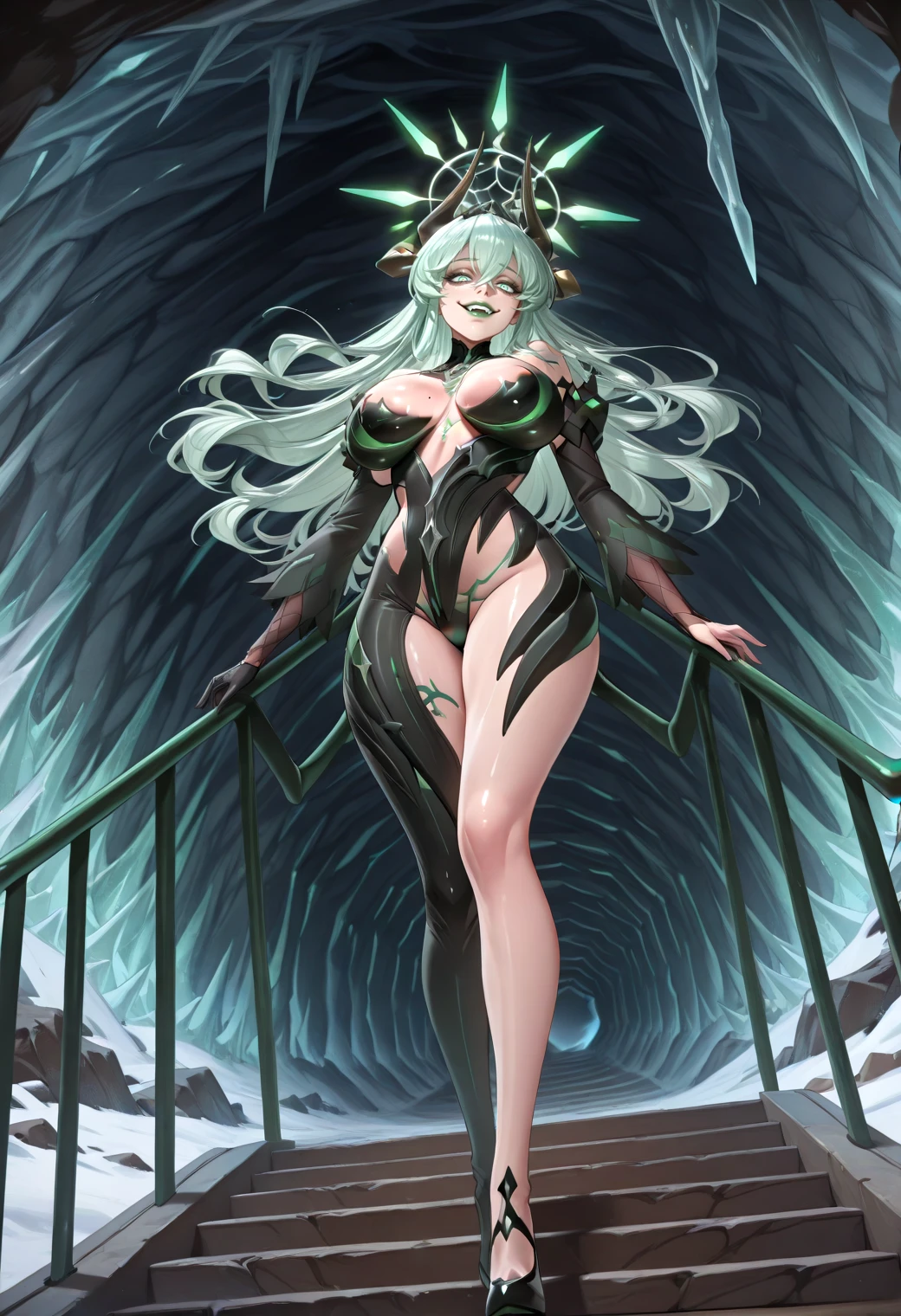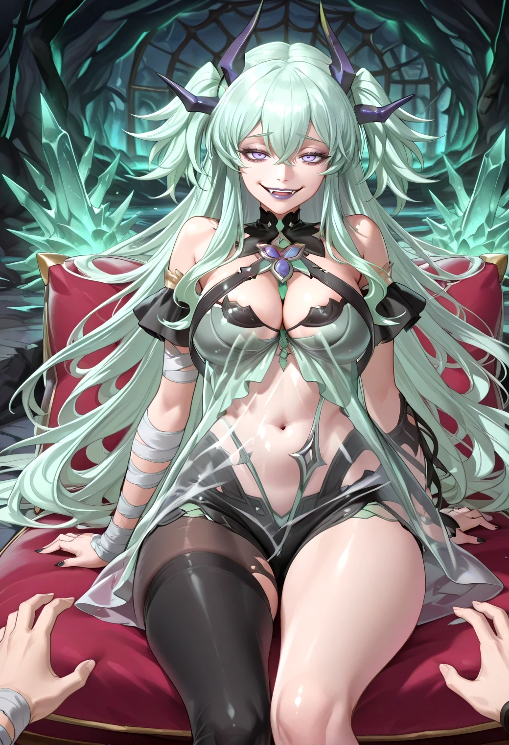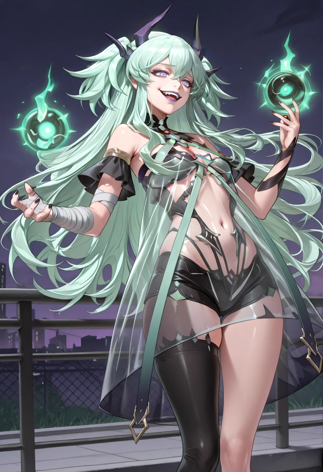 • gnosisviella, 1girl, demon girl, green eyes, halo, green hair, long hair, bangs, hair between eyes, horns,