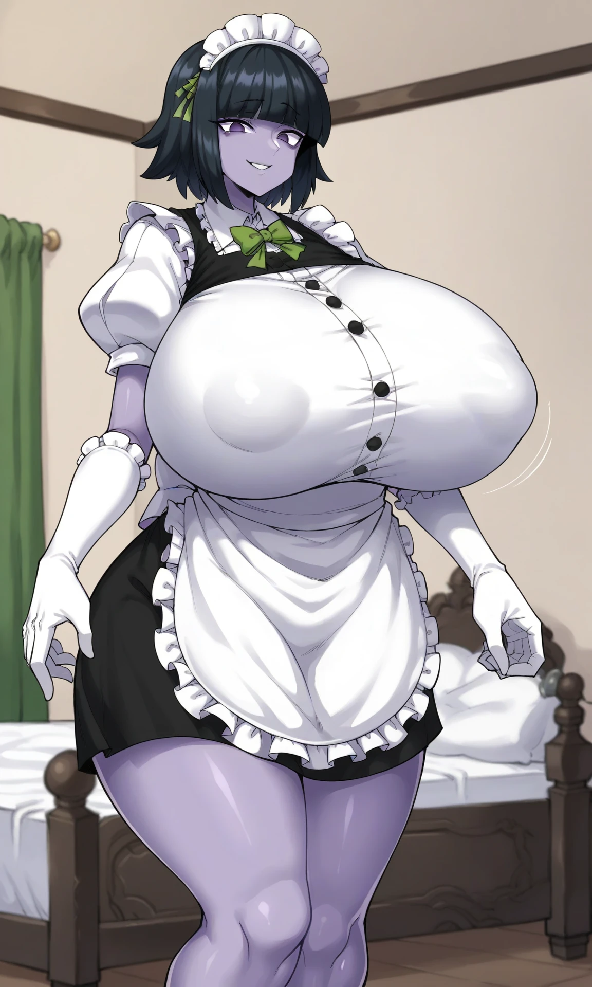 zombie maid girl, purple skin, purple eyes, blank eyes, black hair, medium hair, flipped hair, maid headwear, green ribbon in hair, sidelocks, blunt bangs, hime cut, gigantic breasts, wide hips, thick thighs, zombie maid's maid dress, frilled elbow gloves, white puffy sleeves, apron, green bowtie, buttons