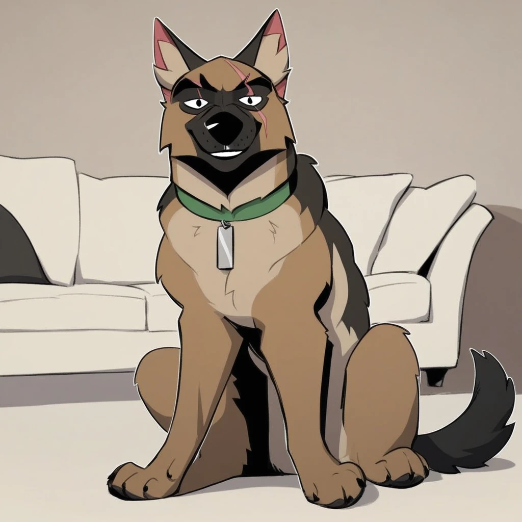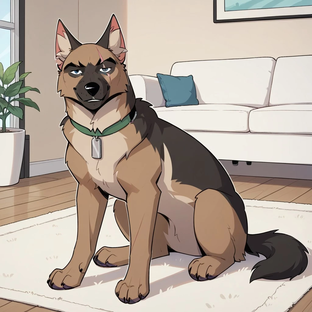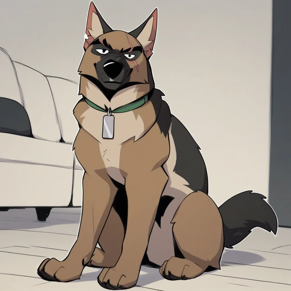 dog, german shepherd, black and brown fur, black eyes, scar across eyes, dog tail, black nose, green collar, silver dog tag,