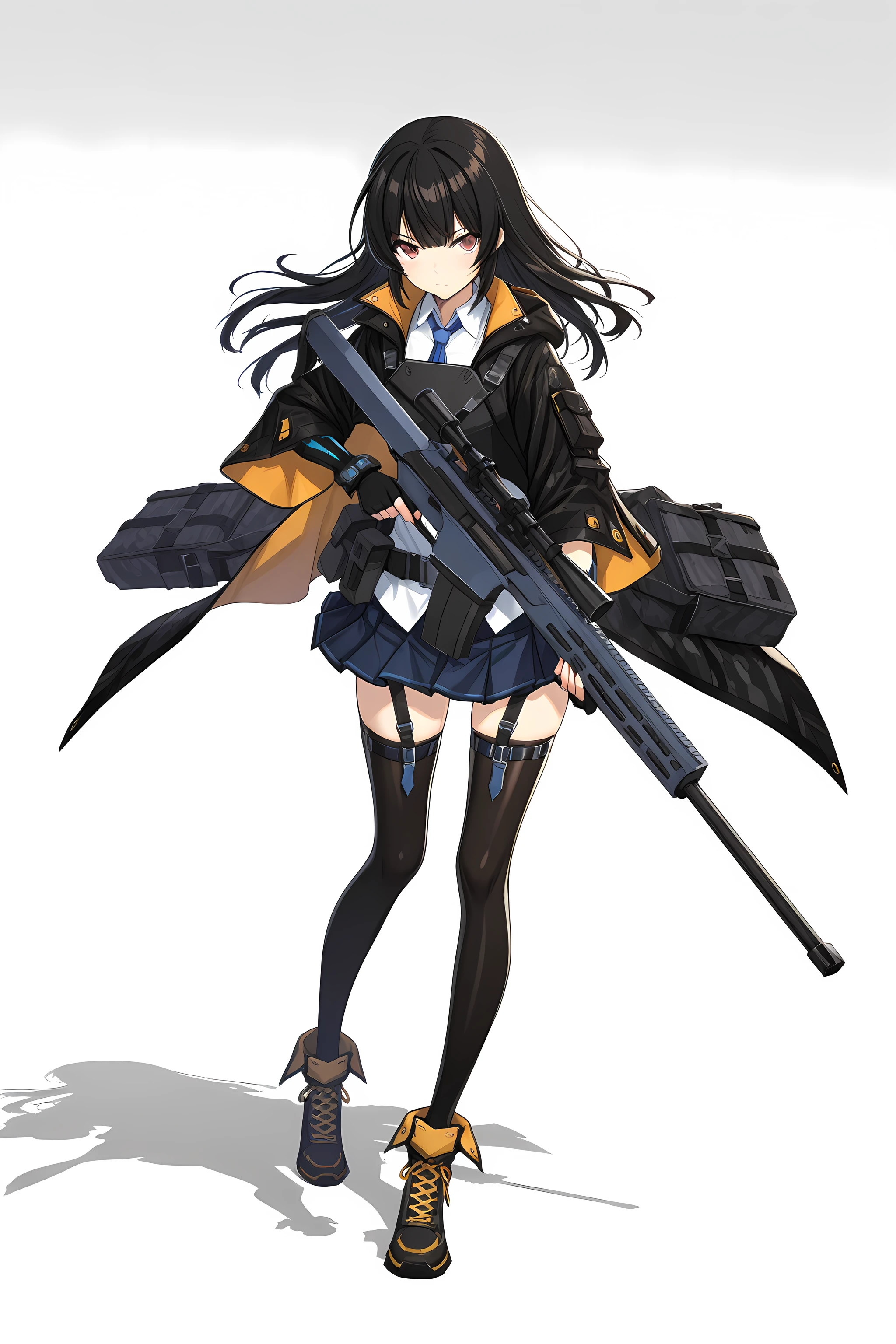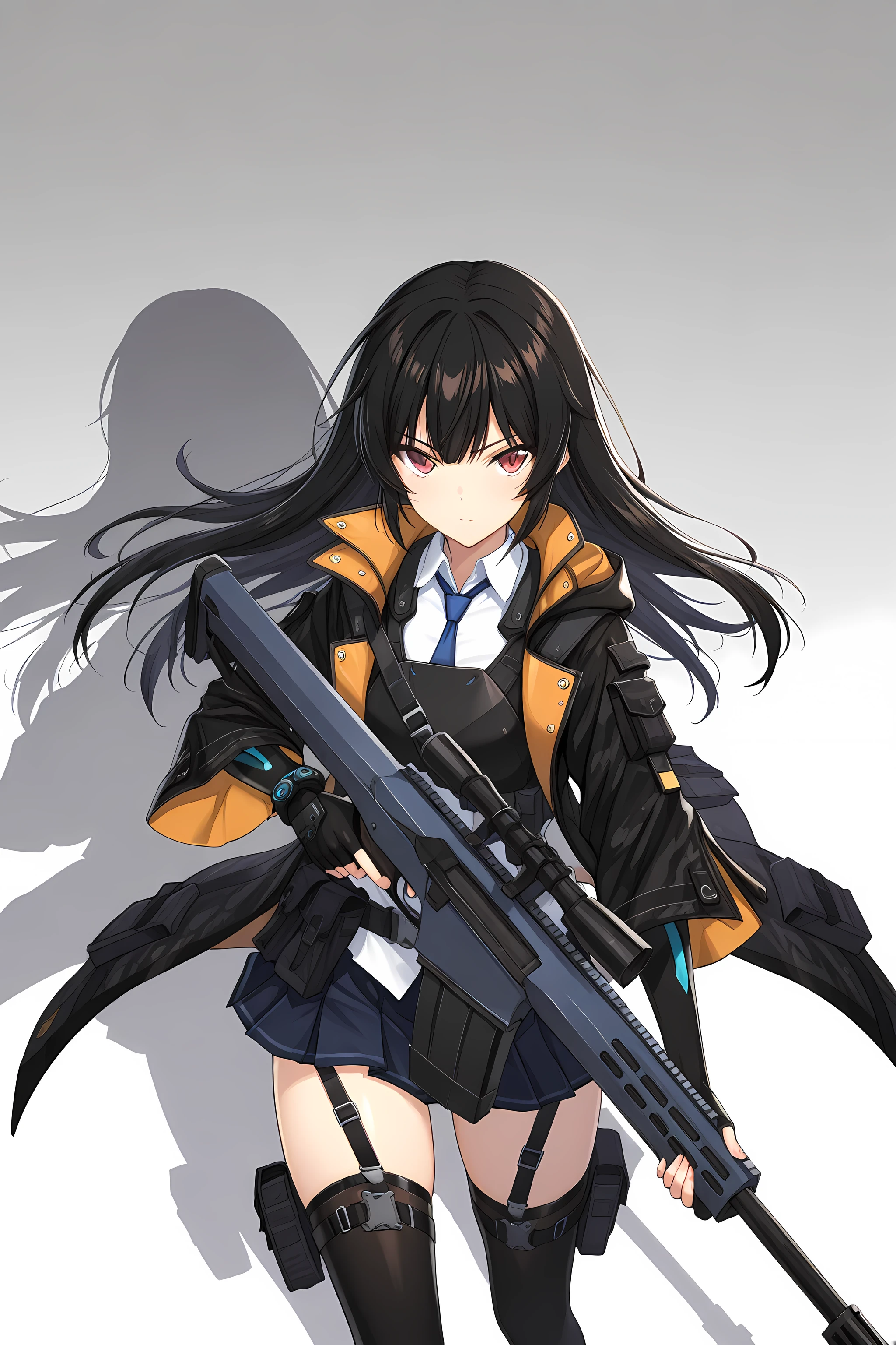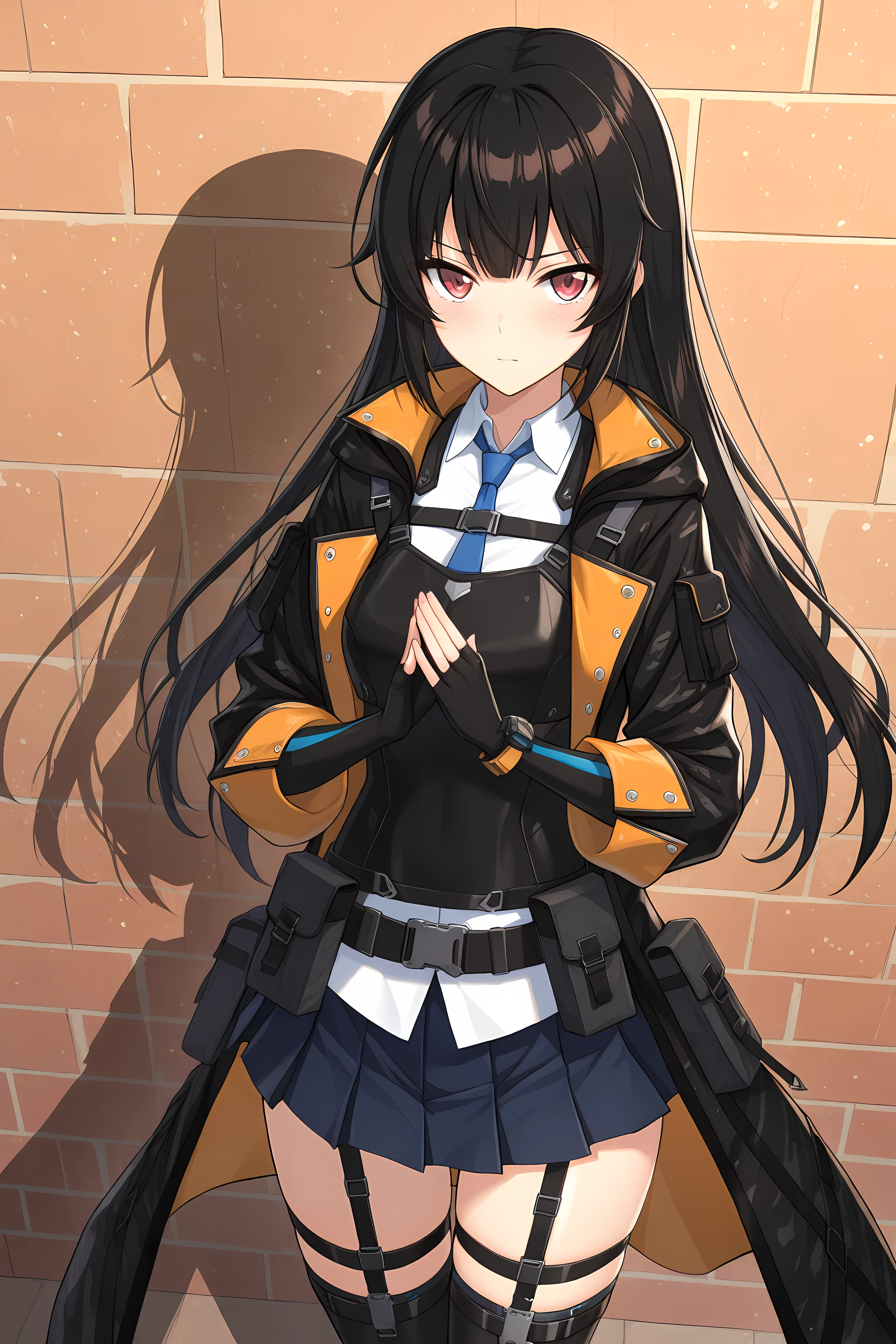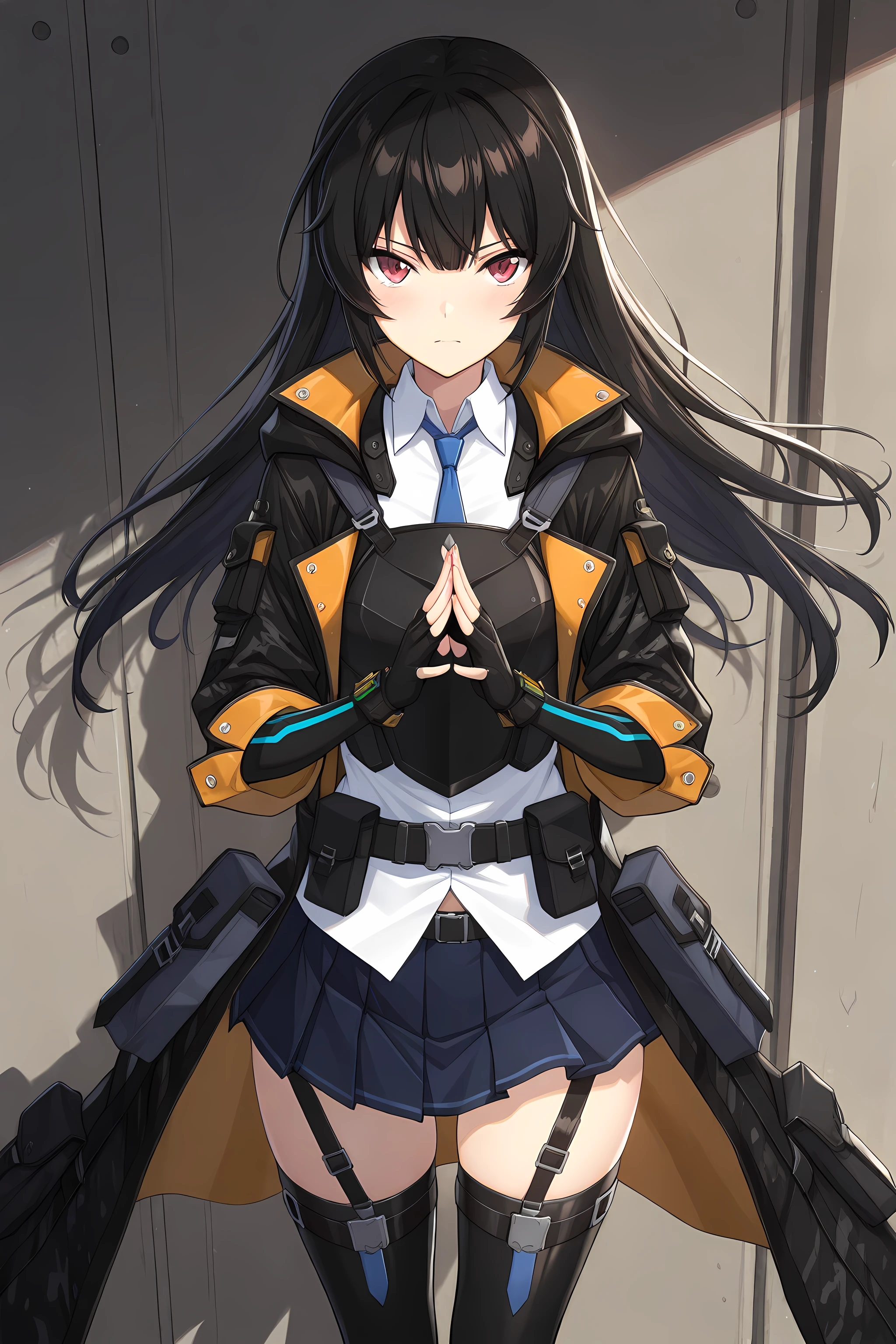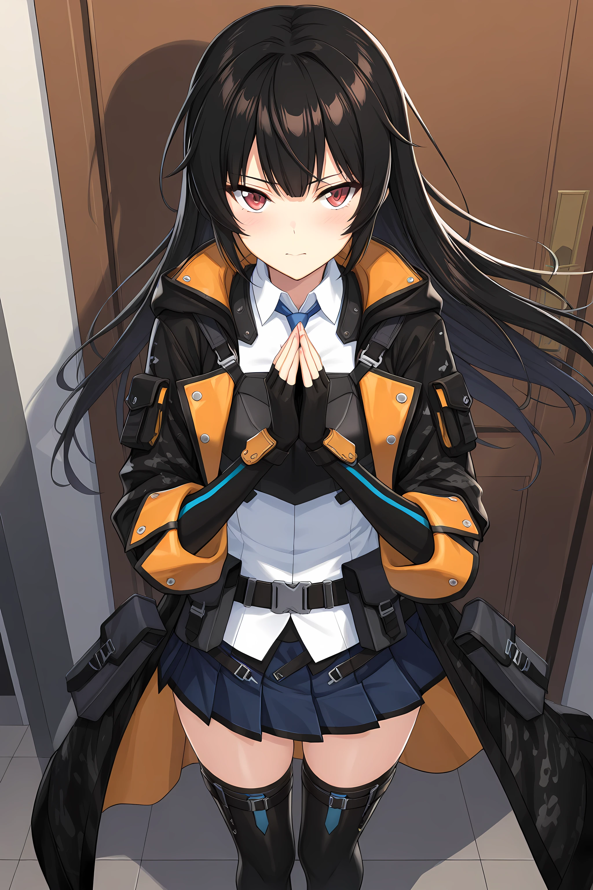 Outfit tag 1 is " defaultoutfit, gloves, necktie, skirt, fingerless gloves, black gloves, pleated skirt, thighhighs, jacket, white shirt, shirt, blue necktie, "