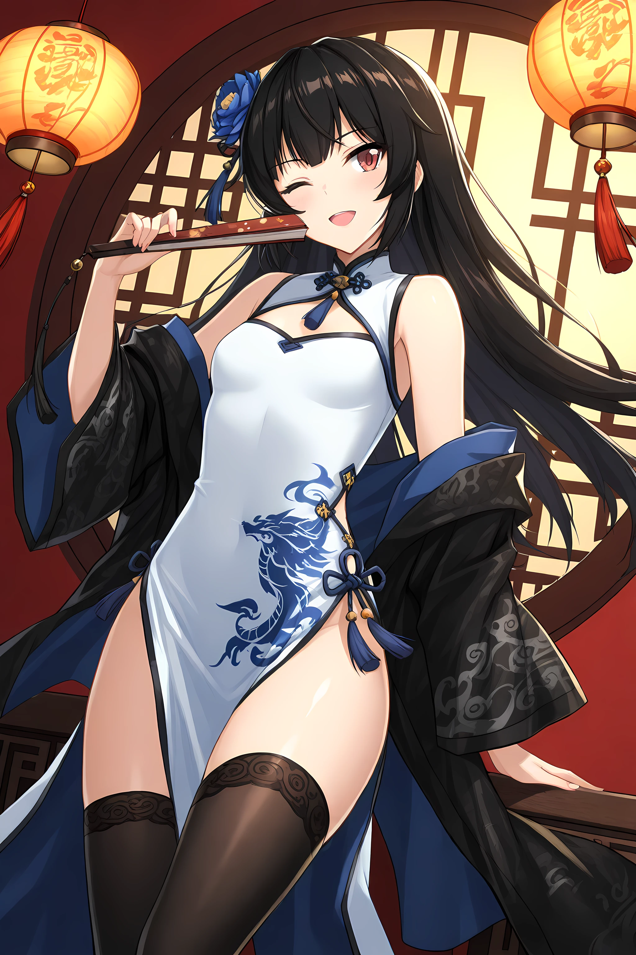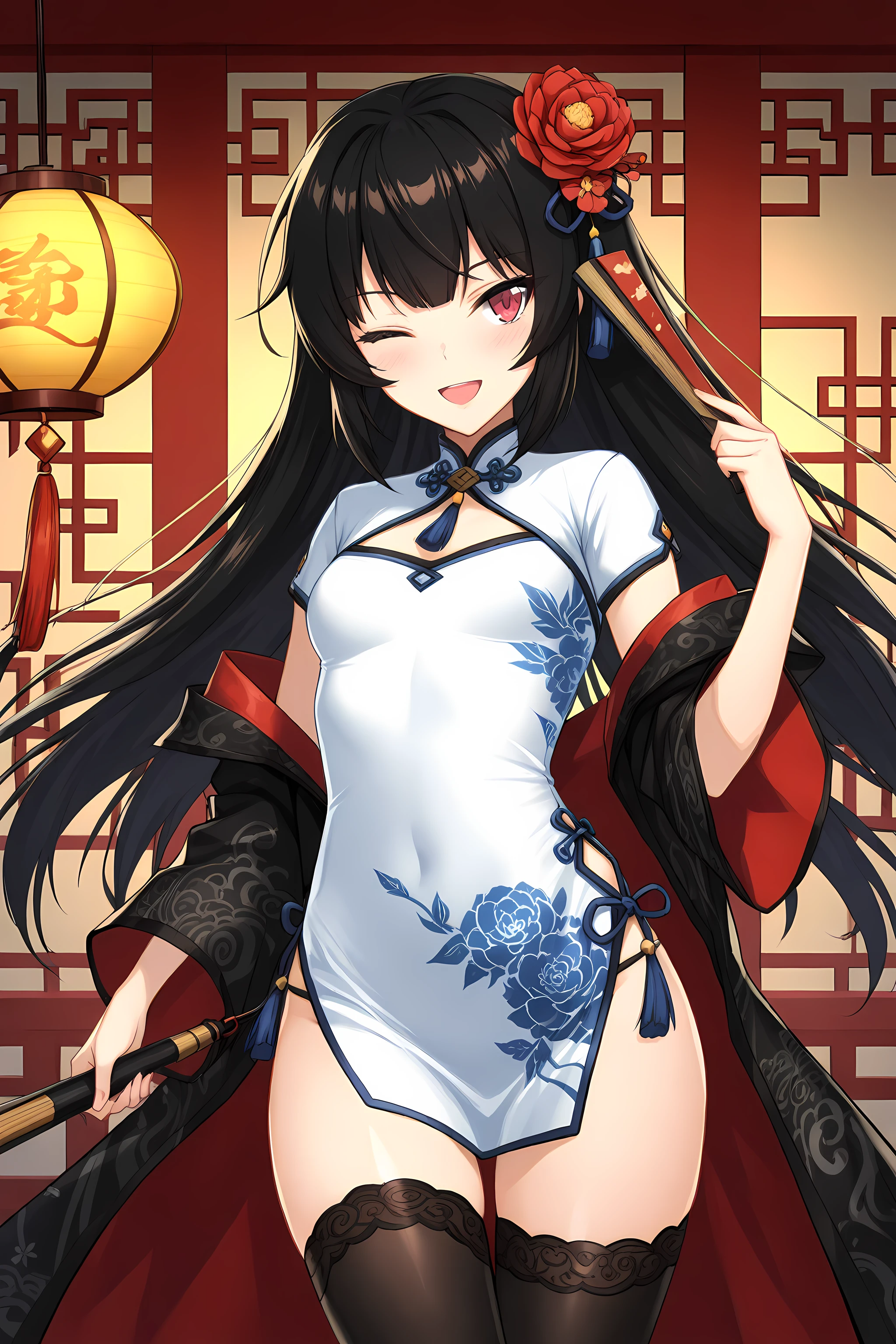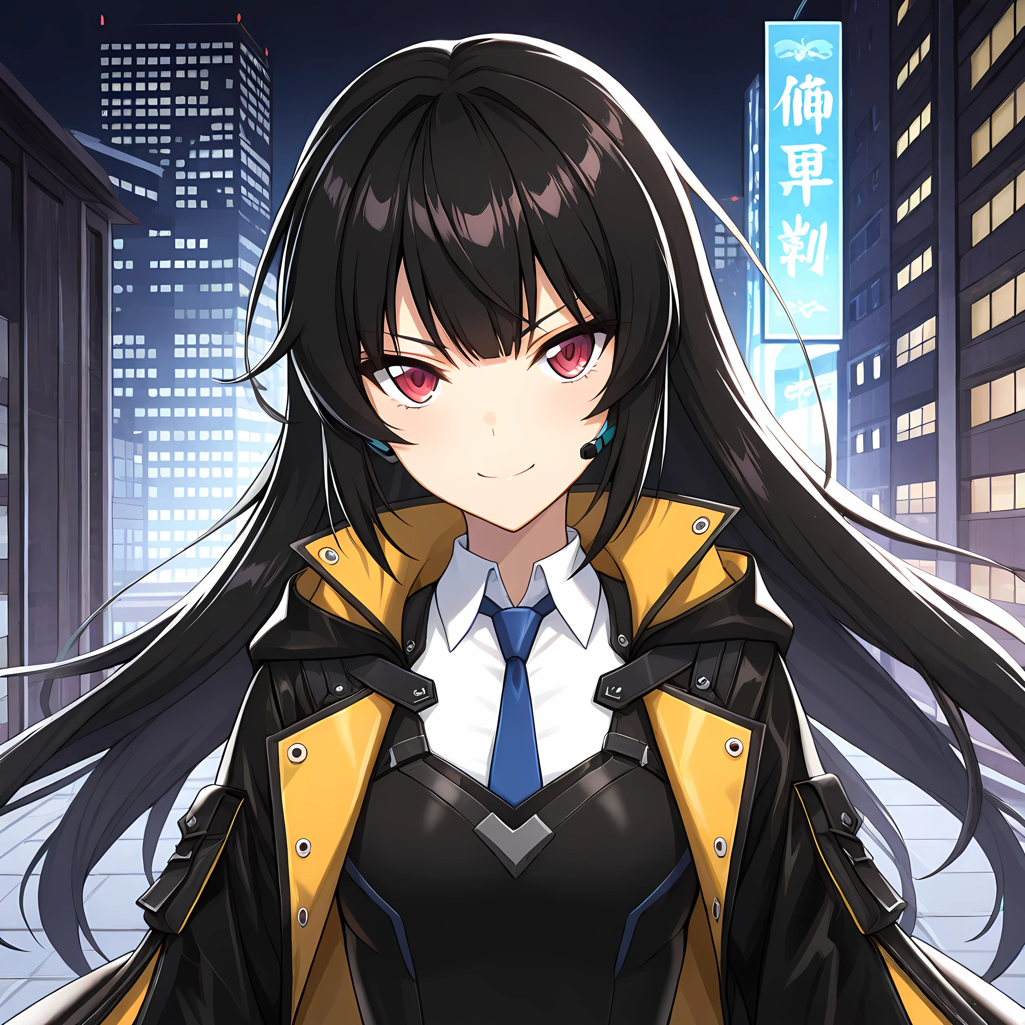 Activation tag of " xiaolin, 1girl, solo, black hair, red eyes, small breasts, long hair, "