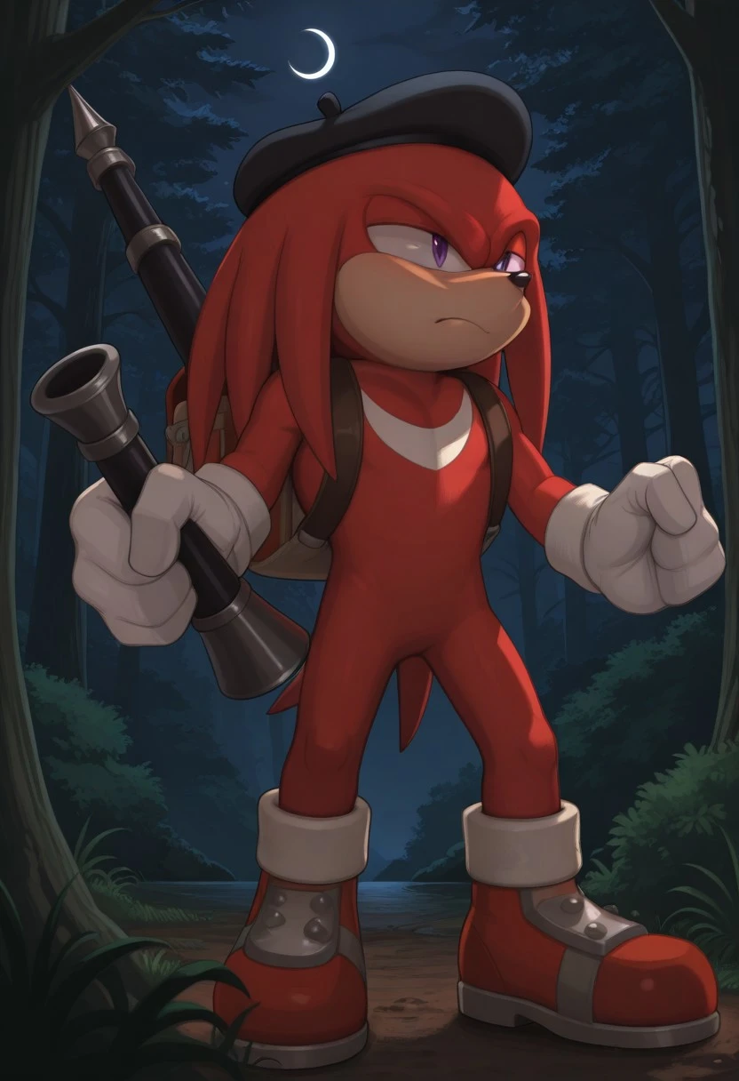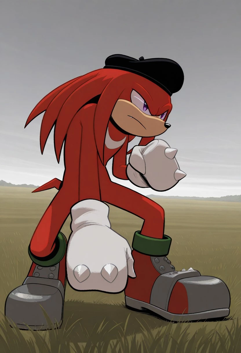 Anti-Knuckles, red skin, purple eyes, black beret, white crescent mark on chest, white gloves, red shoes