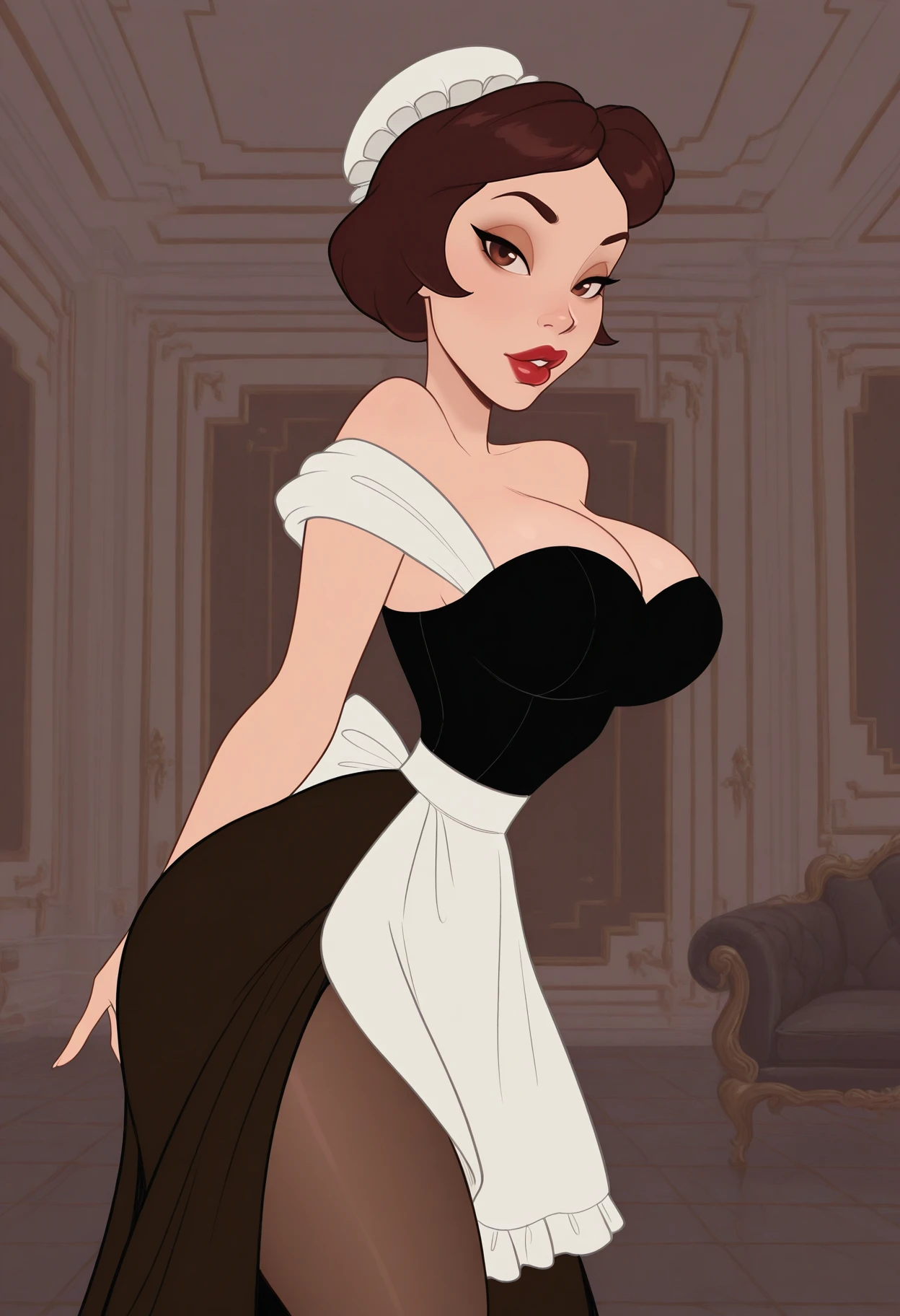 hat, bun cover, maid, dress, black dress, cleavage, off shoulder, bare shoulders, apron, maid apron, waist apron,white apron, pantyhose,