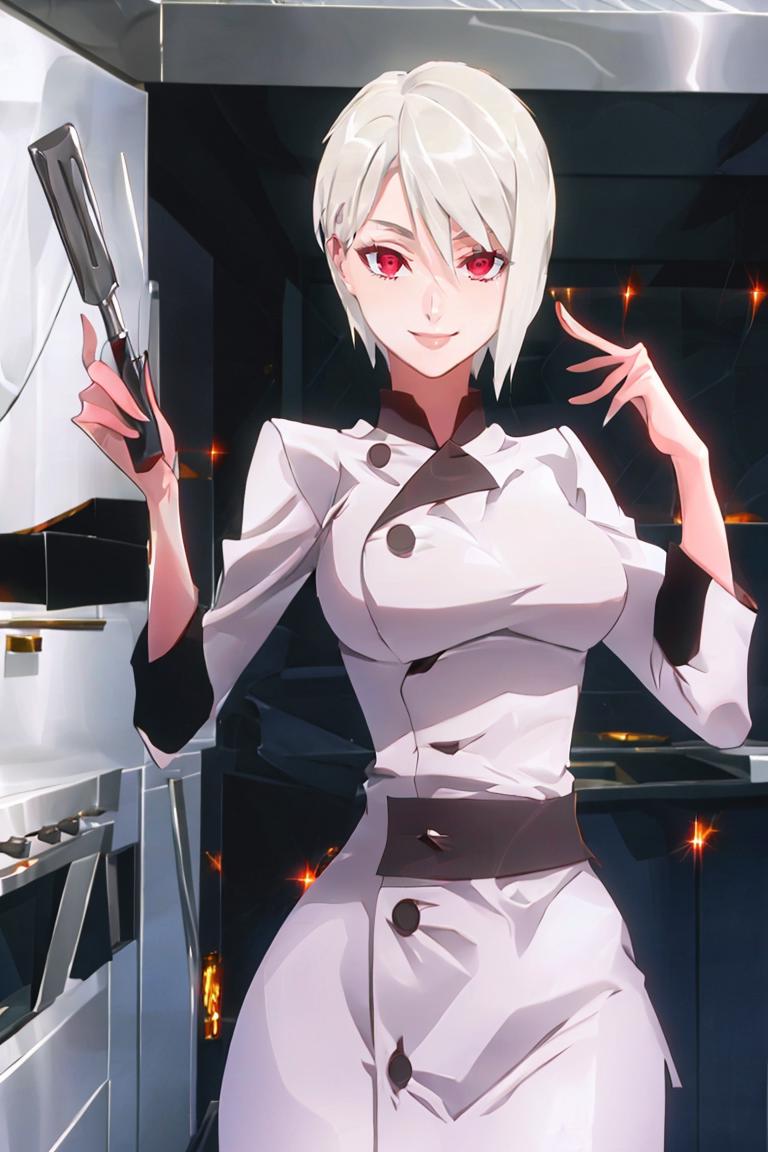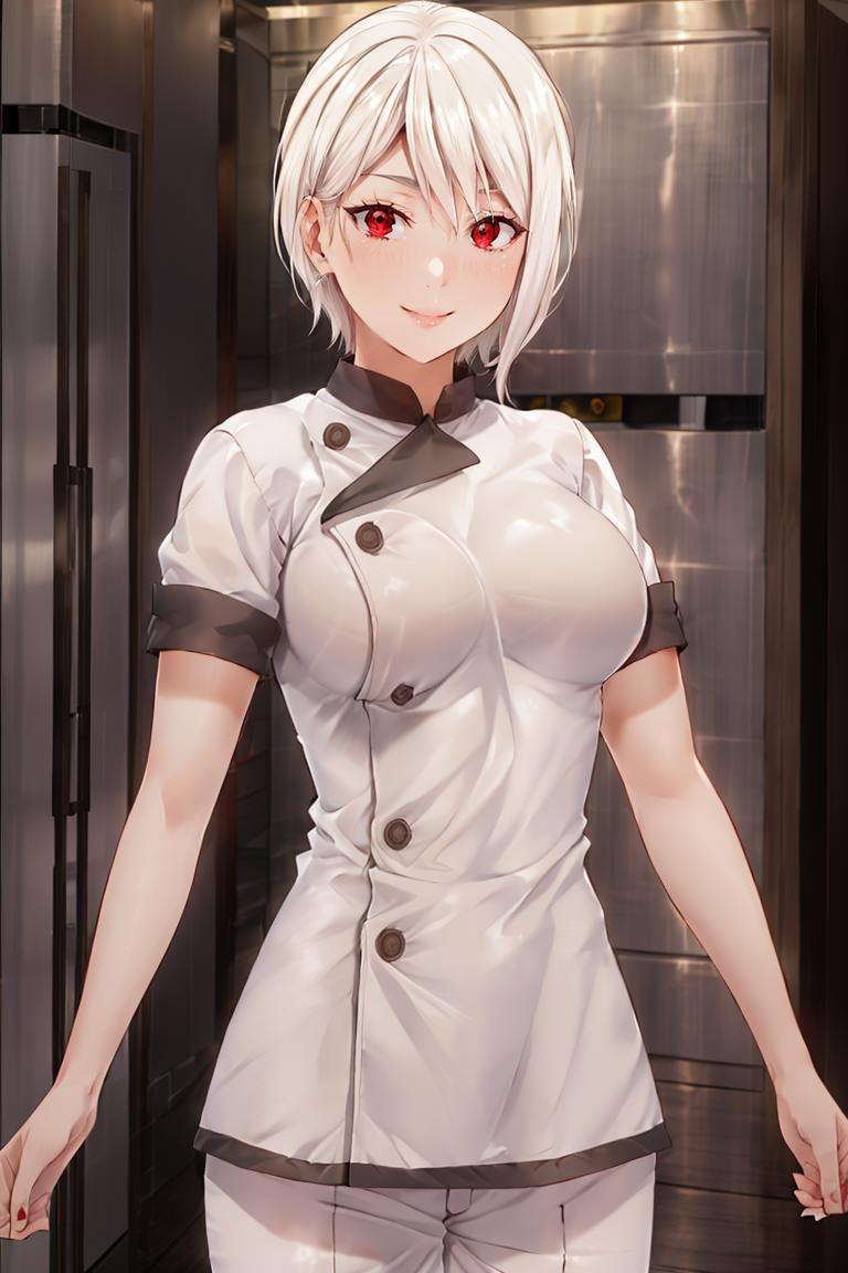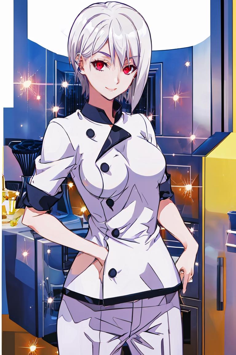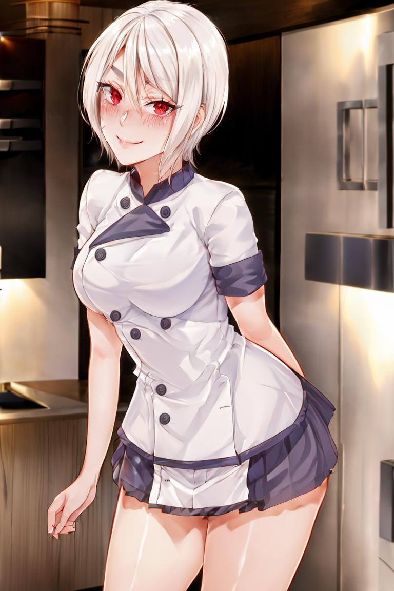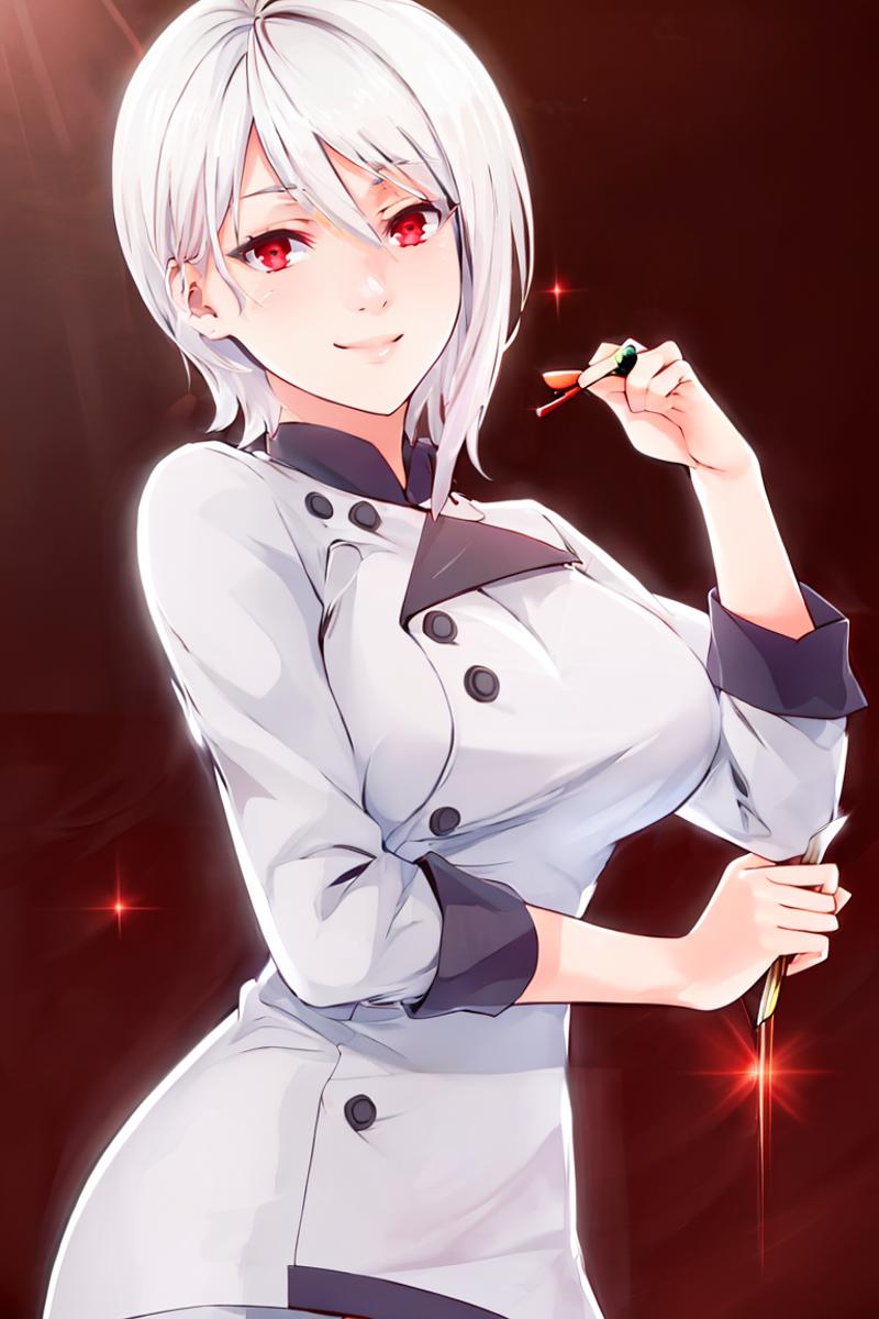 Nakiri_Alice_Shokugeki, white hair, short hair, red eyes, chef