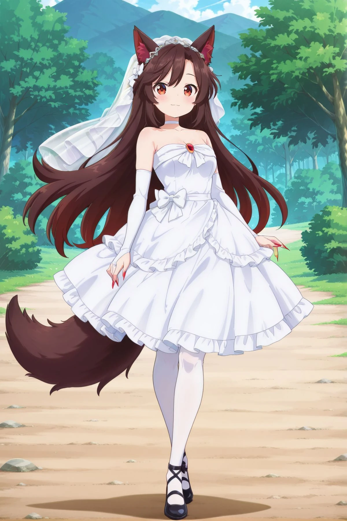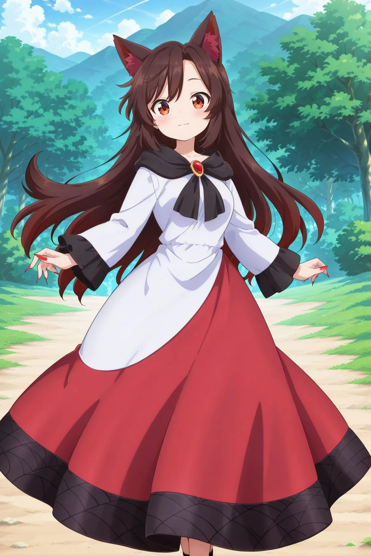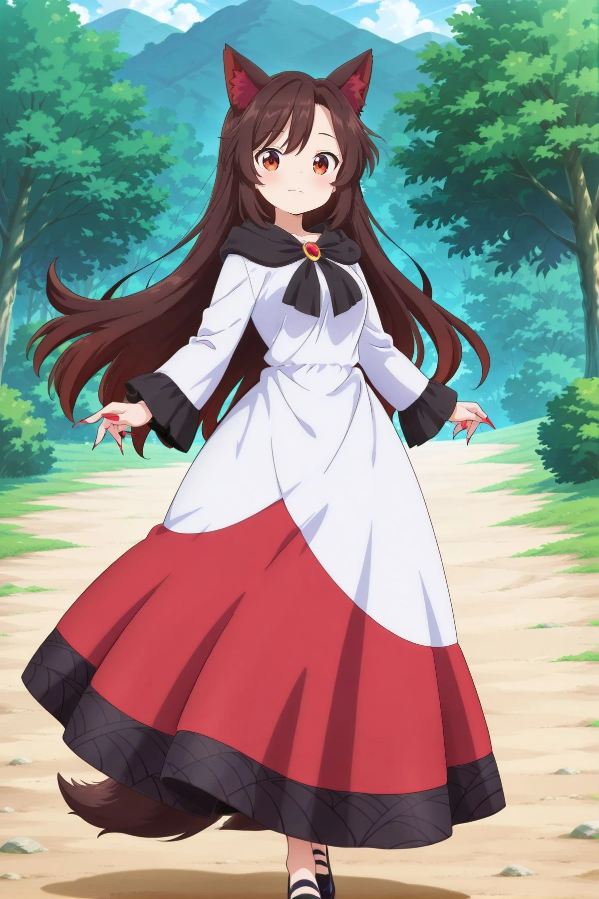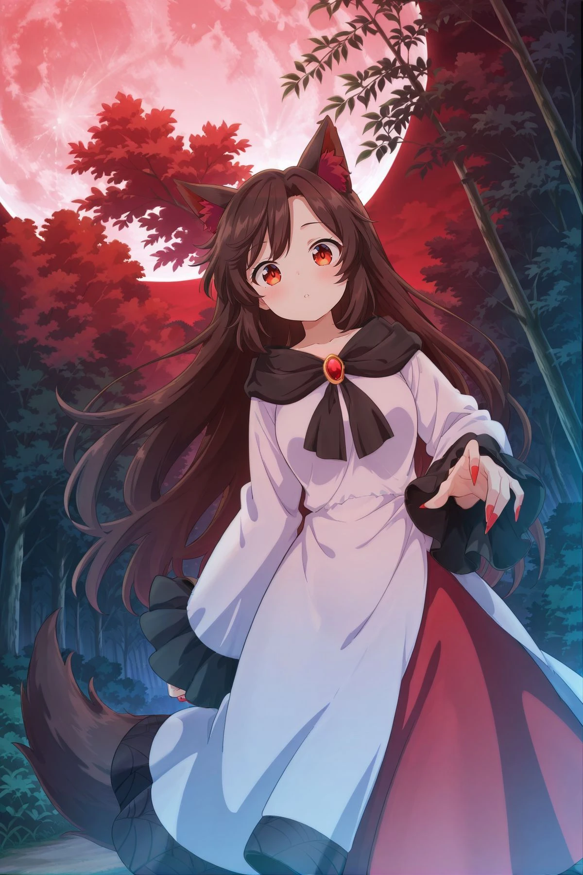 imaizumi kagerou, 1girl, solo, red eyes, brown hair, long hair, wolf ears, wolf tail, long fingernails,white dress, red skirt,Alternative :