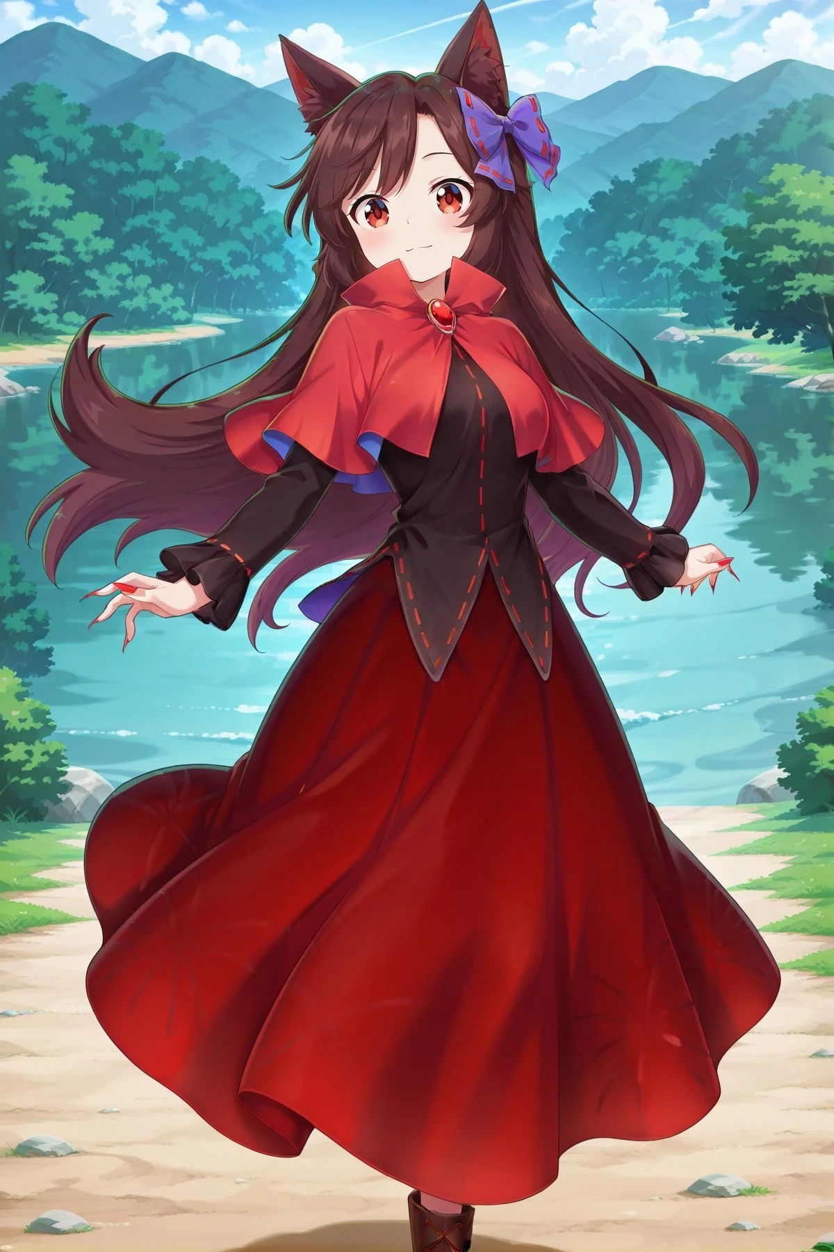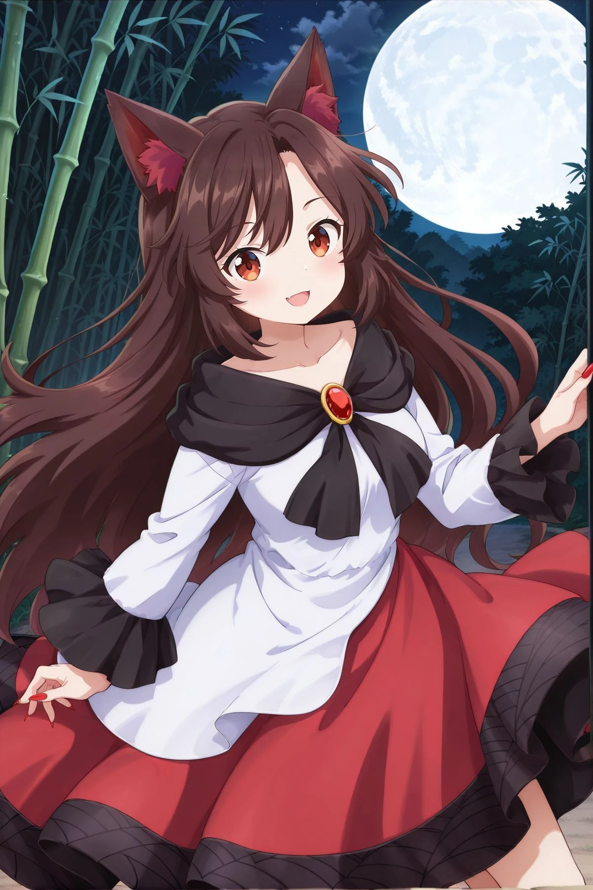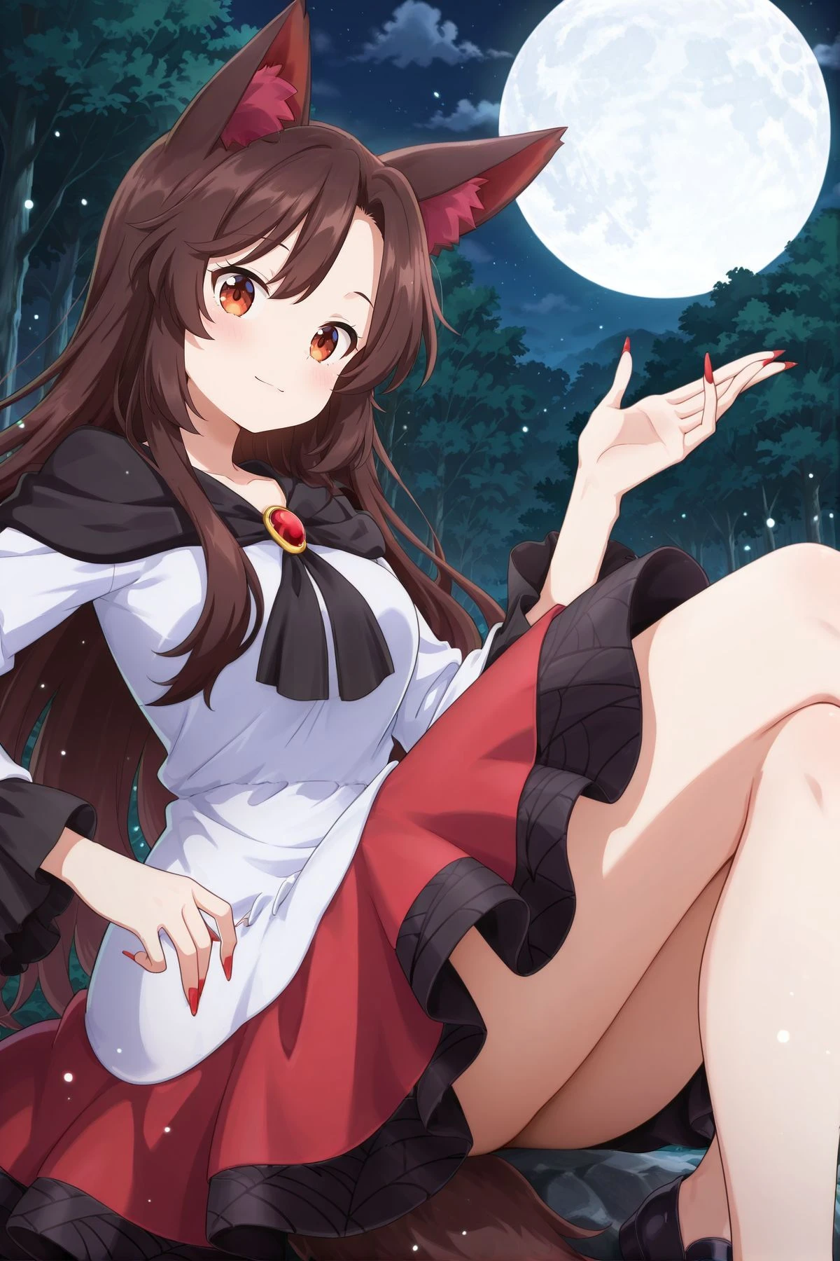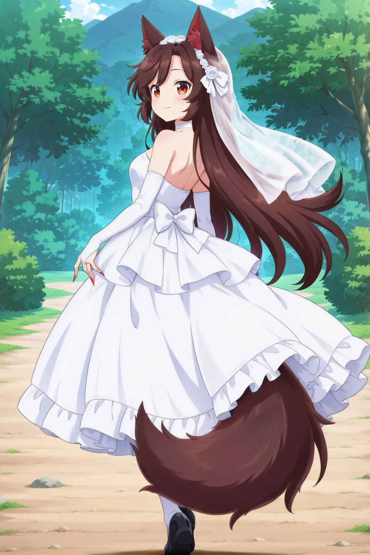 imaizumi kagerou, 1girl, solo, red eyes, brown hair, long hair, wolf ears, wolf tail, long fingernails,white dress, red skirt,Alternative :