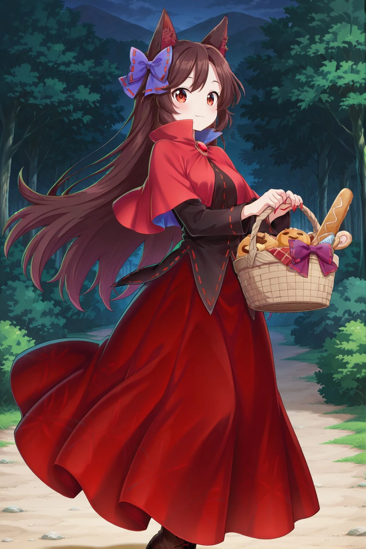 imaizumi kagerou, 1girl, solo, brown eyes, brown hair, long hair, wolf girl, wolf ears, wolf tail, long fingernails, red nails, imaizumi kagerou \(moonlit white werewolf\), alternate costume, white veil, bridal veil, white choker, white dress, wedding dress, strapless dress, frilled dress, white gloves, elbow gloves, bridal gauntlets, back bow, white bow, white pantyhose, black shoes,black neckerchief, two-tone dress, white dress, red dress, long sleeves, black shoes,imaizumi kagerou, 1girl, solo, brown eyes, brown hair, long hair, wolf girl, wolf ears, wolf tail, long fingernails, red nails,, imaizumi kagerou \(have an animal cookie\), alternate costume, sekibanki \(cosplay\), hair bow, purple bow, ribbon-trimmed bow, red brooch, red capelet, brown shirt, long sleeves, red skirt, long skirt, brown boots, holding basket,Alternative :