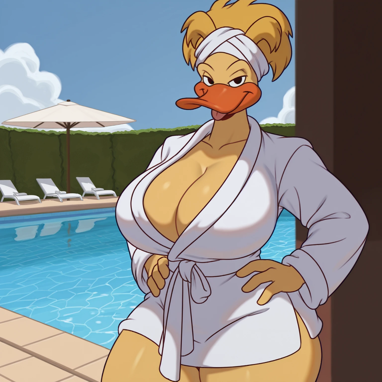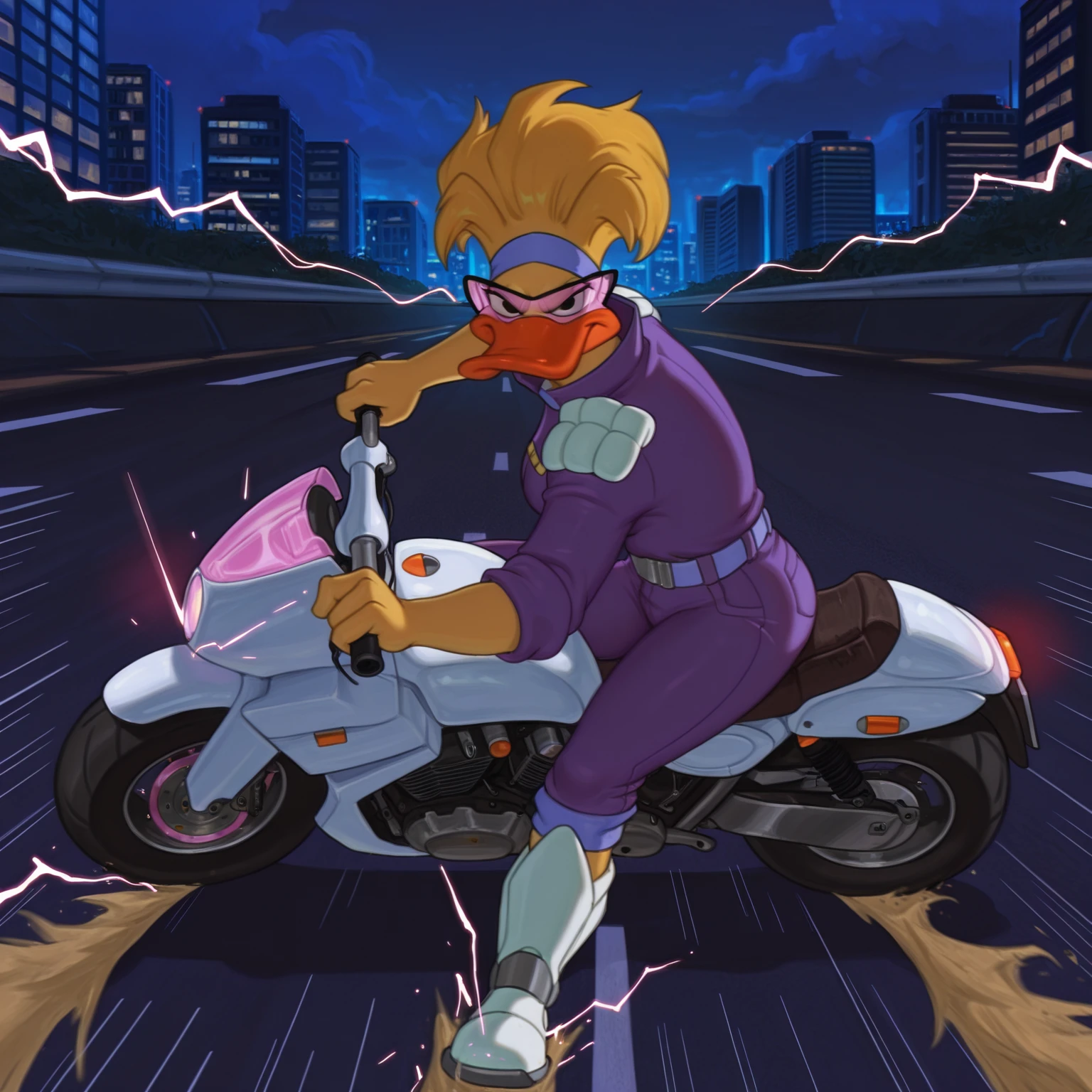 Positive Prompts: TanyaVF, furry female, anthro, avian, duck, yellow hair, medium hair, hair up, light-blue headband, white sclera, black eyes, solid eyes, black sunglasses, pink lens, orange beak, yellow skin