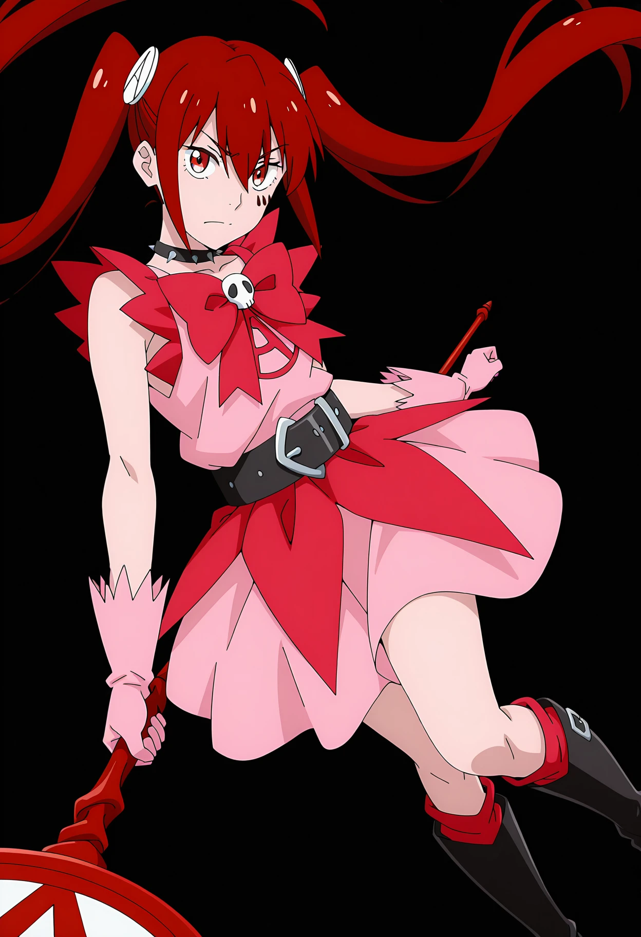 magical-girl, red dress, pink dress, pink gloves, skull, red bow, belt, boots, black footwear