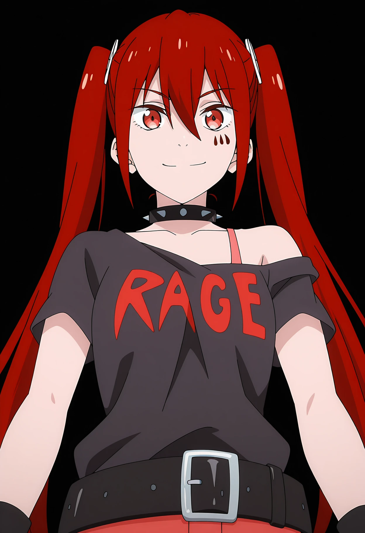 1girl, solo, anarchy, long hair, twintails, red hair, red eyes, facial mark, hair between eyes, hair ornament