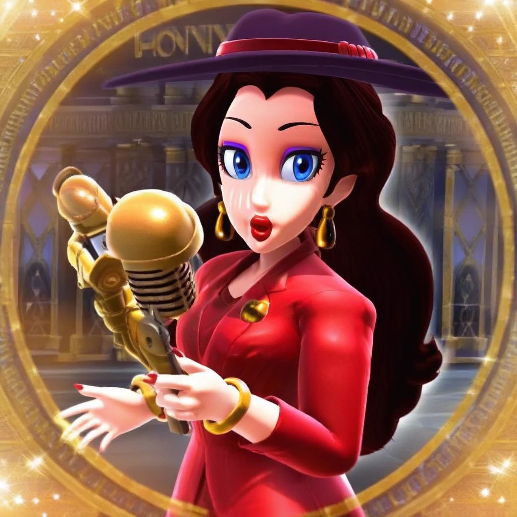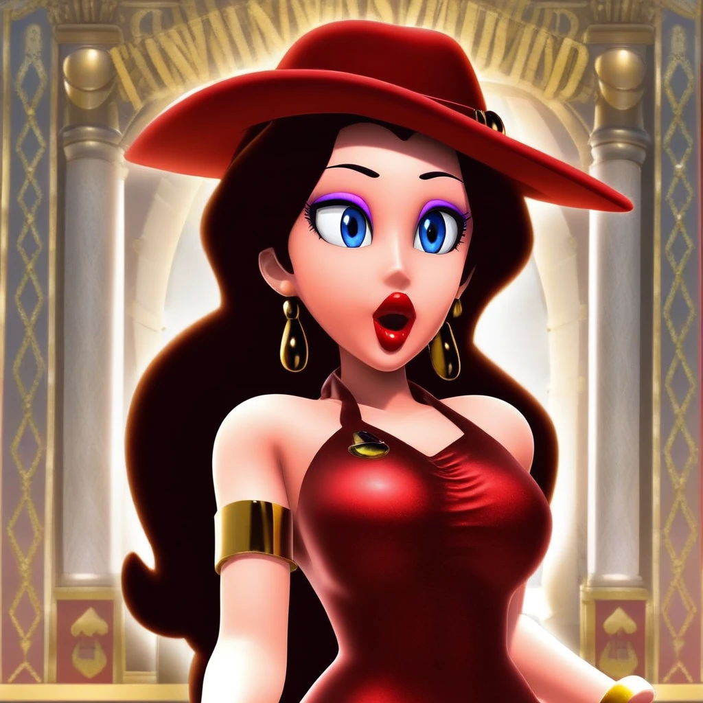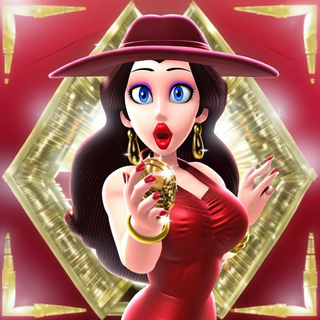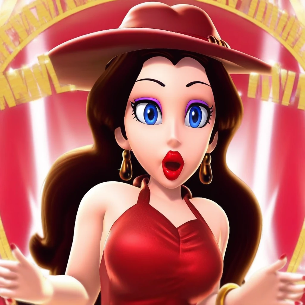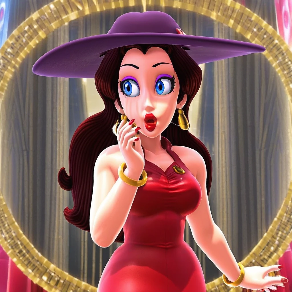 1Girl, Pauline, long brown hair, blue eyes, purple eyeshadow, big lips, red lipstick, gold earrings, sleeveless red dress, gold bracelet around arm, red heels