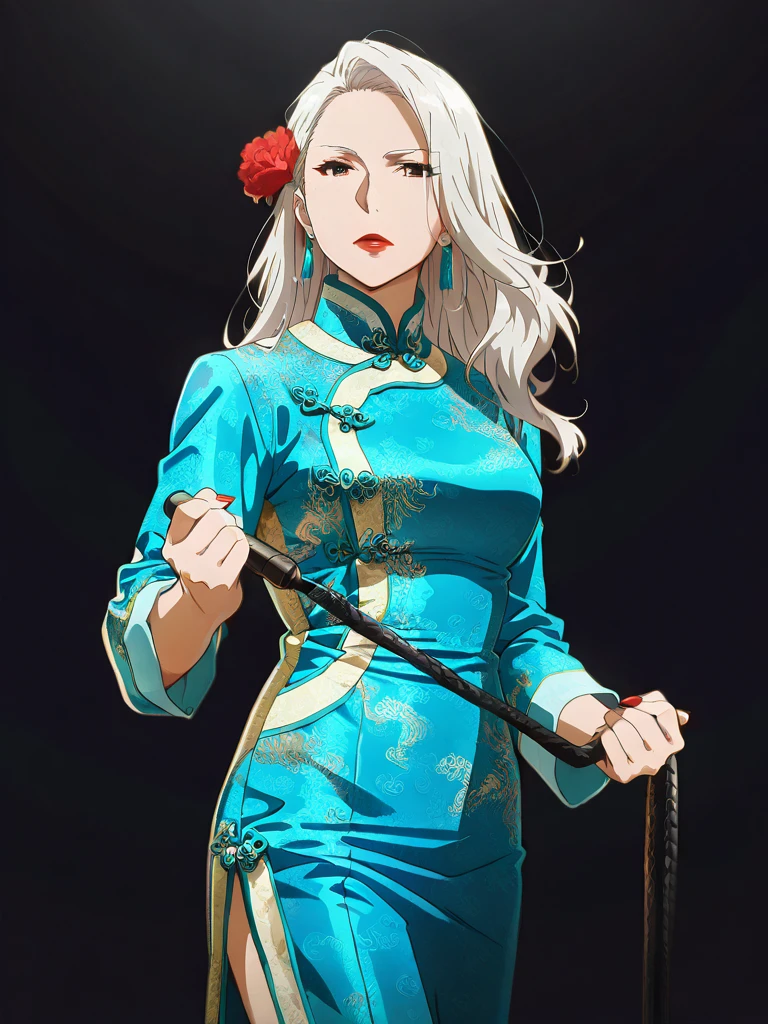 Chinese_dress_L1, long platinum hair, red flower in hair, turquoise cheongsam, qipao dress, elegant chinese dress, satin fabric,asian-inspired fashion,