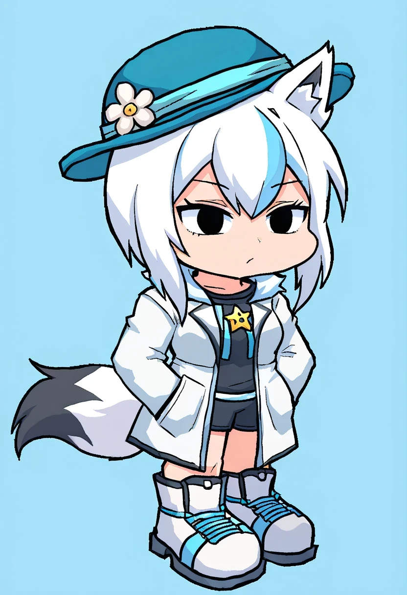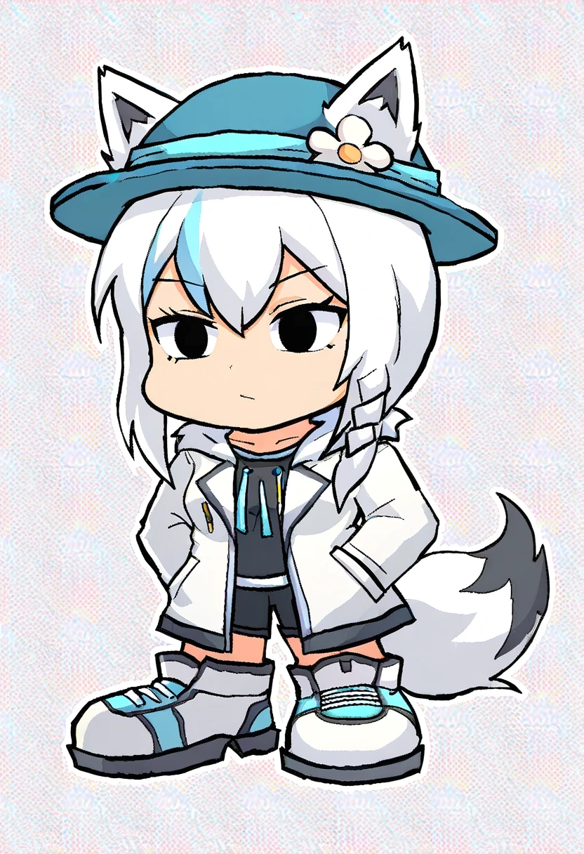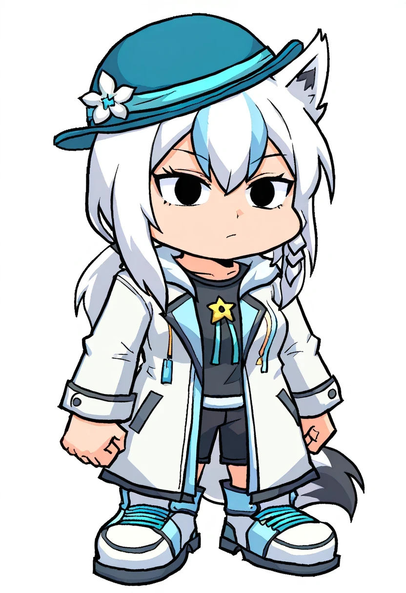 ShirakamiFubukiFNF, 1girl, white hair, fox ears, white tail, white coat, blue hat, white-orange flower on hat, black shirt, black skirt, white and blue shoes, sky blue laces, short, chibi, black eyes,