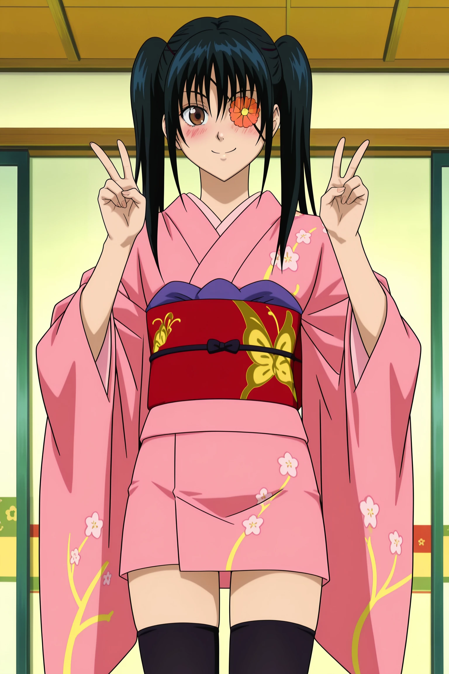 y&gyuutimesk1p, 1girl, solo, twintails, black hair, brown eyes, orange flower eyepatch, black thighhighs, pink kimono, zettai ryouiki, short kimono