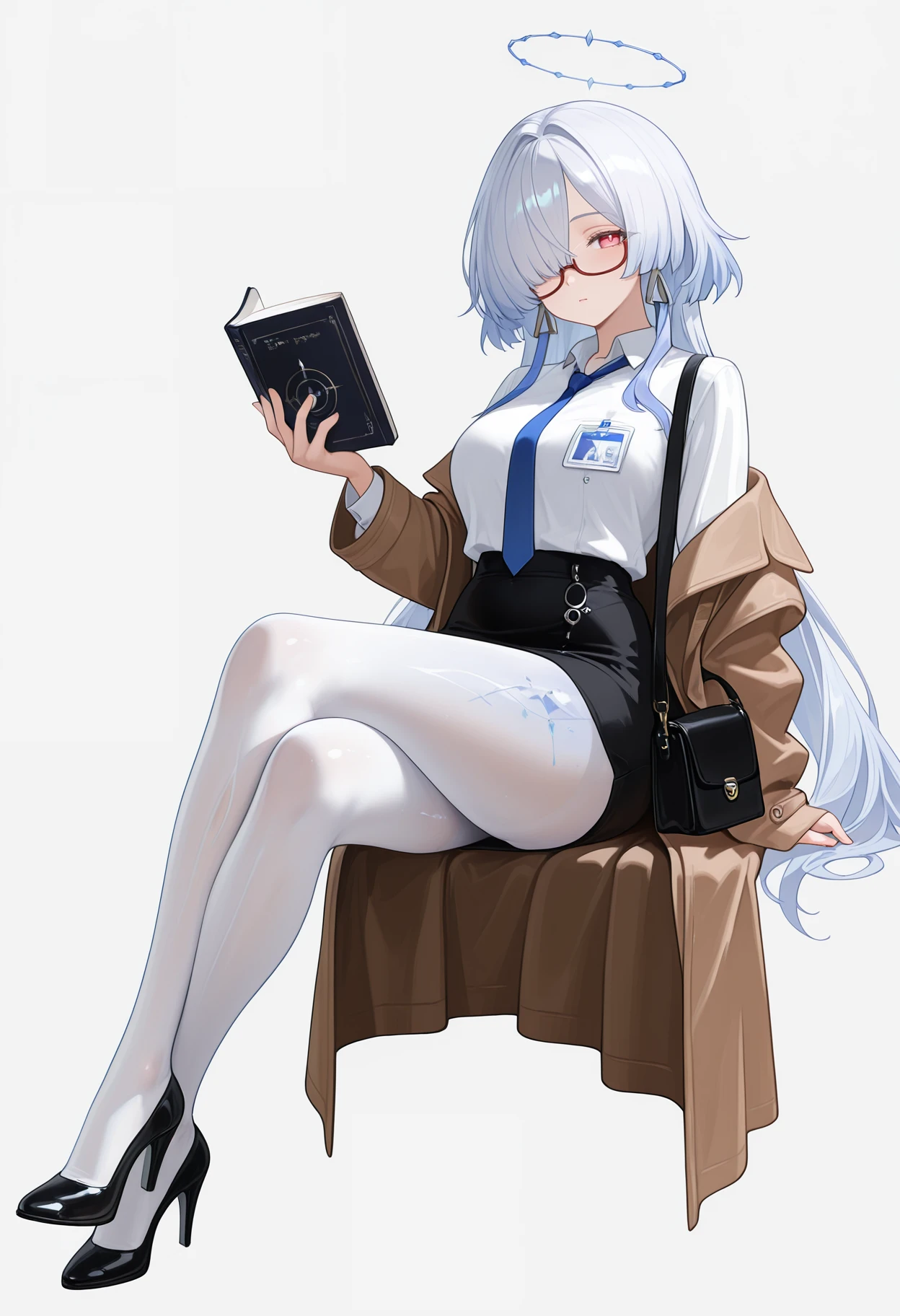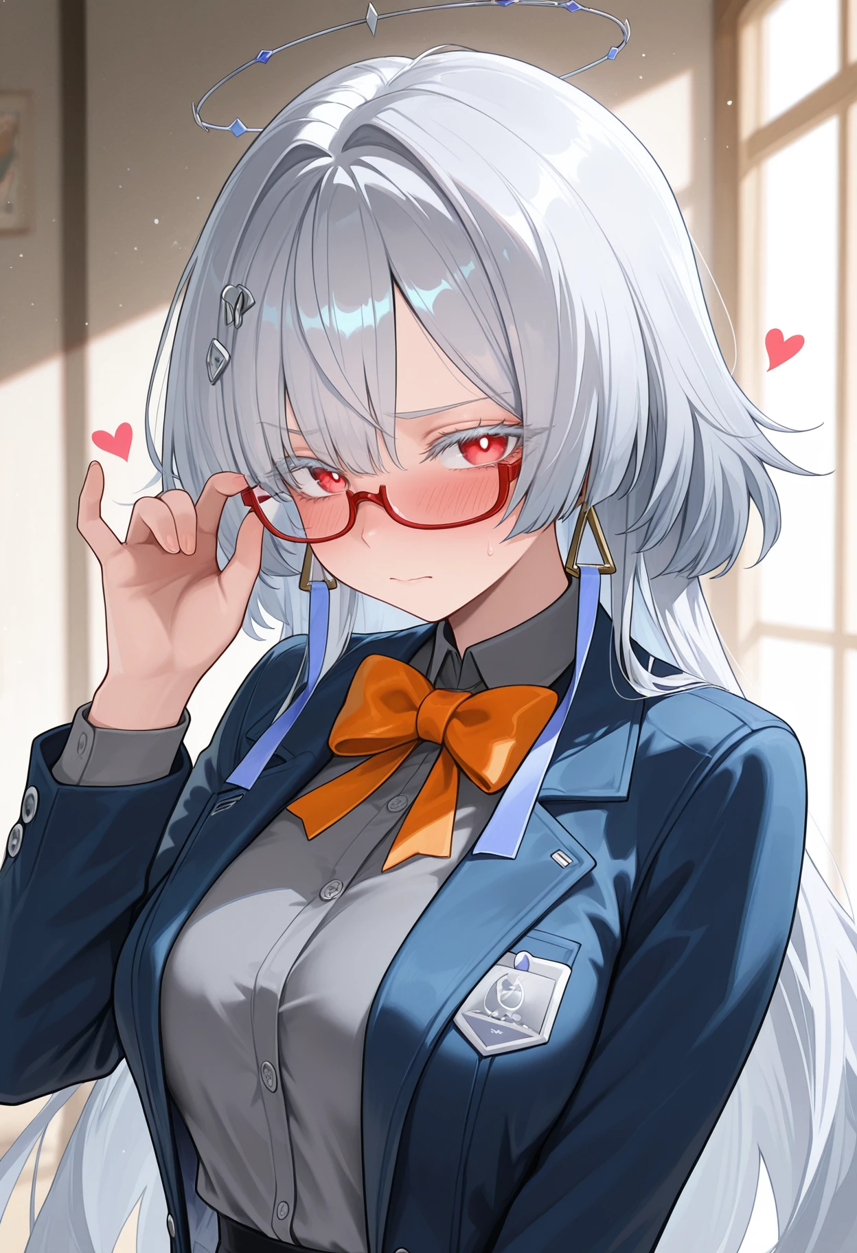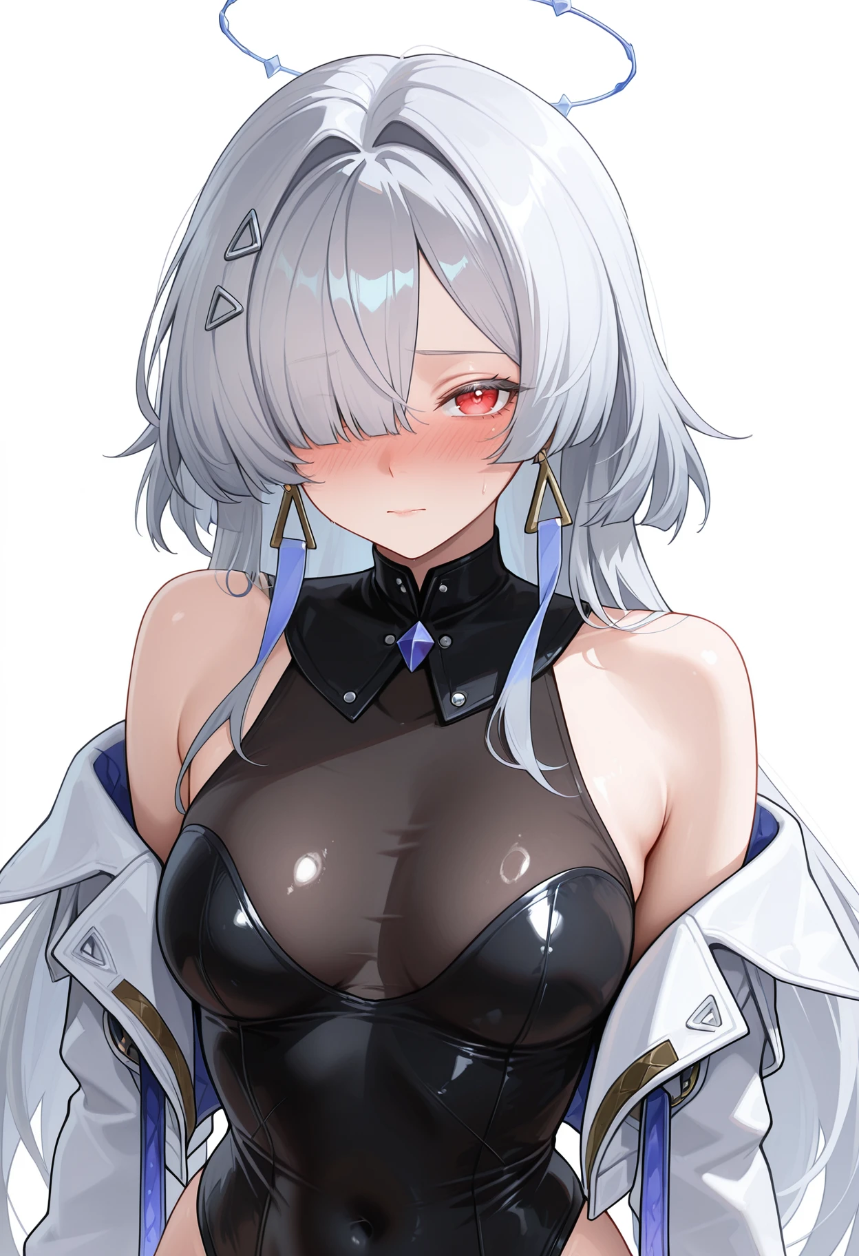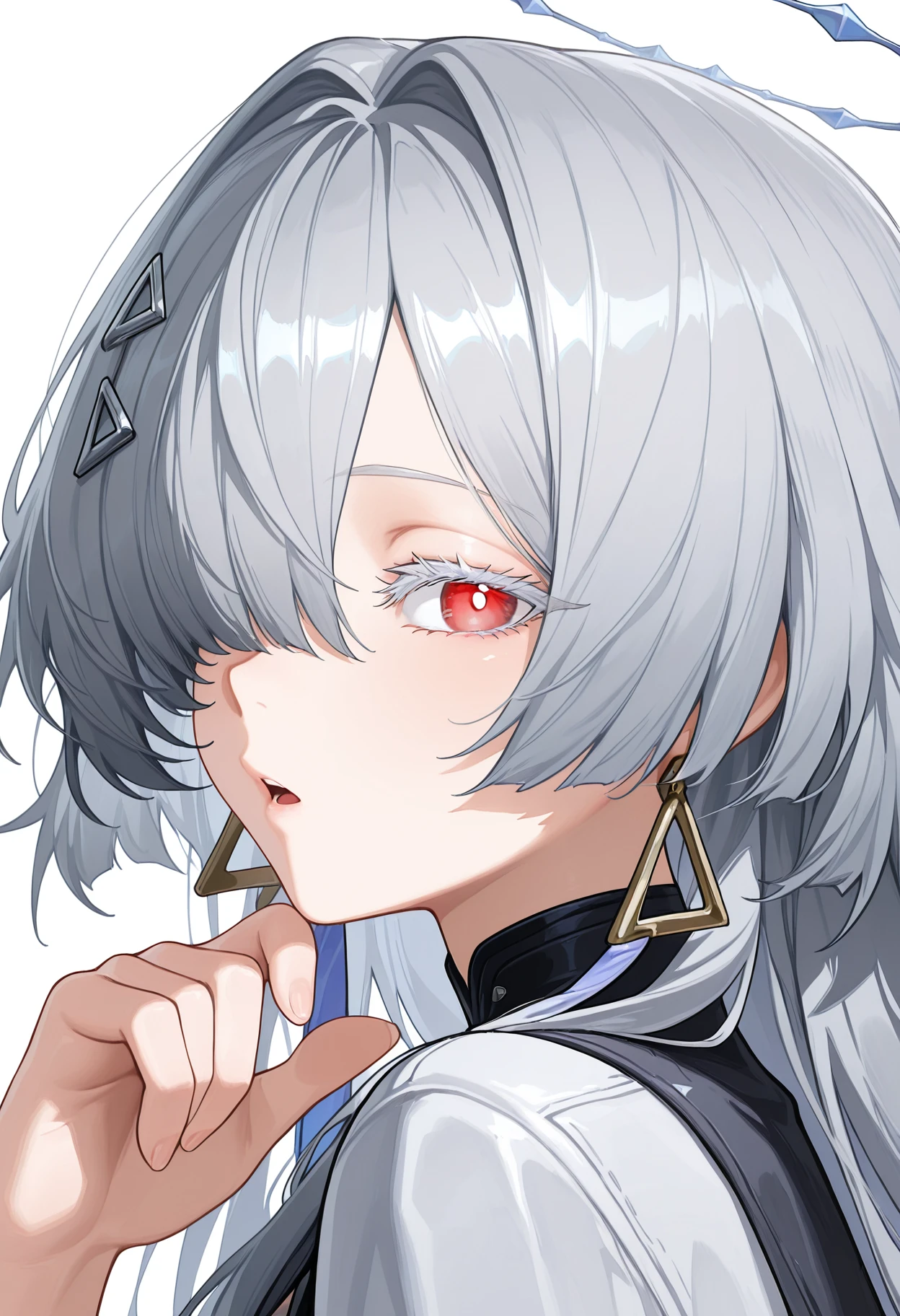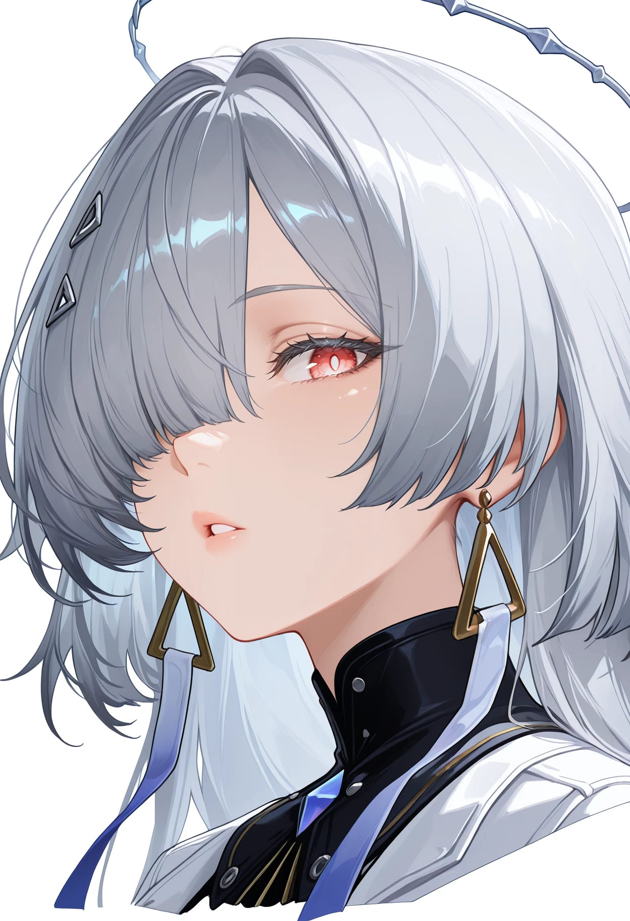 mornye \(wuthering waves\), colored eyelashes, grey hair, hair ornament, hair over one eye, halo, red eyes, triangle earrings
