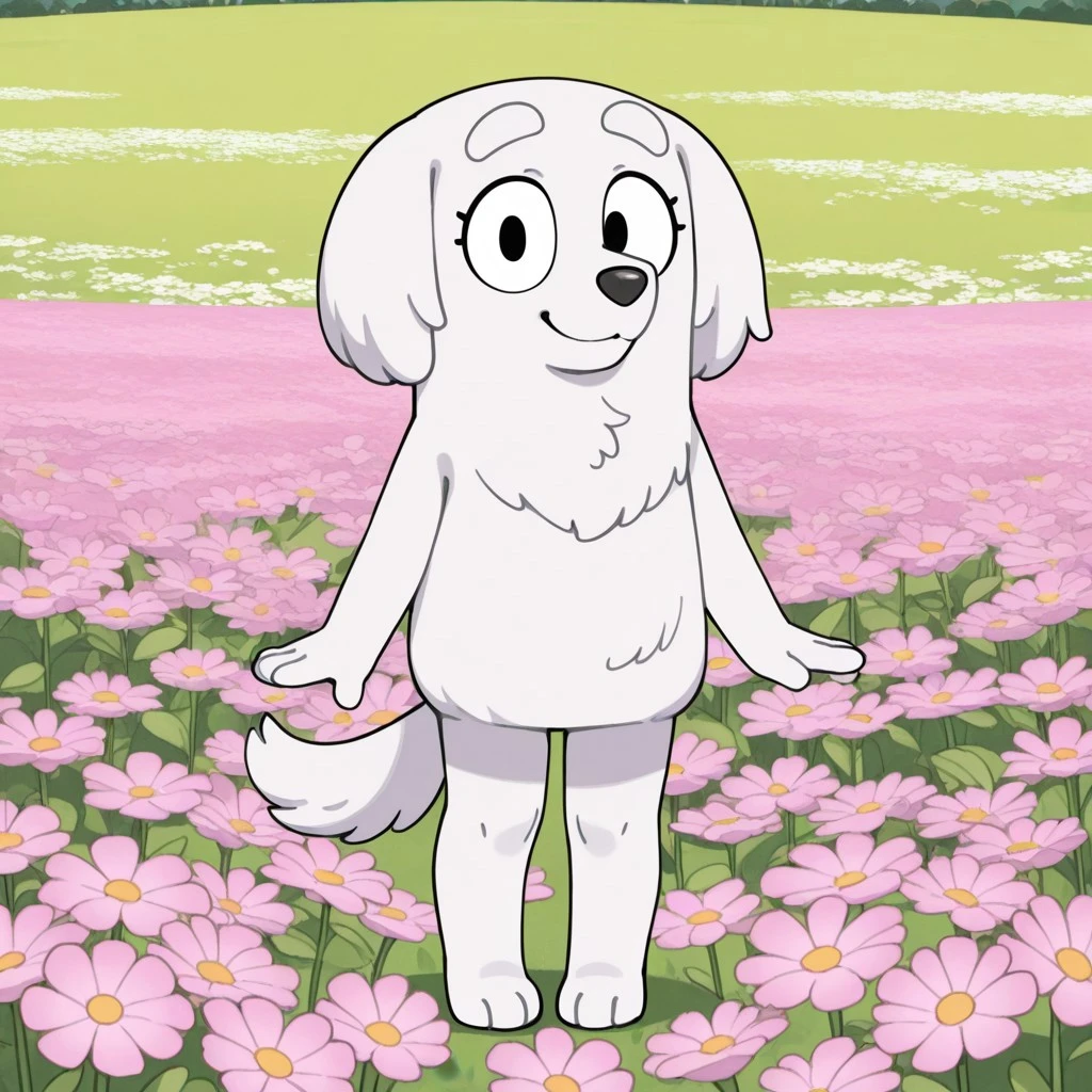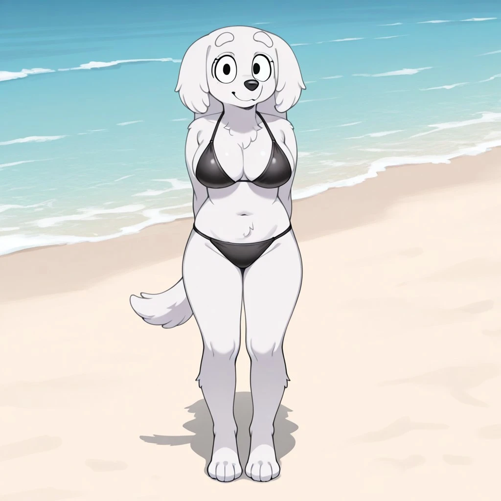 dog, dog girl, maltese, white fur, black eyes, black nose, floppy dog ears, dog tail,