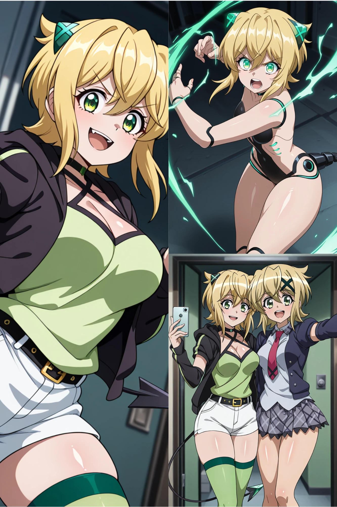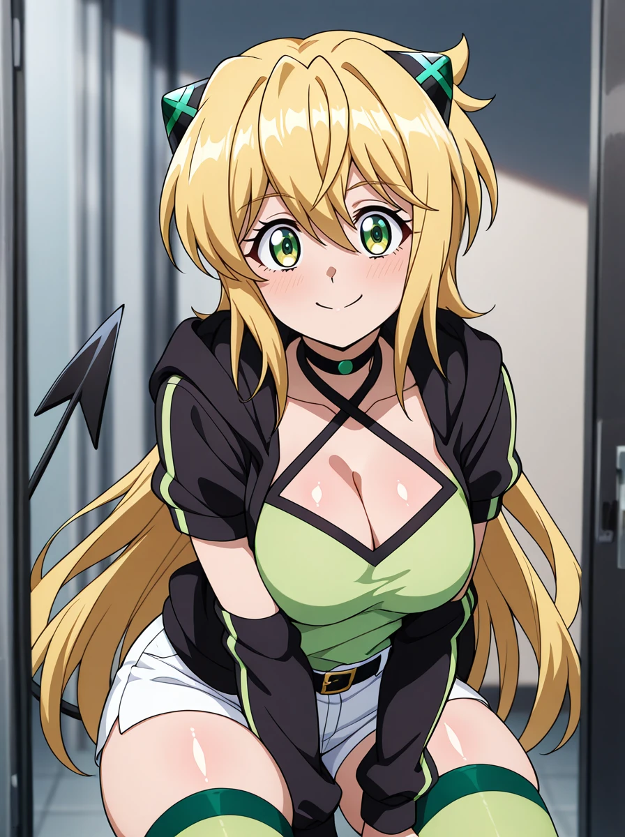 Casual look: kirikaanother, short hair, green thighhighs, white_shorts, hood demon tail, belt,green_shirt cleavage