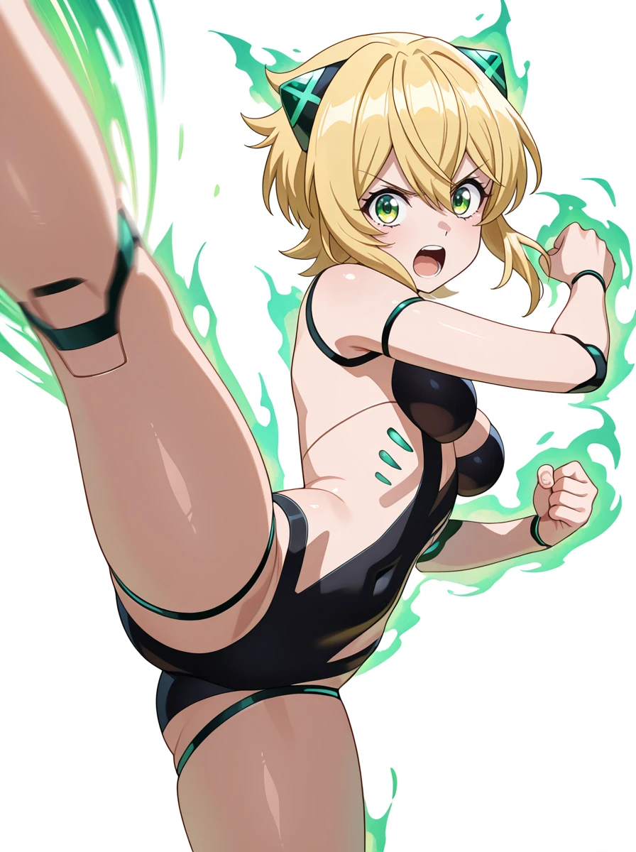 Main look: blonde hair, 1girl, green eyes, hair ornament,