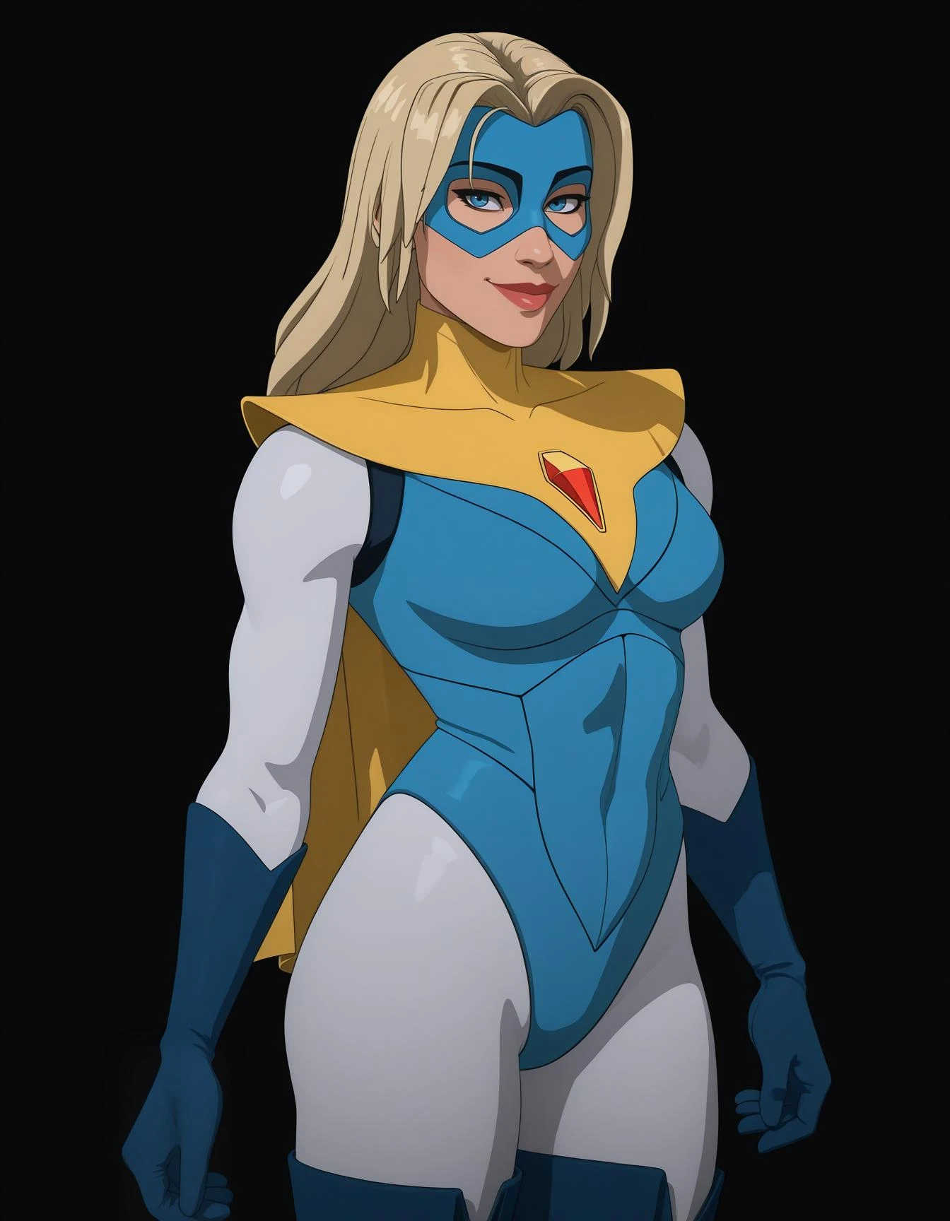 • domino mask, cape, white ????????, blue leotard, gloves, thigh boots -the white ankle stripe is a bit inconsistent on her boots-