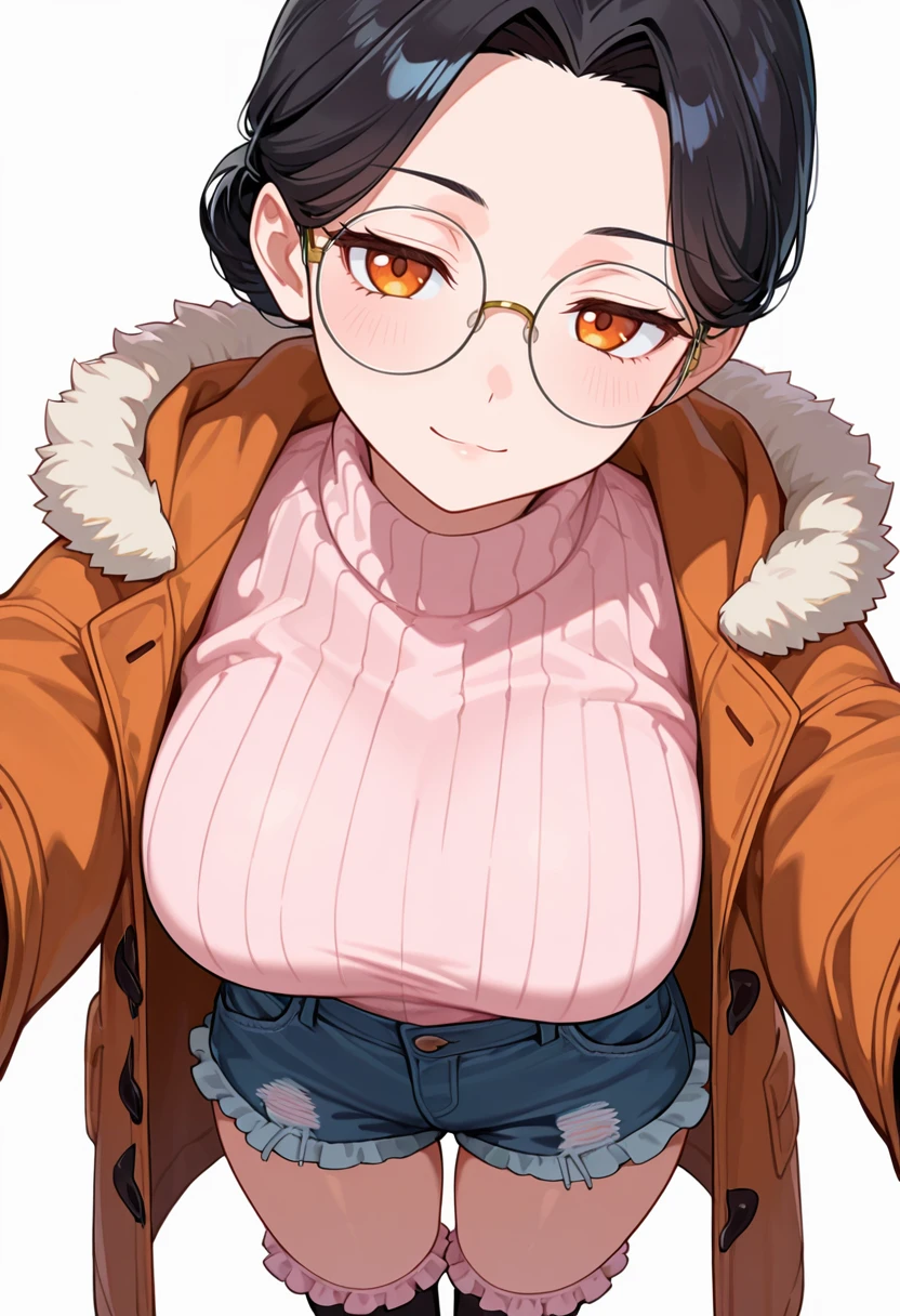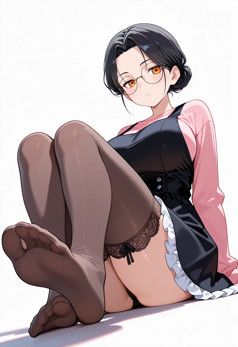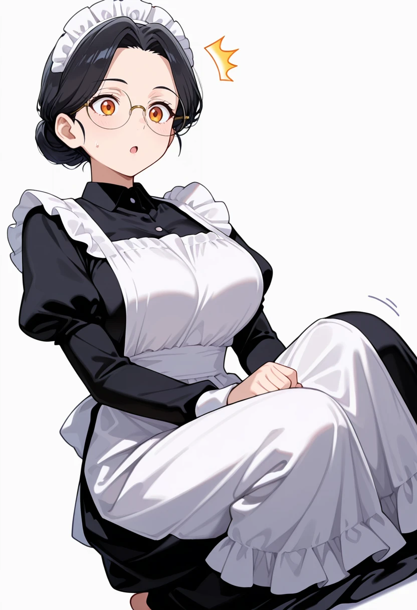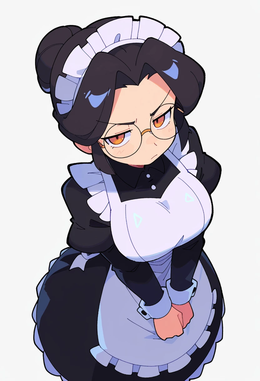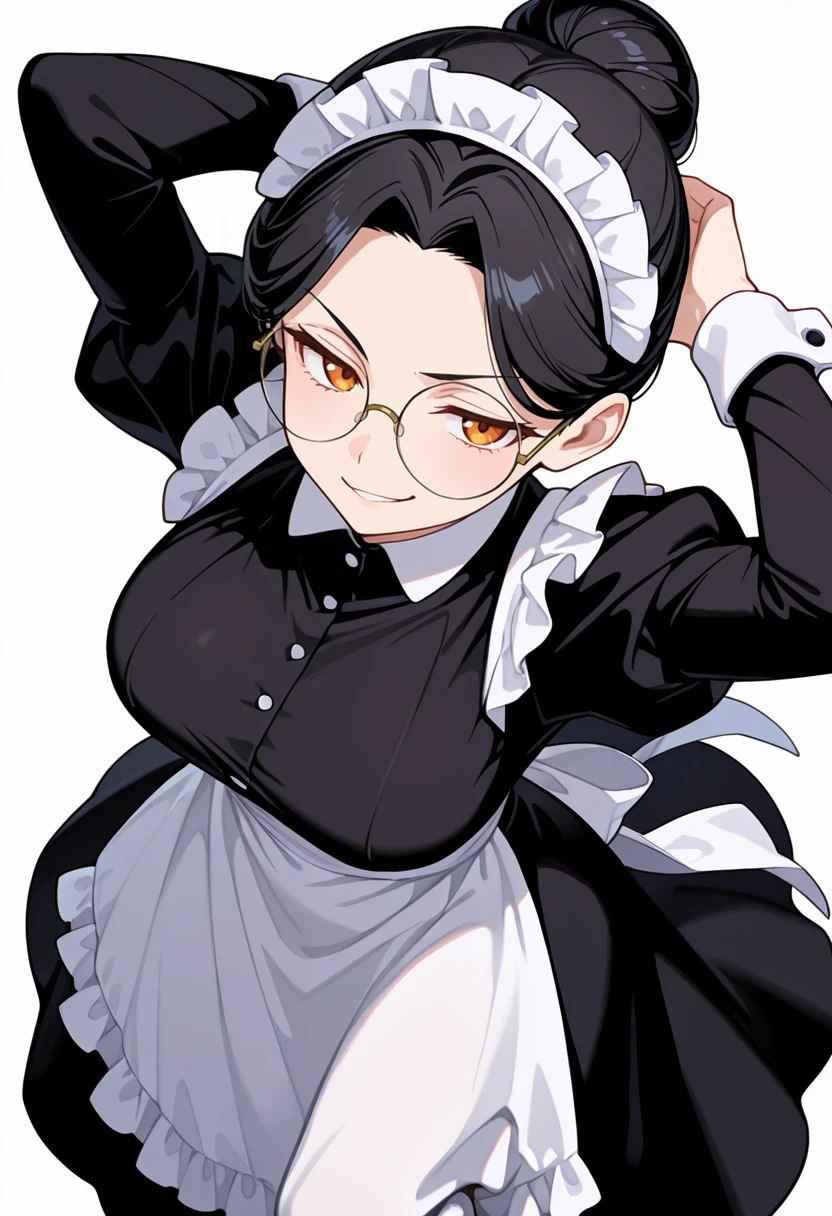 mailen_cnr, 1girl,black hair,single hair bun, bangs,orange eyes,round eyewear,large breasts,