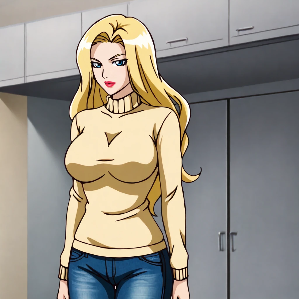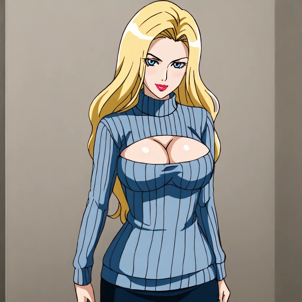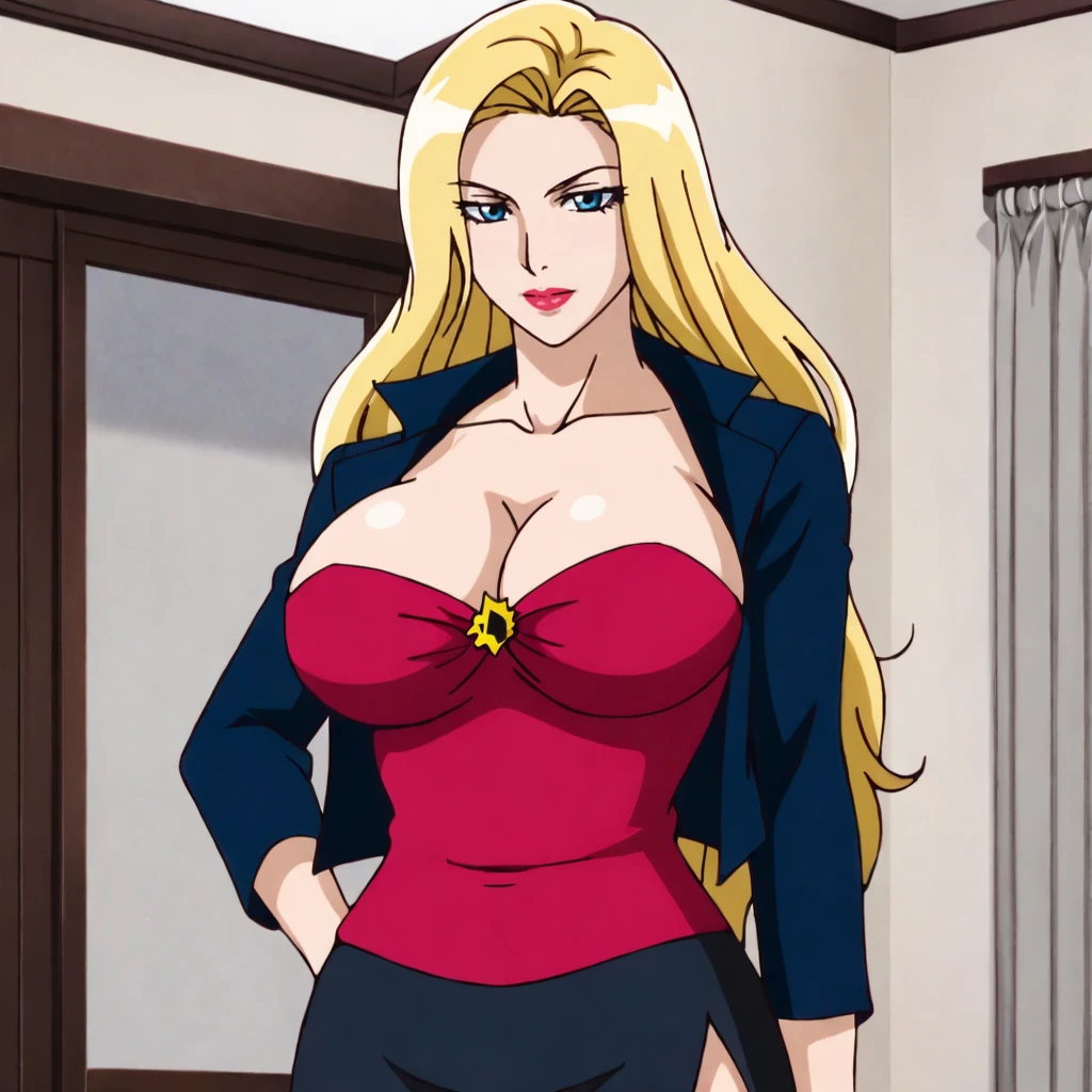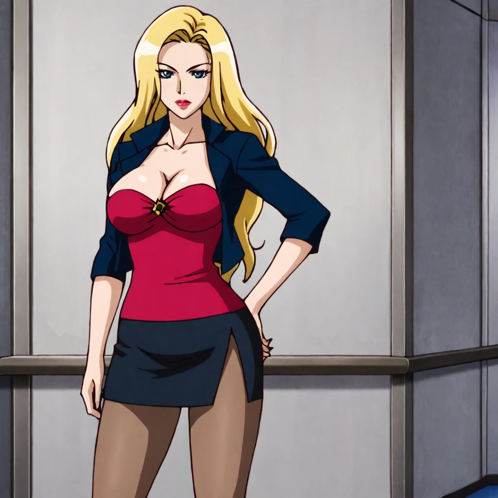 Trigger with dress: MissX, 1girl, solo, blonde hair, large breasts, pantyhose, long hair, cleavage, blue eyes, pencil skirt, jacket, makeup, lipstick, cowboy shot