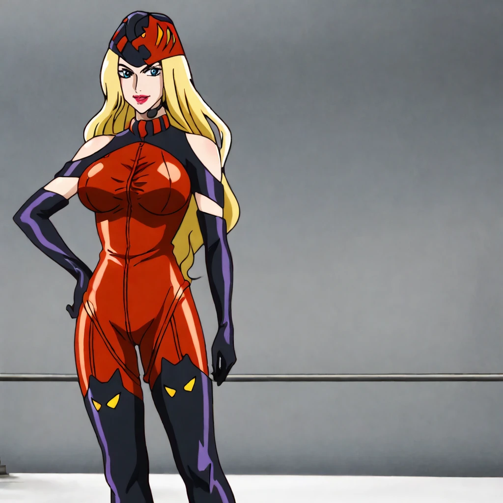 Trigger with hat: MissXJudgeHat, 1girl, blonde hair, blue eyes, large breasts, elbow gloves, red bodysuit, lipstick, makeup, long hair, mask, helmet, clothing cutout, cowboy shot