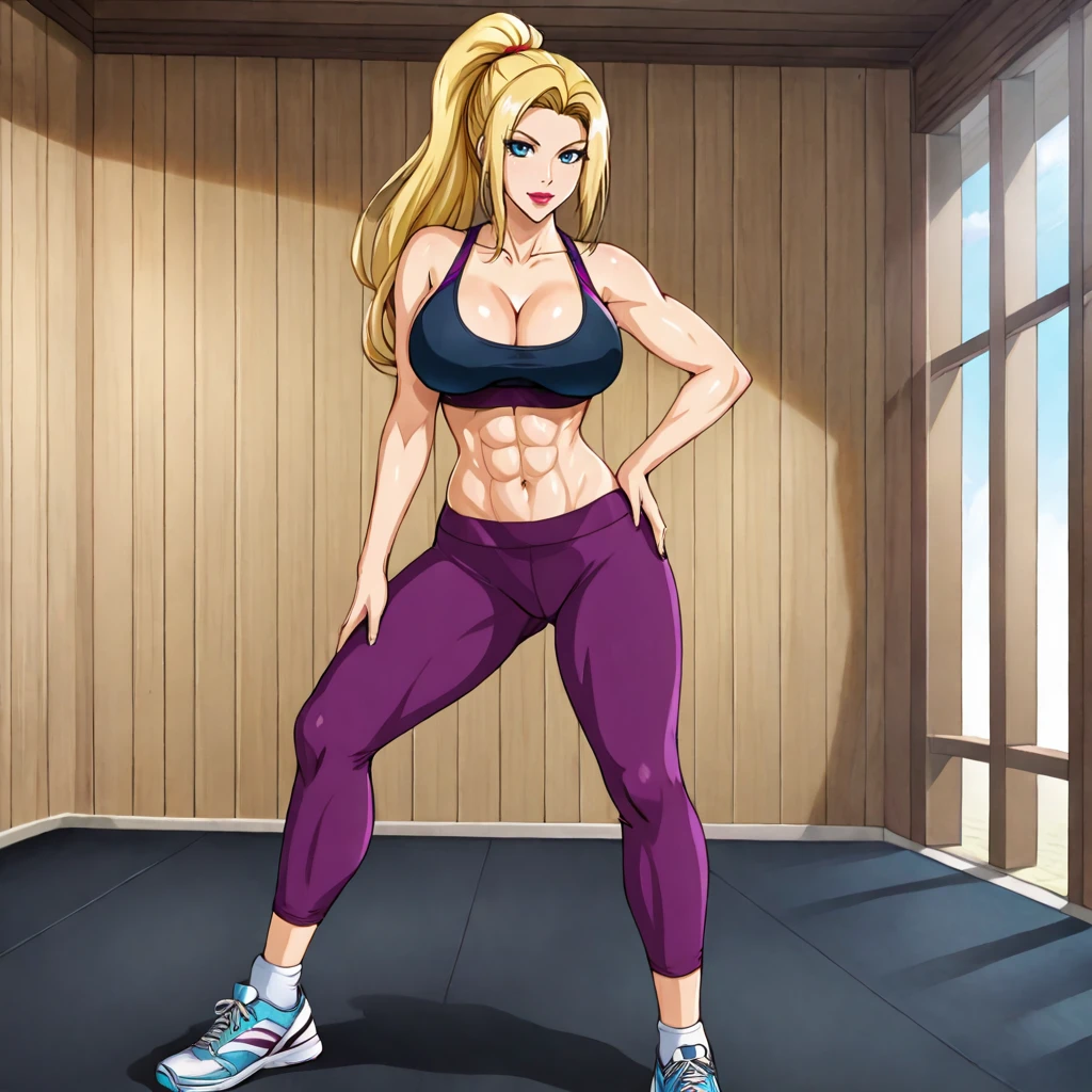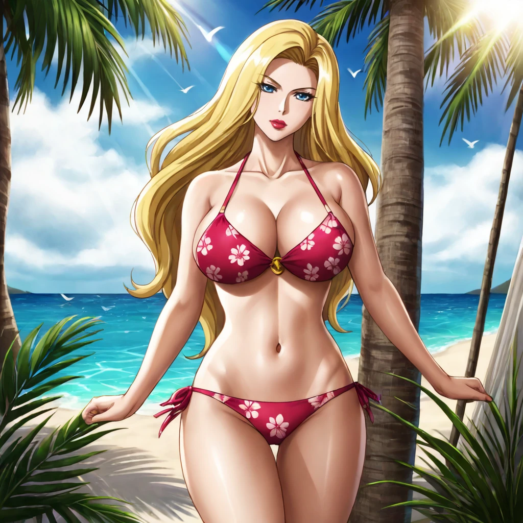 Trigger : MissXJudge, 1girl, solo, blonde hair, wrestling outfit, long hair, large breasts, blue eyes, red leotard, fingerless gloves, lipstick, makeup, thighhighs, garter straps, bare shoulders, lips, elbow gloves, frills