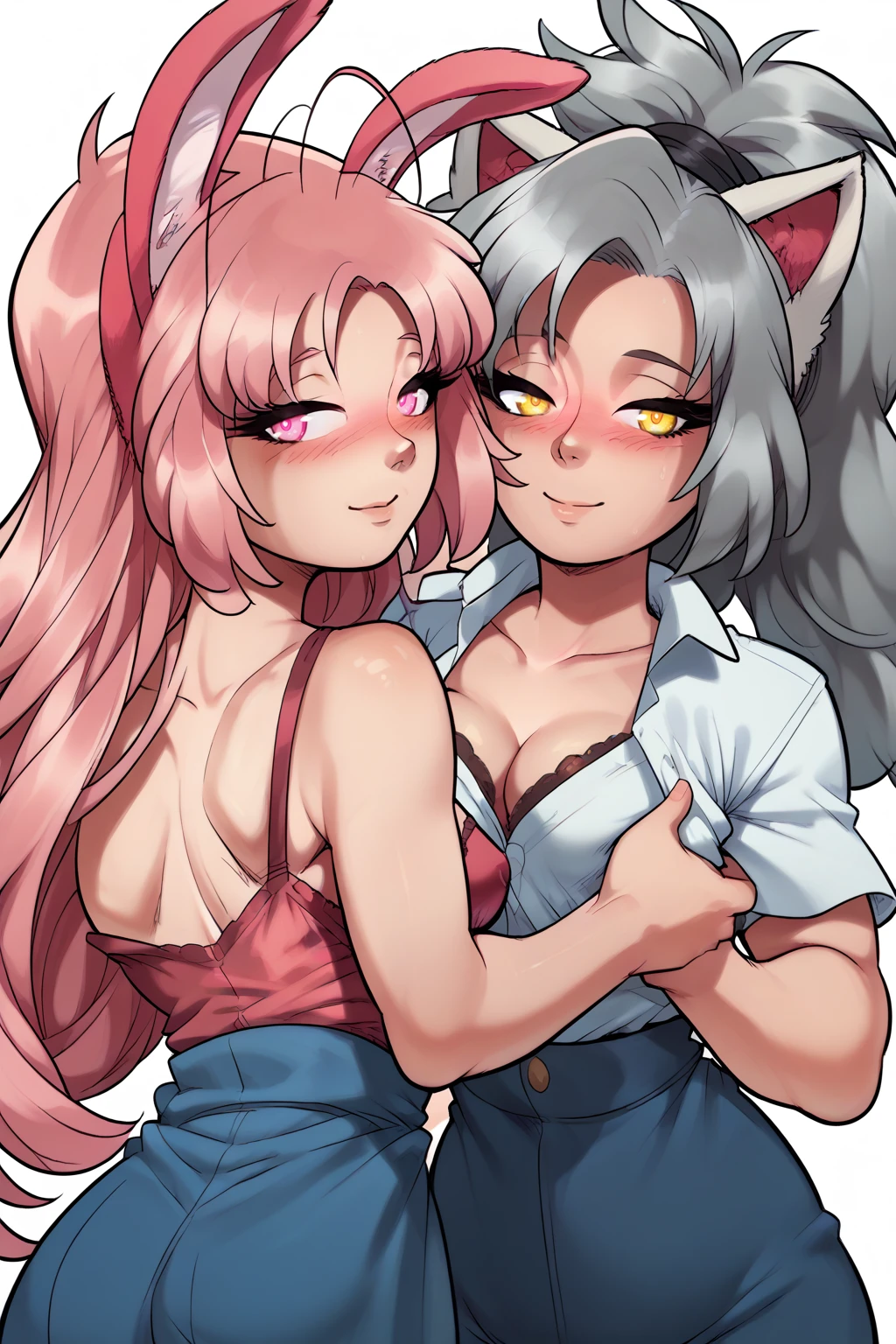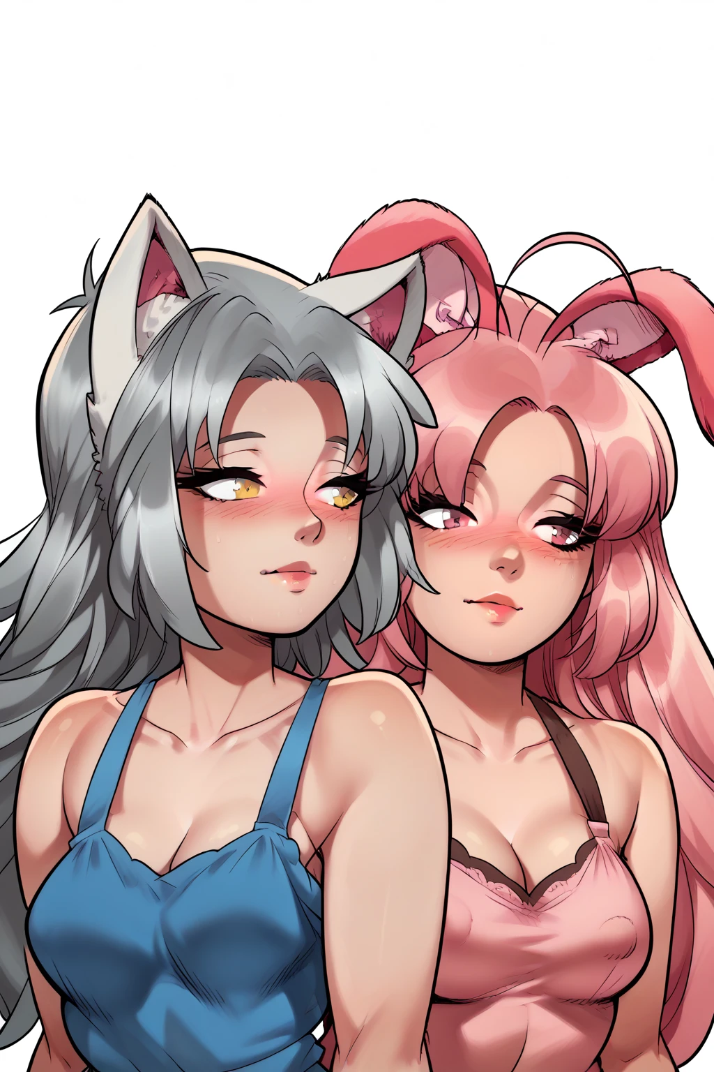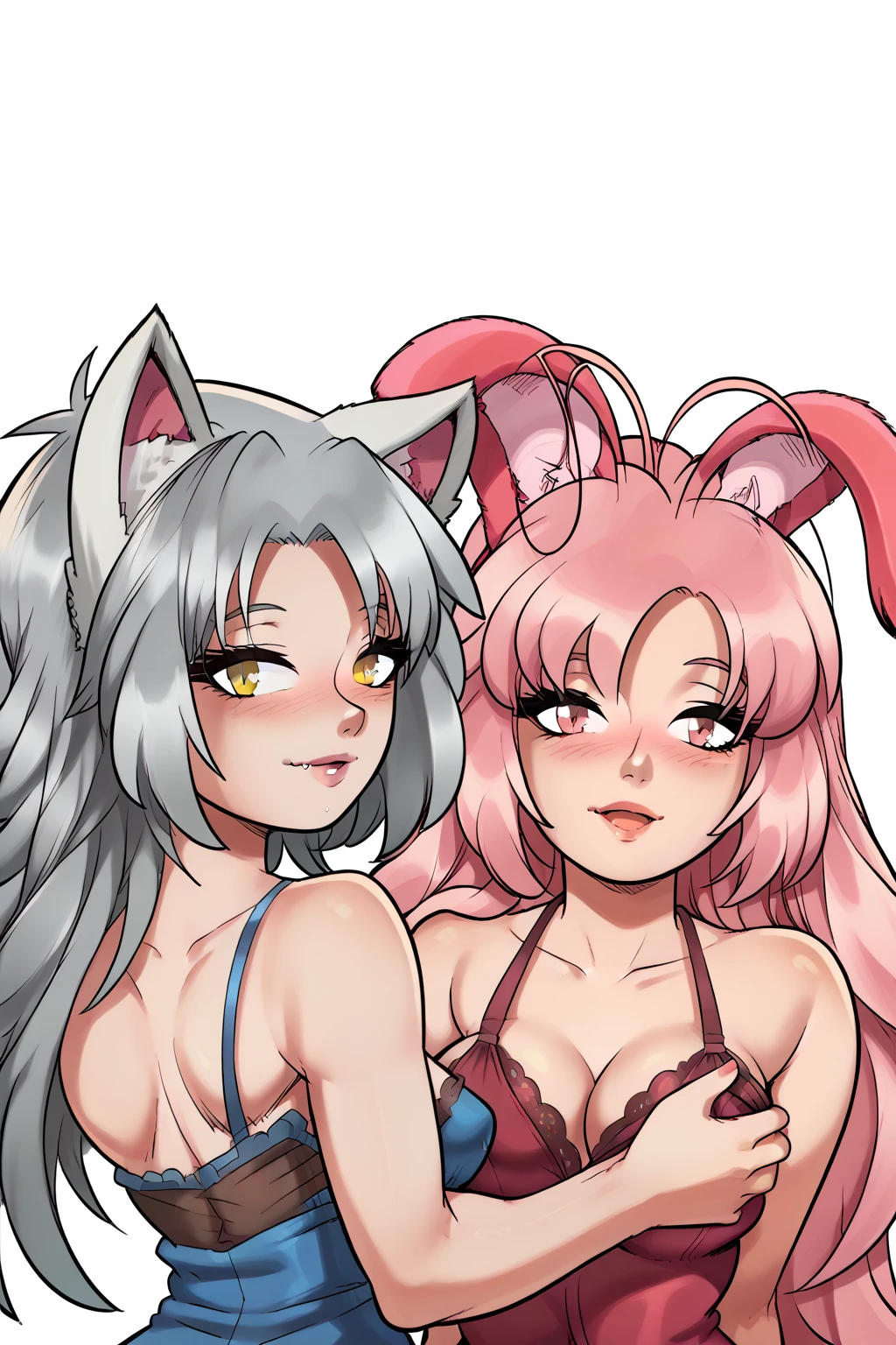 grey-haired wolf girl with golden eyes and medium breasts, pink-haired bunny girl with pink eyes and large breasts