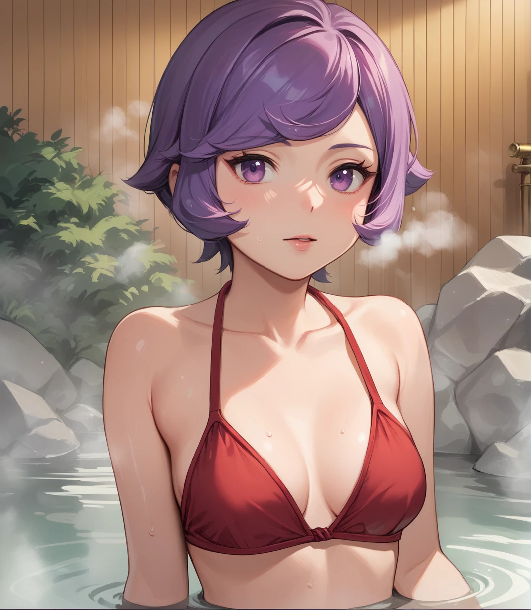 Character: 1girl, courtney (pokemon), purple hair, swept bangs, eyelashes, purple eyes, short hair, medium breasts