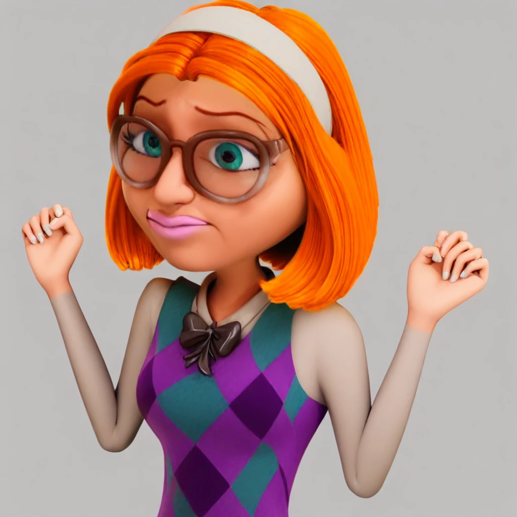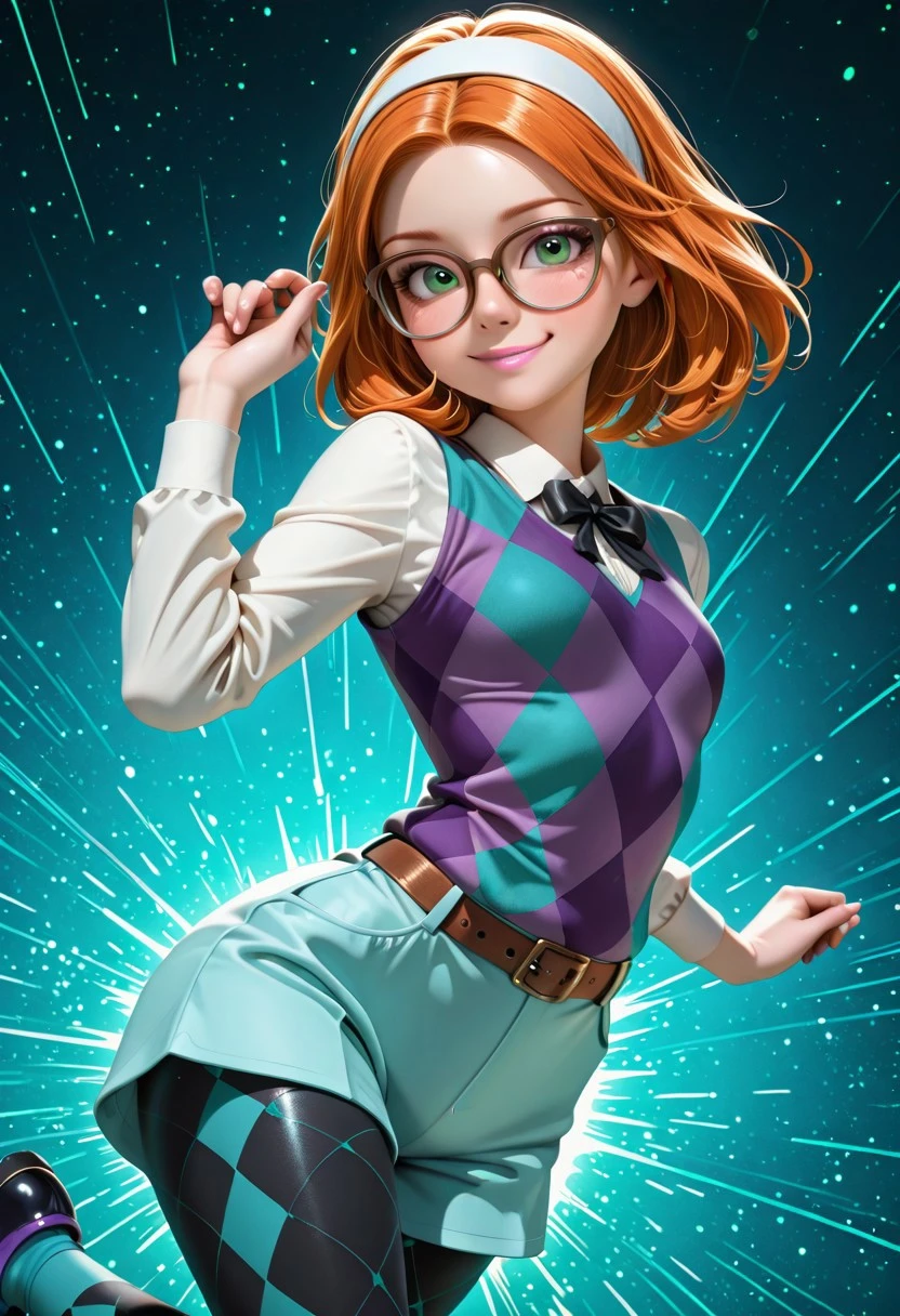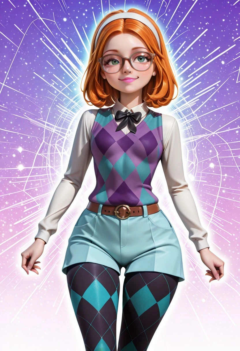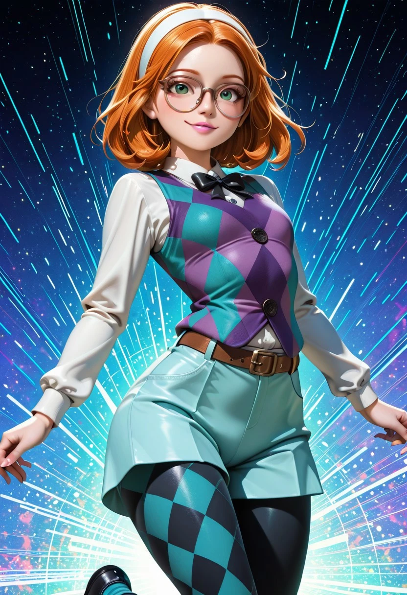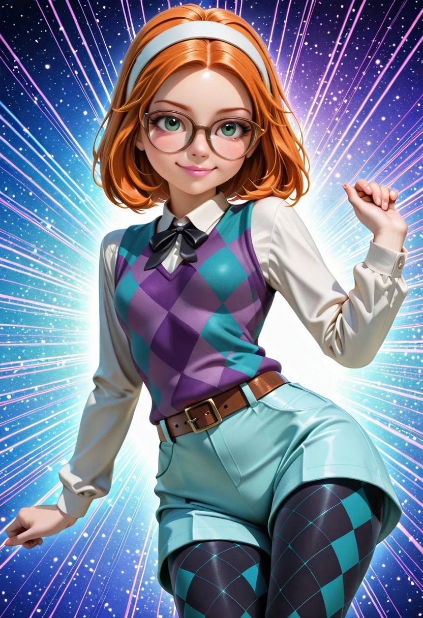 brown-frame eyewear, glasses, white headband, purple vest, teal argyle vest, white dress shirt with long sleeves, black ribbon, light-blue shorts, brown belt, black leggings, argyle leggings, light-blue socks, white sneakers with black laces,